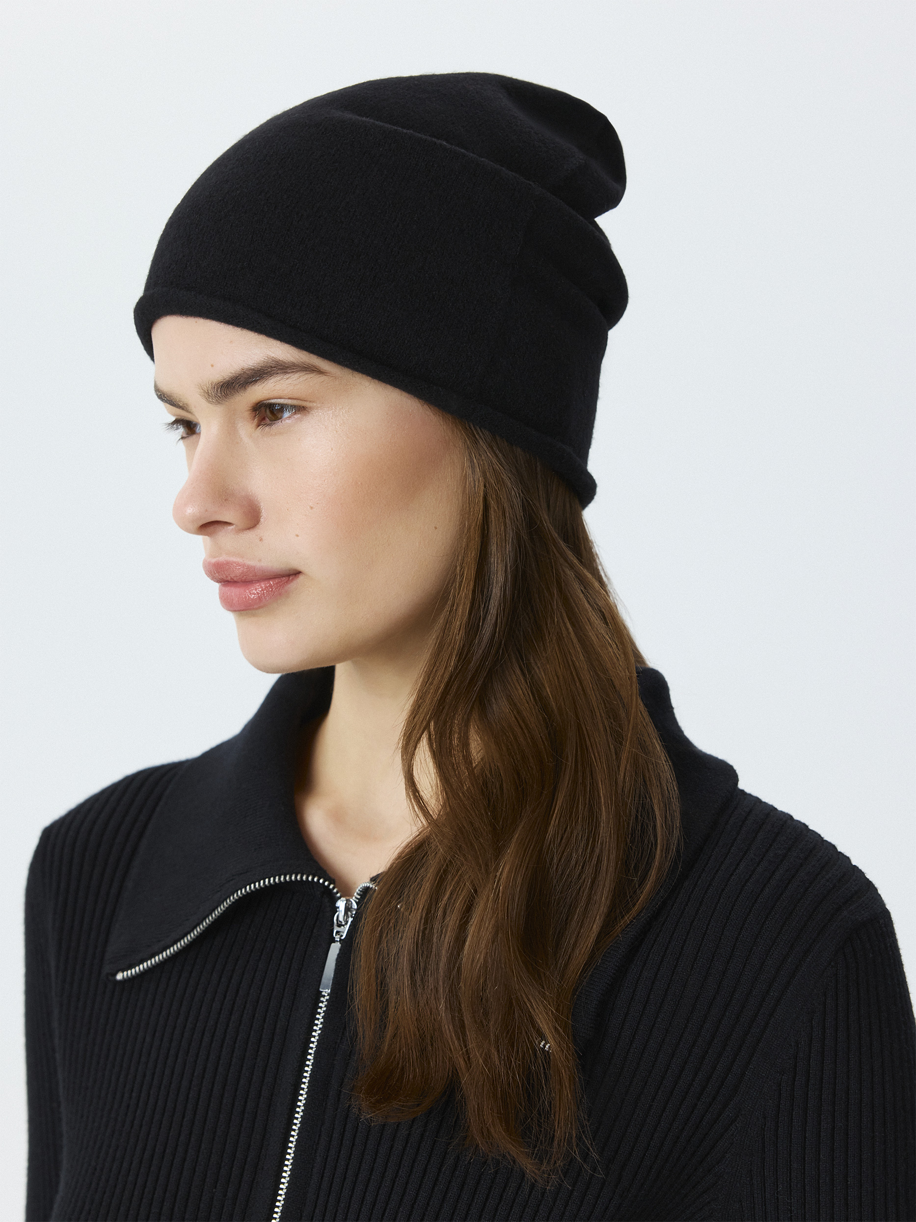 Базовая шапка в минималистичном дизайне - всегда актуальный аксессуар для холодного периода. Изделие связали в одну нить из мягкой мериносовой шерсти, которая хорошо сохраняет тепло и не колется. Собрать монохромный комплект можно с шарфом из такой же пряжи.
