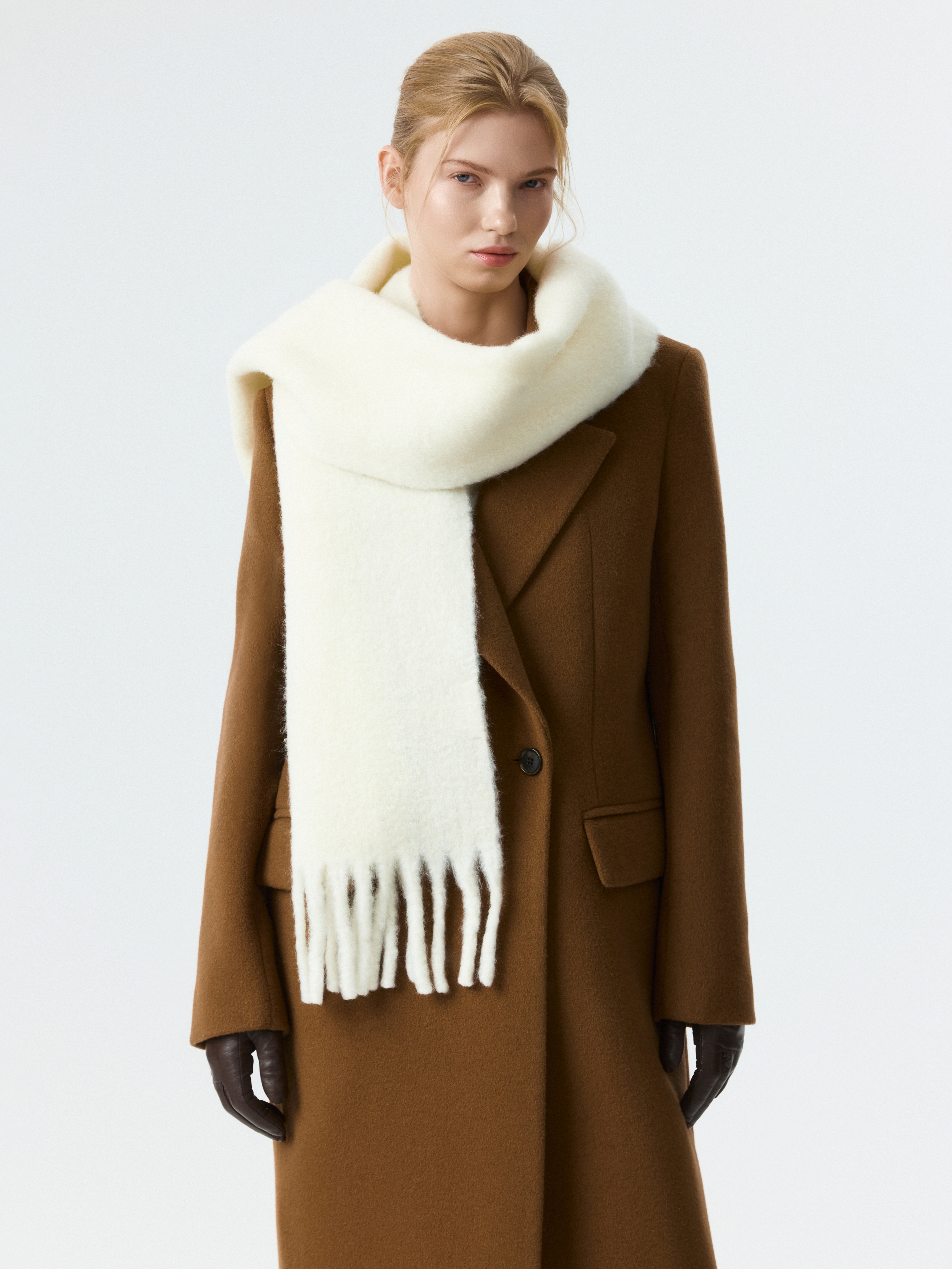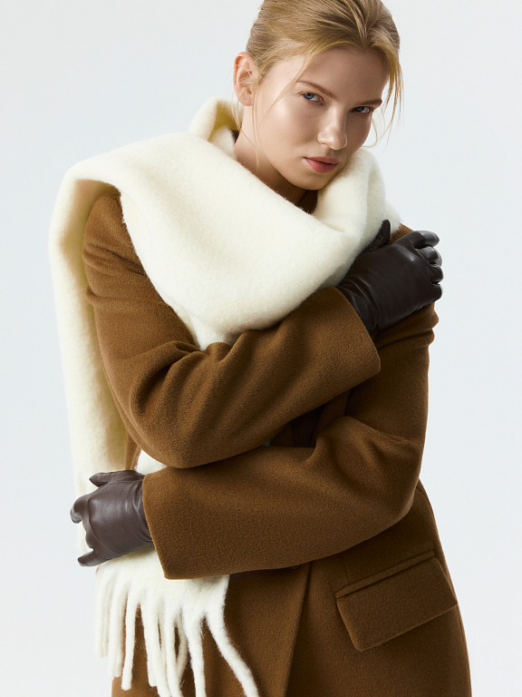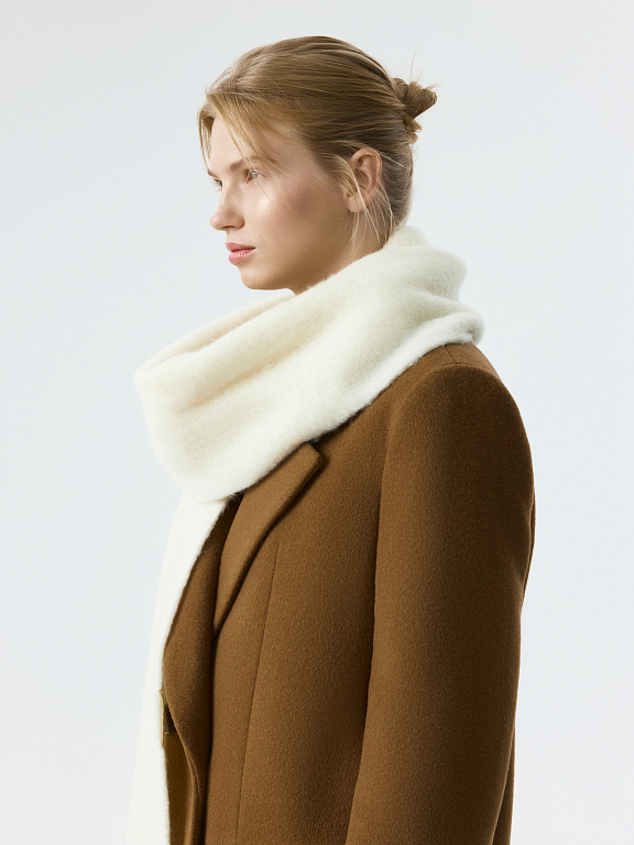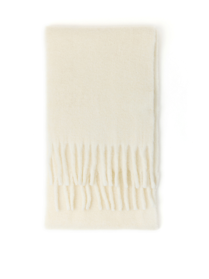 Вязаный шарф с бахромой согреет даже в самую холодную погоду. Его плотная вязка из пряжи с высоким содержанием шерсти создает баланс между теплом и стилем, даря ощущение комфорта. Длинный шарф будет отлично сочетаться с пальто или пуховиком.