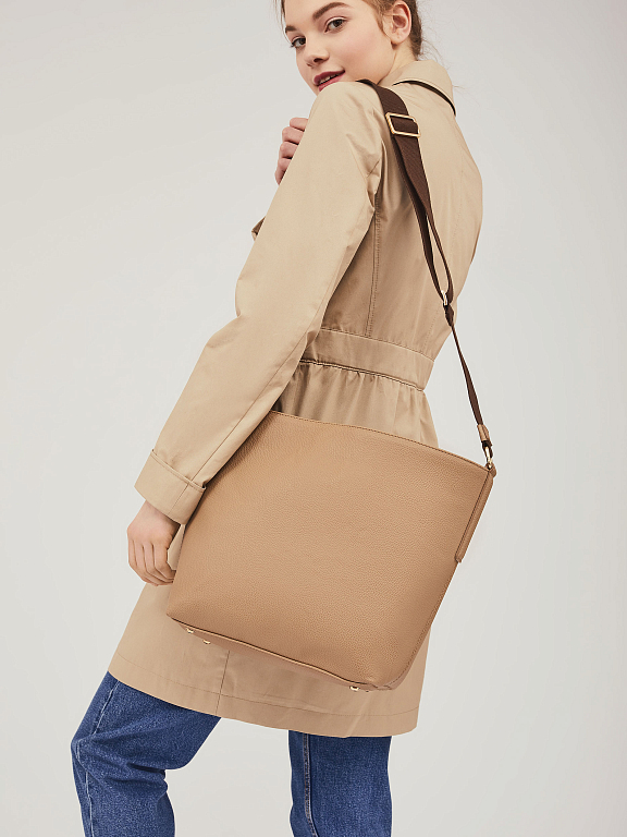 Сумка  формы "трапеция" с широким текстильным регулируемым ремнём.  Одно основное  вместительное отделение застёгивается на кнопку. Внутри карман на молнии и два открытых кармана.   Одно внешнее отделение на молнии.  Сумка стоит на четырёх пуклях(ножках). Внутреннее отделение с подкладкой. Размеры (длина x высота x ширина):  38 x 28 x 11 см