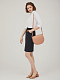Небольшая сумка из тисненой эко кожи с закруглённым низом и длинным регулируемым ремешком. Два отделения, одно из которых основное с небольшим карманом на молнии. Сумка стоит на четырёх пуклях(ножках). Внутреннее отделение с подкладкой. Размеры (длина x высота x ширина): 25 x 20 x 9 см