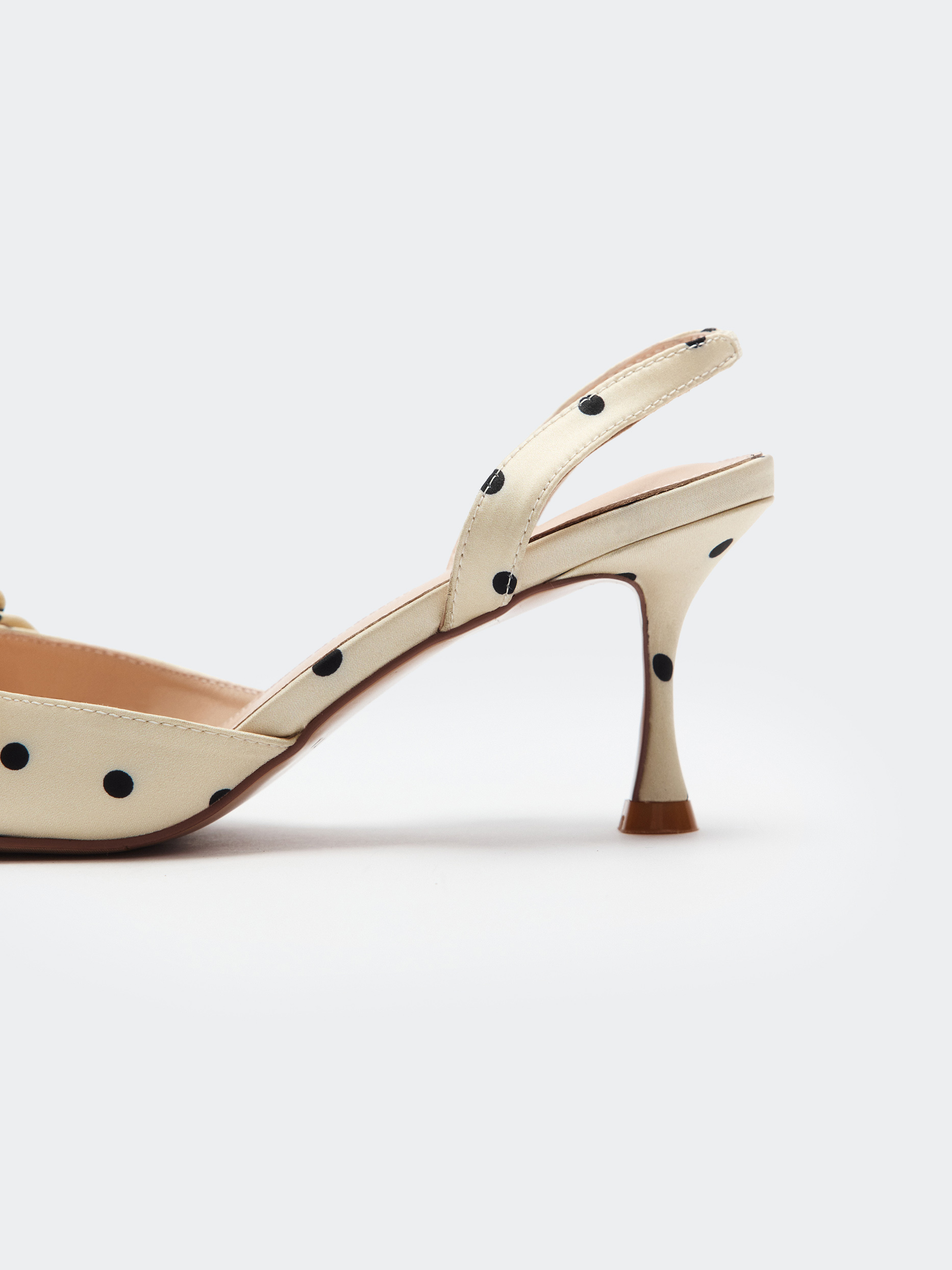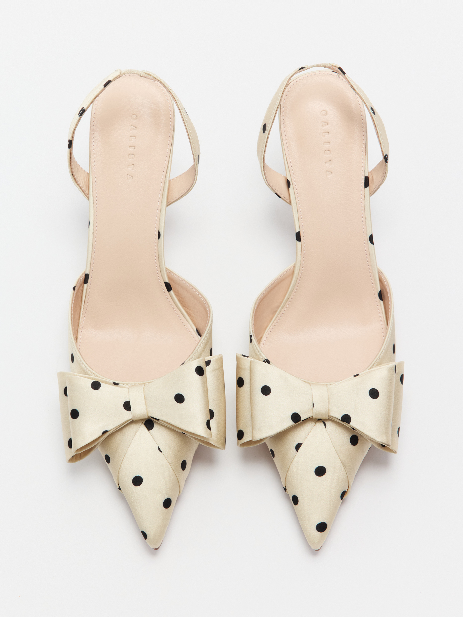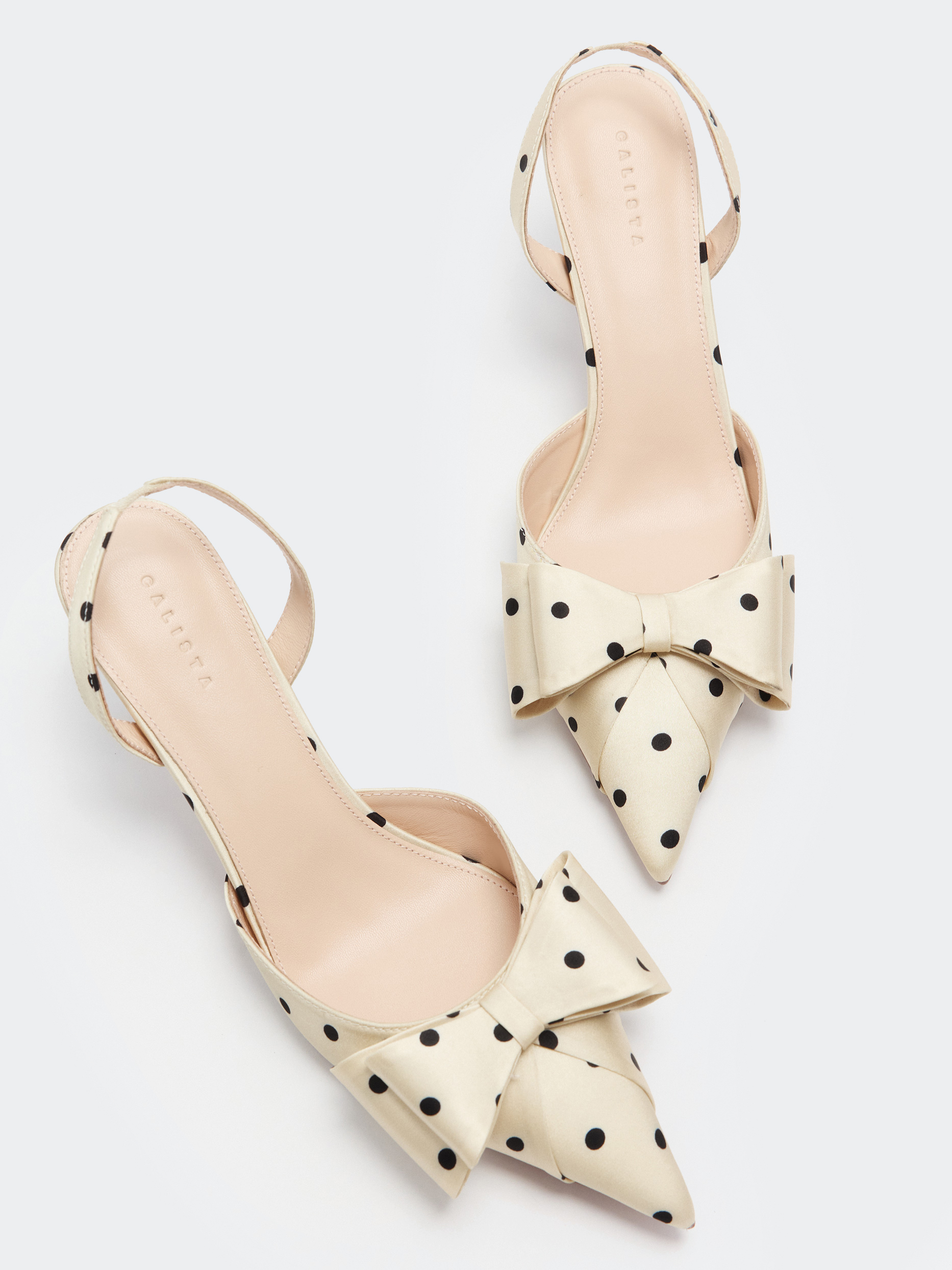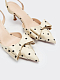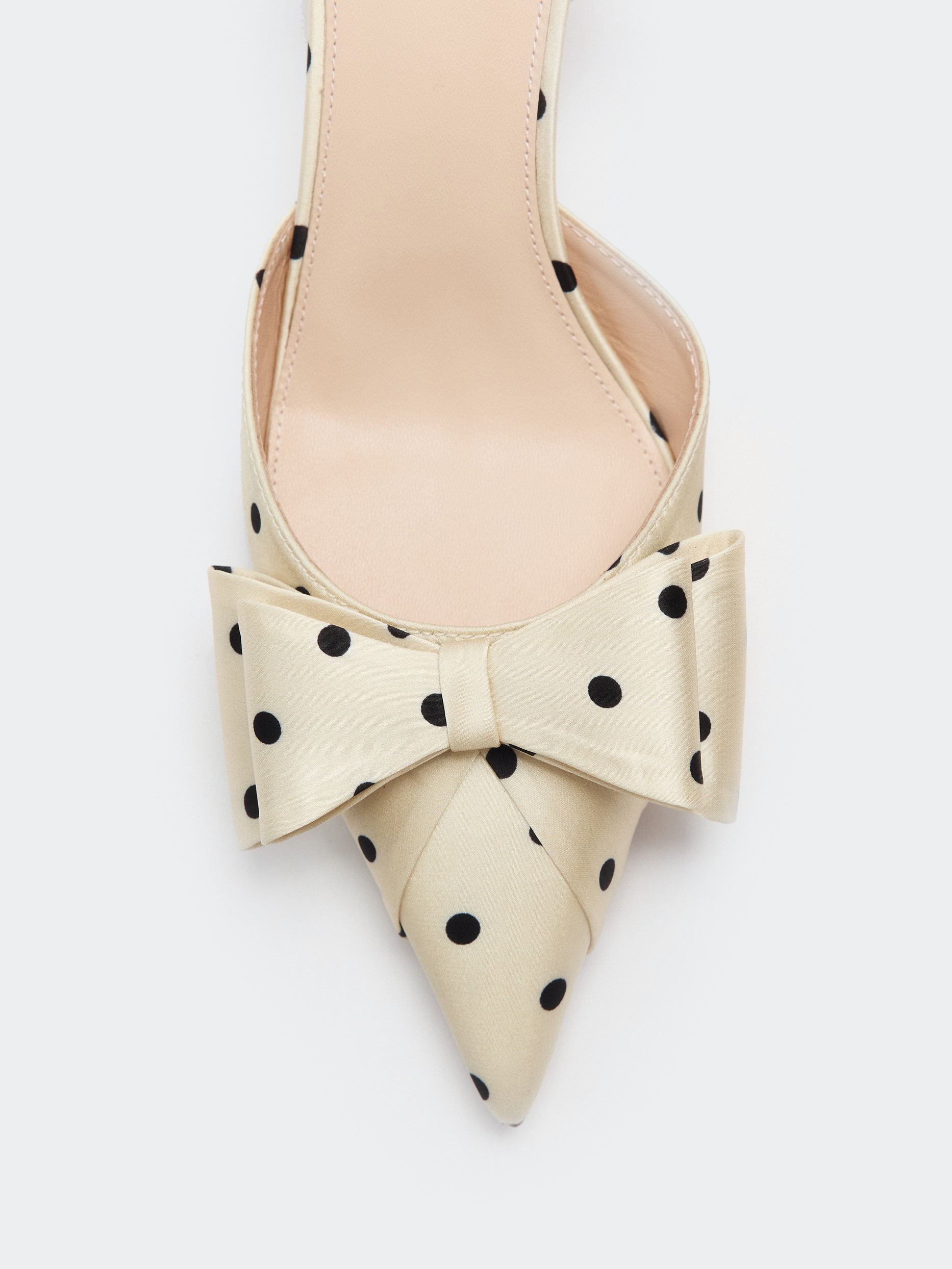 Принт в горох – один из трендов этого сезона. Изящные туфли с острым мысом выполнены из плотного гладкого сатина, внутренняя отделка из гладкой овечьей кожи дарит комфорт. Бант на союзке создает романтичный акцент.