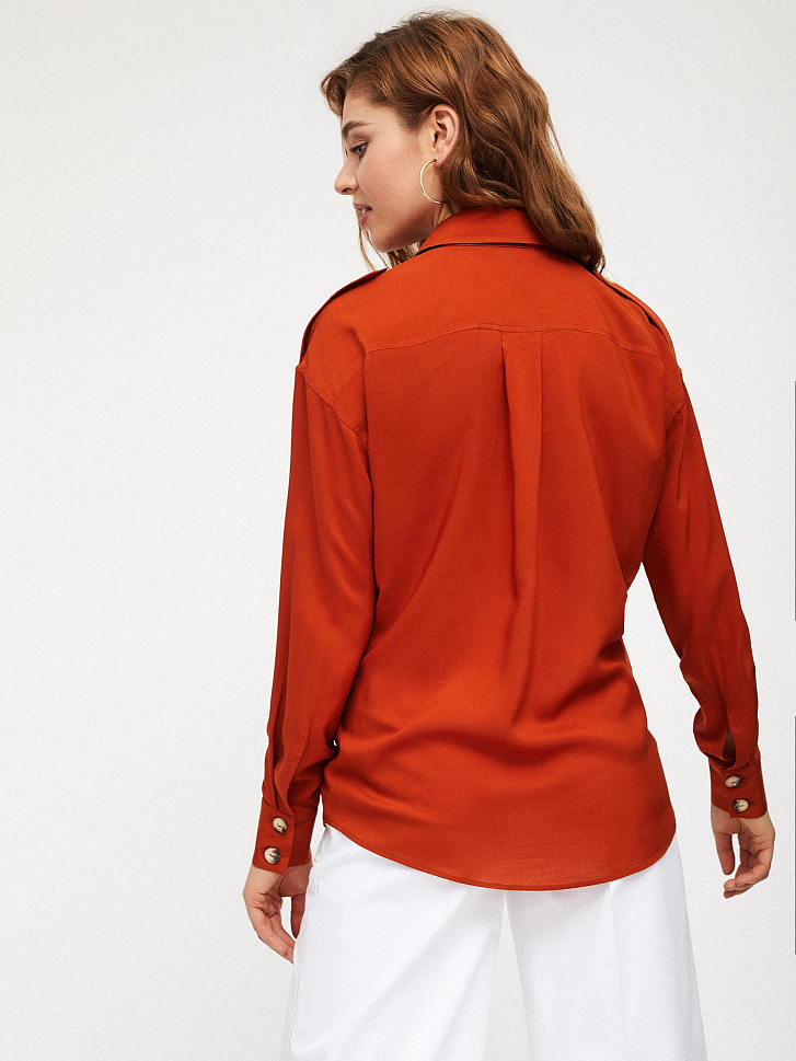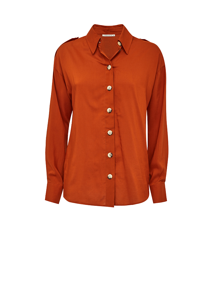 Свободная блуза рубашечного кроя, выполненная из 100% вискозы. Декоративные эполеты на пуговицах, классический отложной воротник. Застегивается на ряд контрастных пуговиц.
