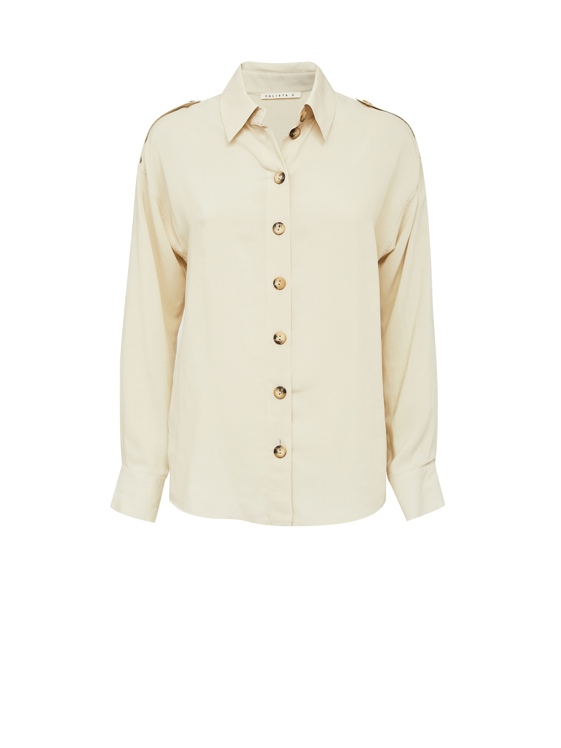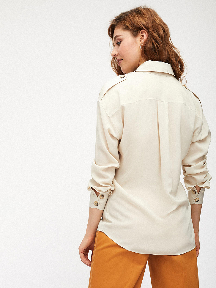 Свободная блуза рубашечного кроя, выполненная из 100% вискозы. Декоративные эполеты на пуговицах, классический отложной воротник. Застегивается на ряд контрастных пуговиц.