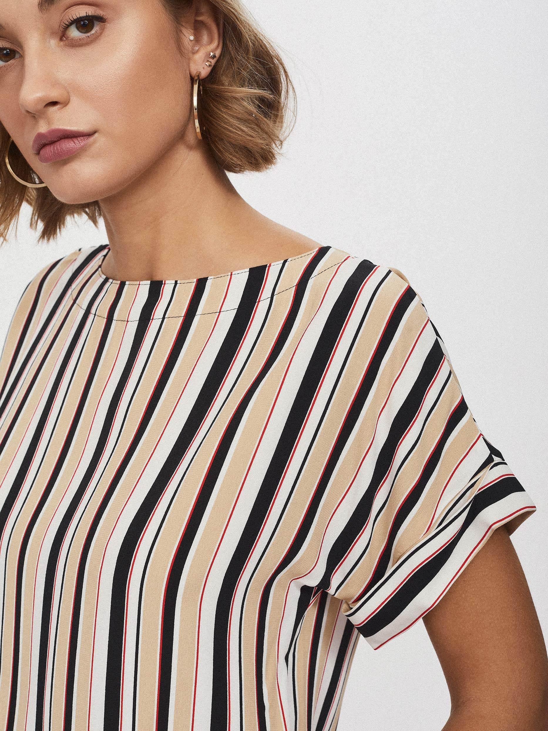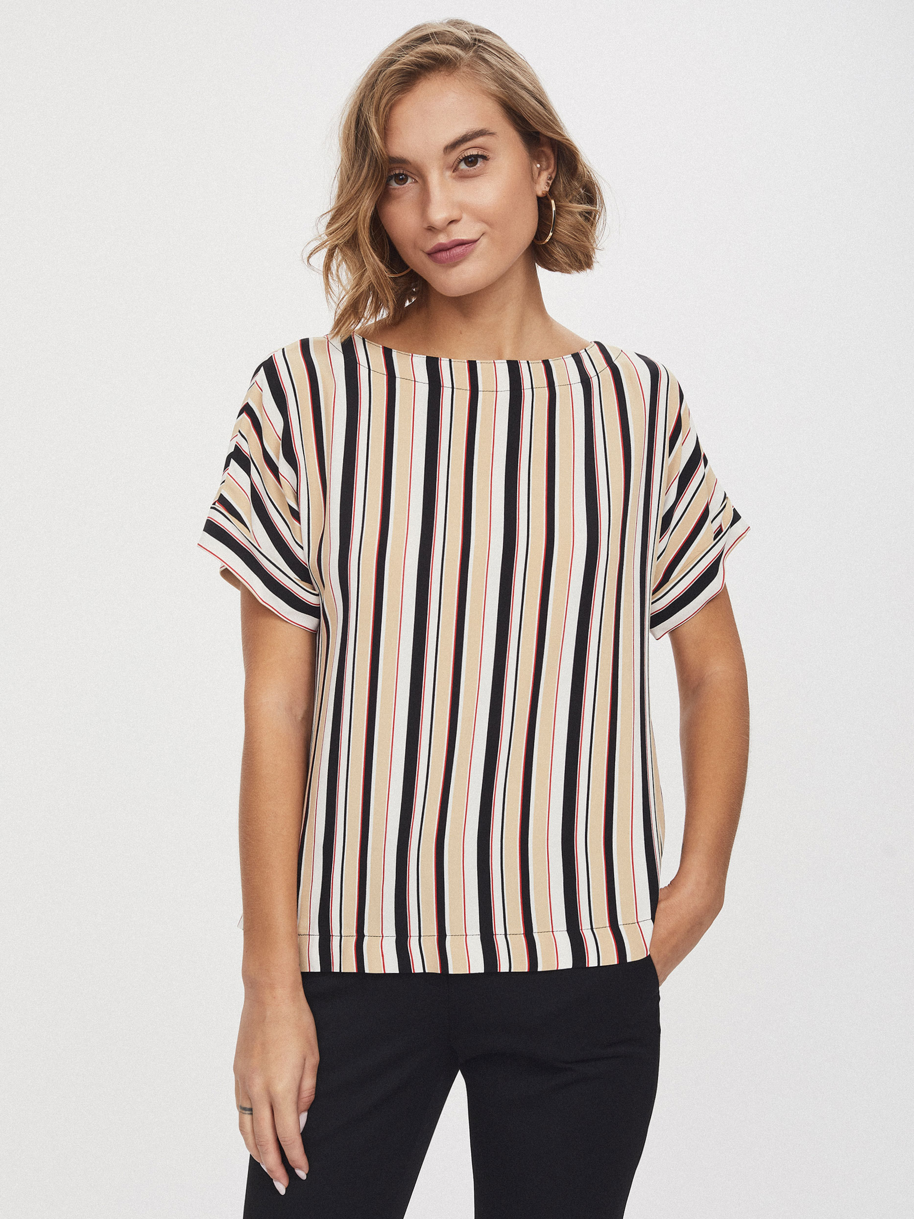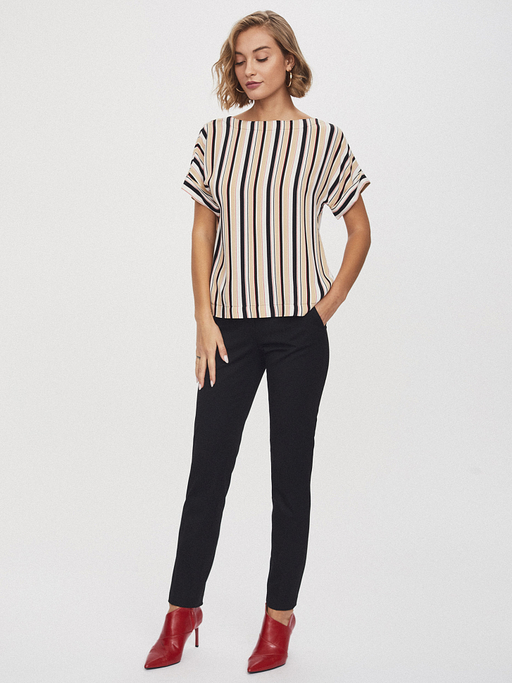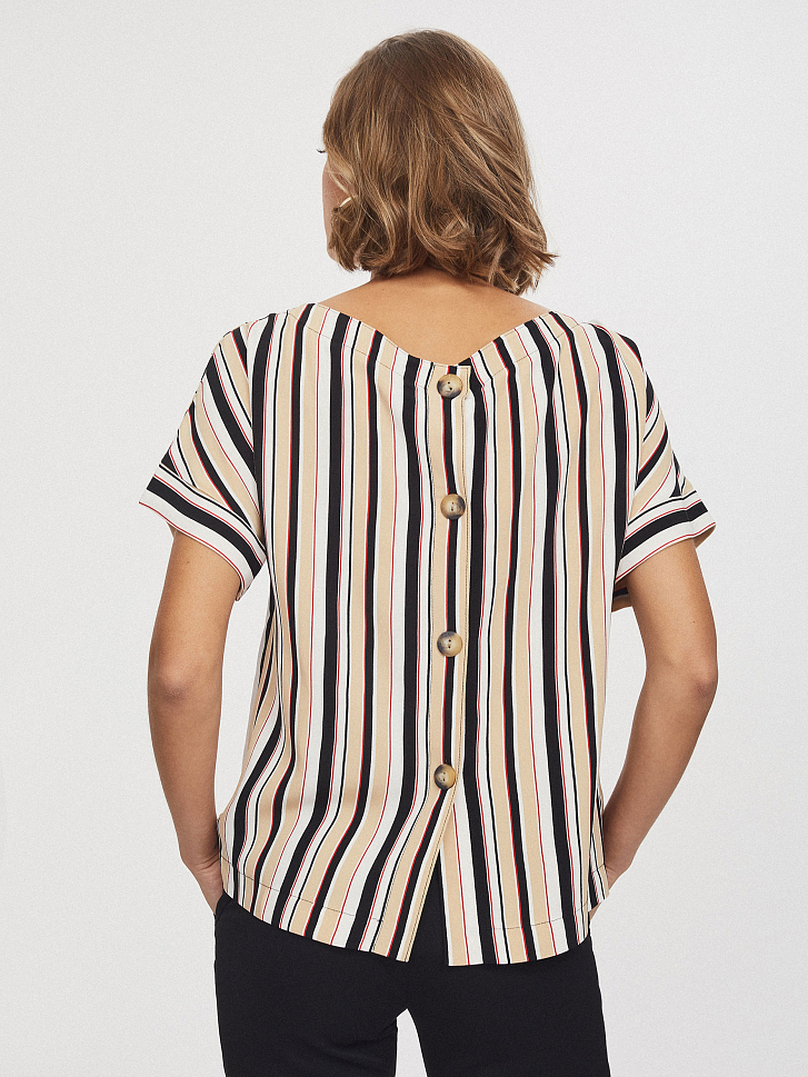 Блуза свободного кроя, выполненная из 100% вискозы. Округлый вырез, короткие рукава с отворотами. Застегивается на ряд крупных контрастных пуговиц по длине спины.