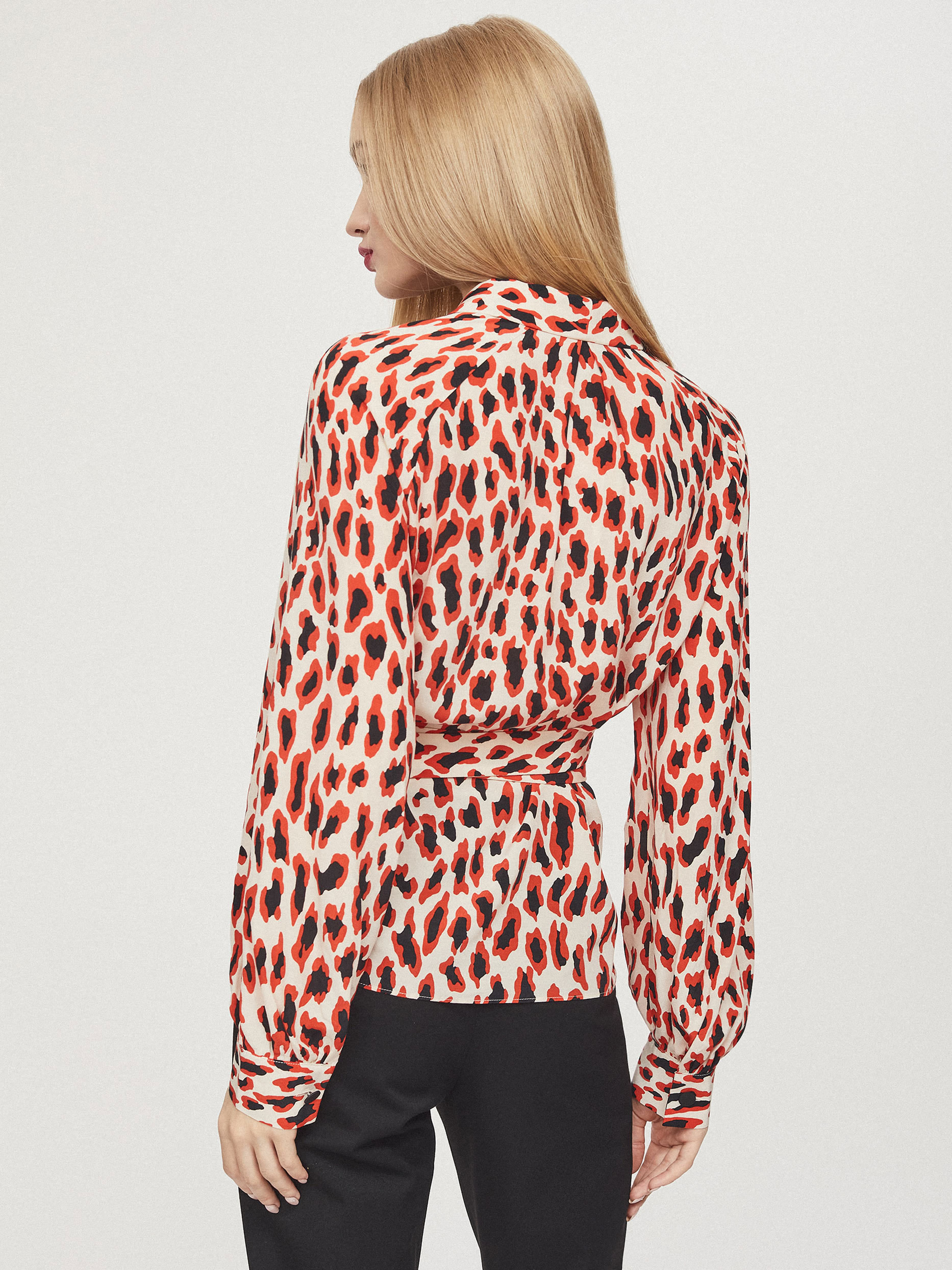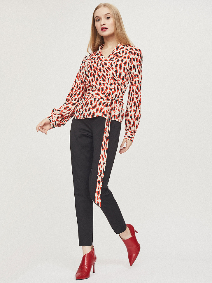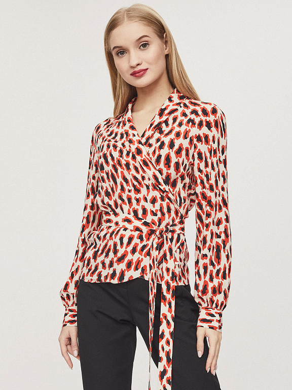 Блуза на запах, выполненная из 100% вискозы. Округлый отложной воротник, ленты.