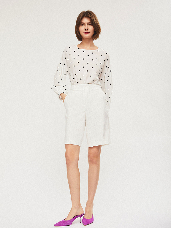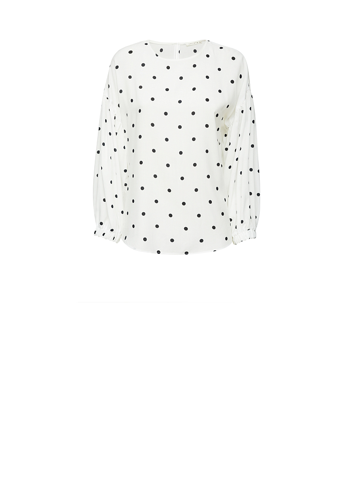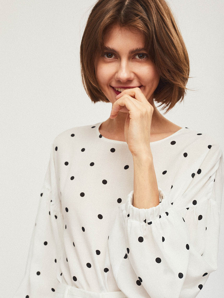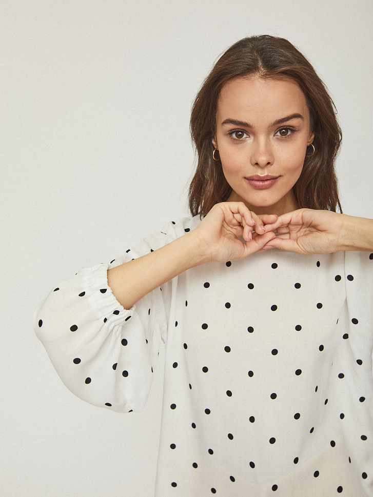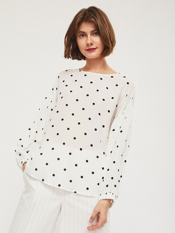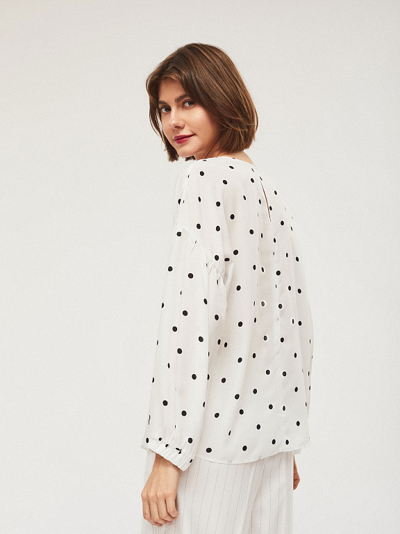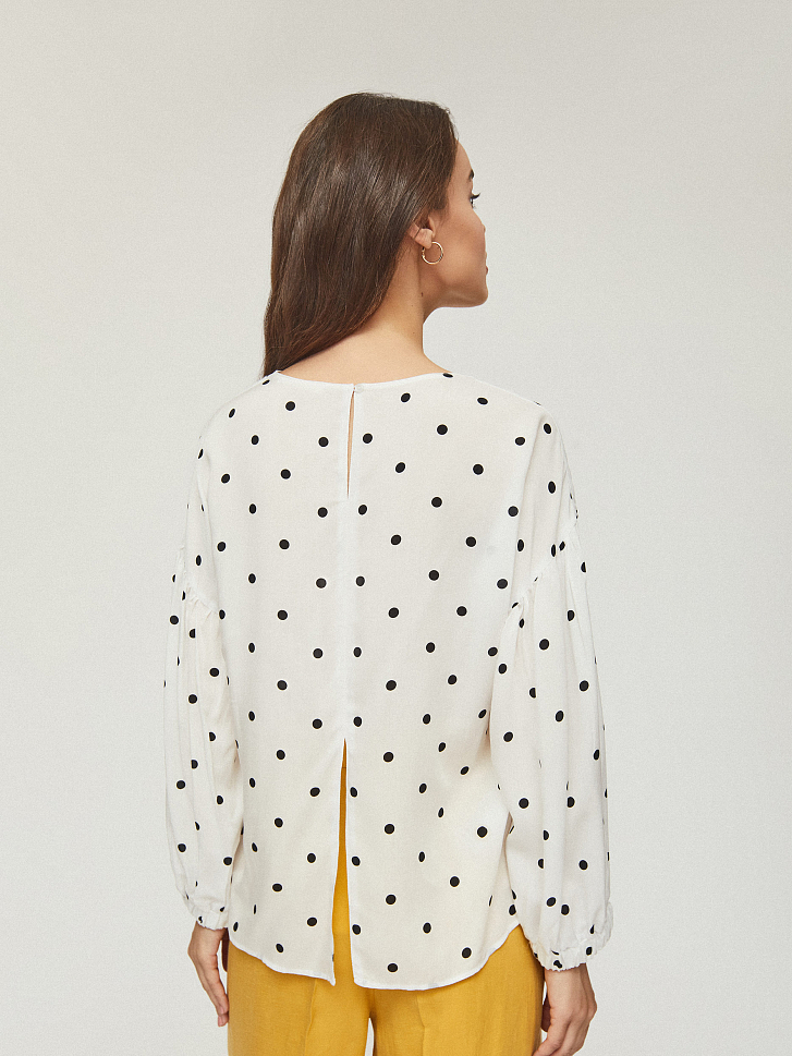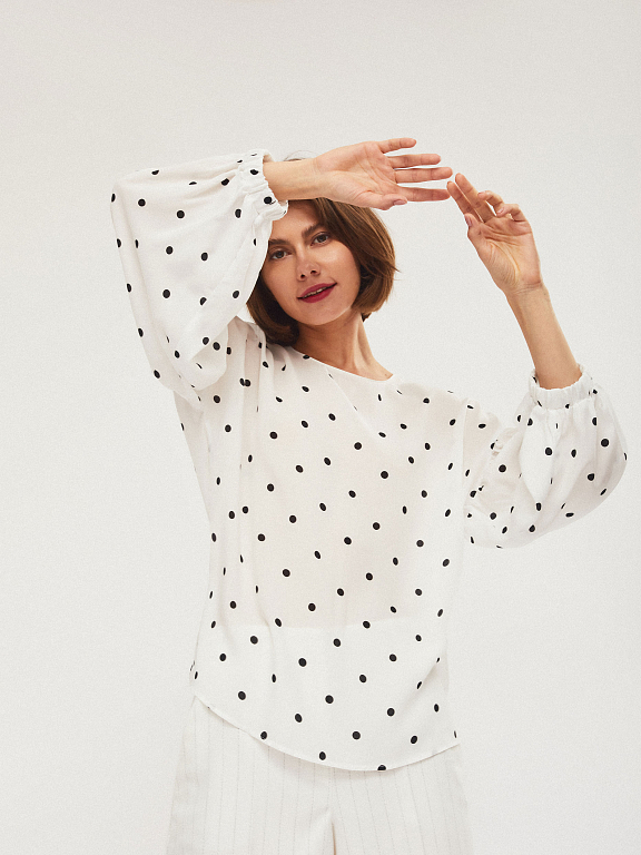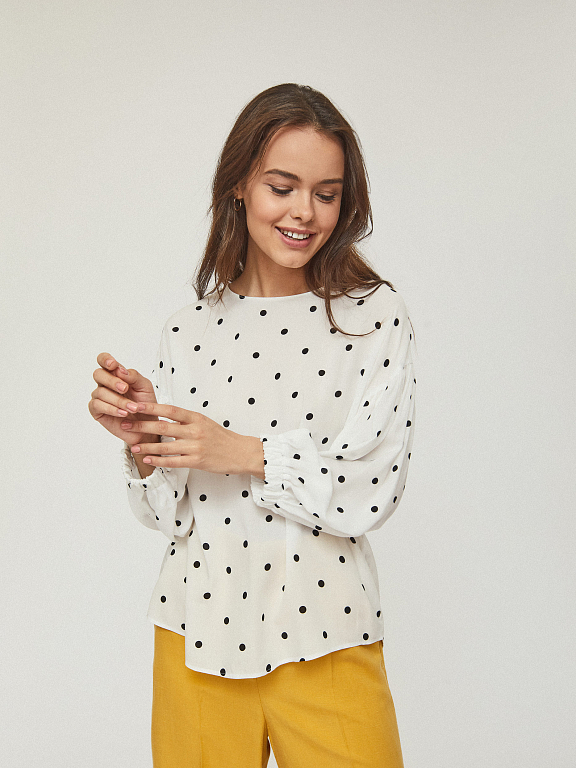 Свободная блуза с объемными рукавами на эластичных манжетах. Округлый вырез, застежка на небольшую пуговицу на спинке.