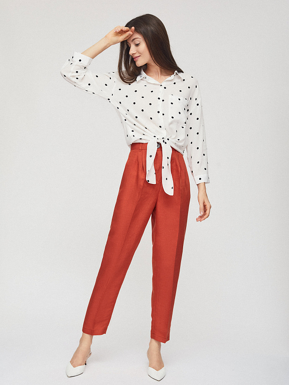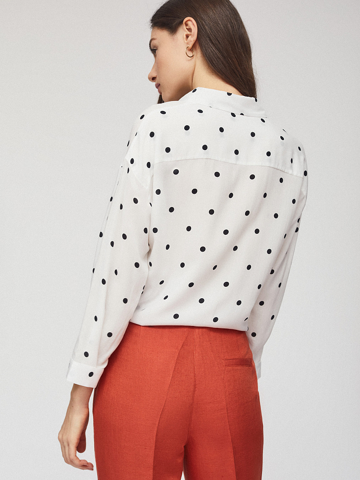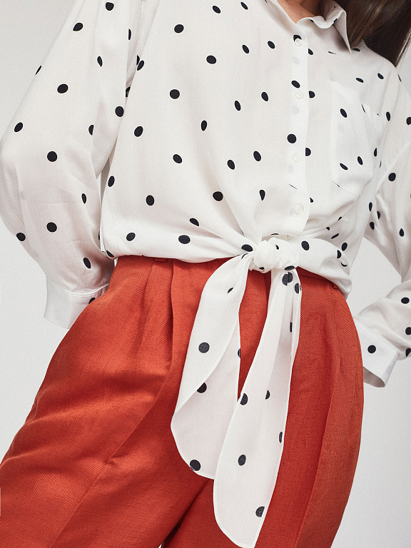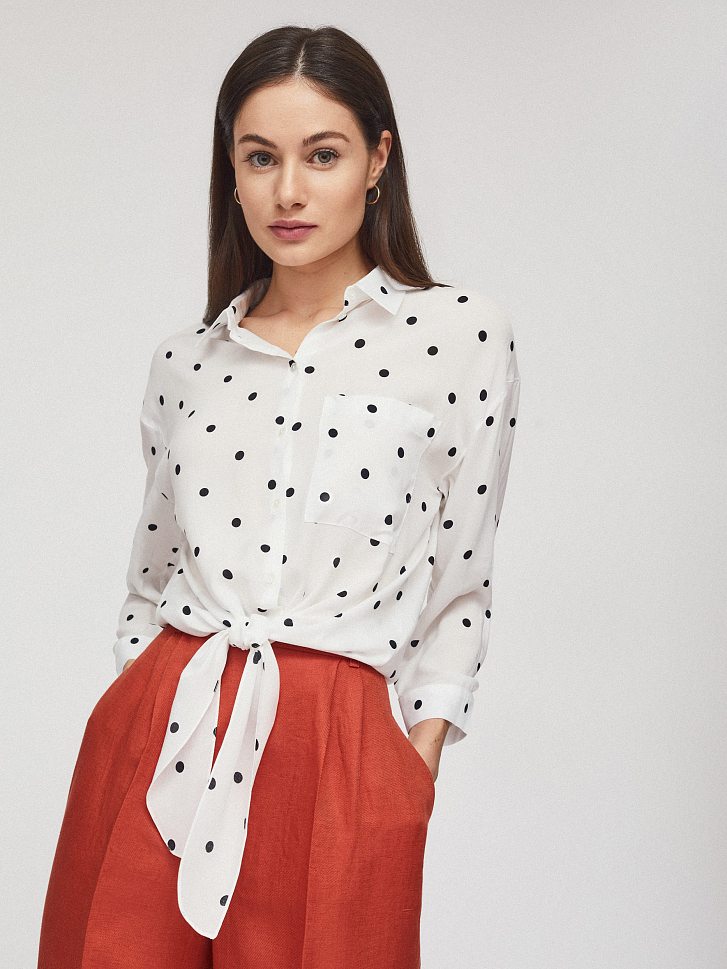 Свободная рубашка с декоративными завязками. Накладной нагрудный карман, спущенная линия плеч, классический отложной воротник.
