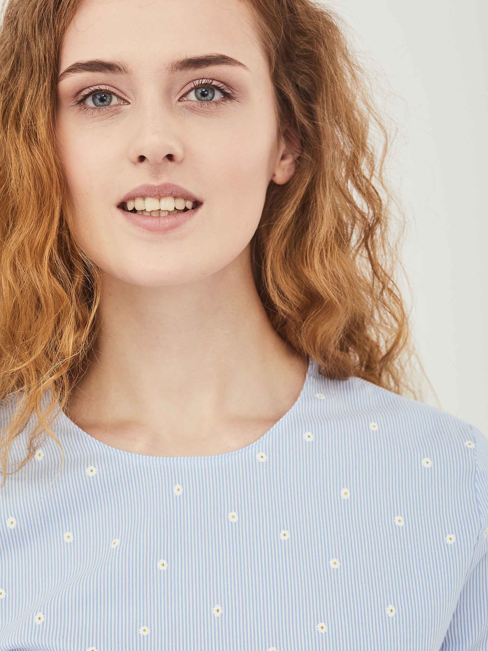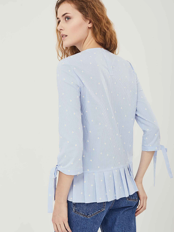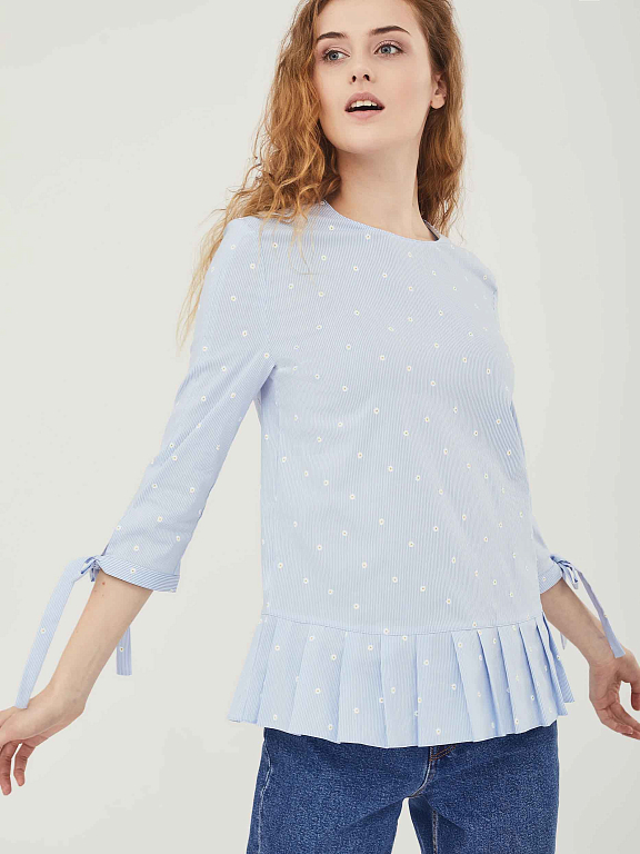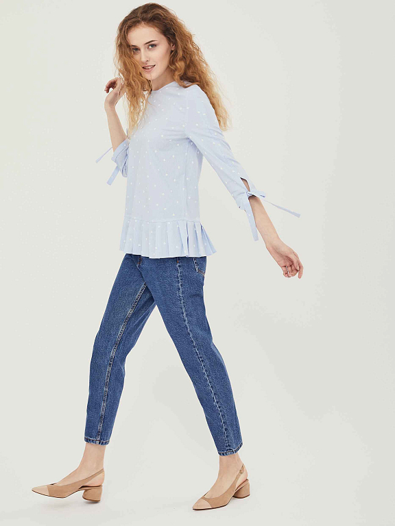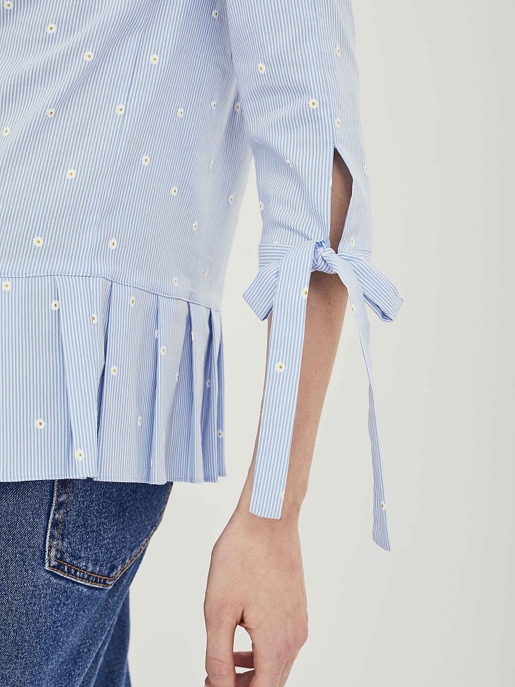 Хлопковый топ свободного кроя с заложенными складками по широкой оборке. Изделие  с рукавами три четверти с завязками на бант.  Застёжка на пуговицу сзади.  Изделие без подкладки.  Рост модели 177 см, размер 42 (российский)