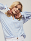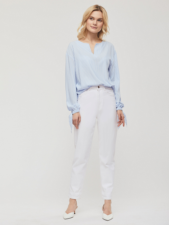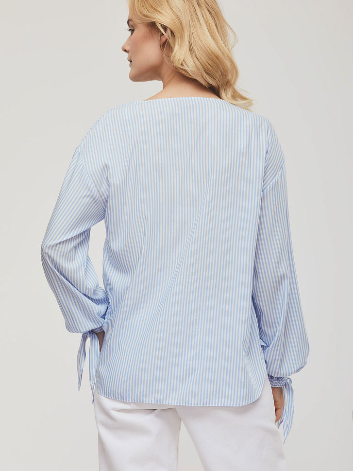 Блуза прямого силуэта в полоску с удлиненной спинкой. Изделие со спущенной линией плеча и вырезом горловины "замочная скважина". Широкие рукава, манжеты на резинке с завязками на бант. Скруглённый нижний край блузы. Изделие без подкладки. Рост модели 173 см, размер 42 (российский). Плотность ткани: 91 г/м2