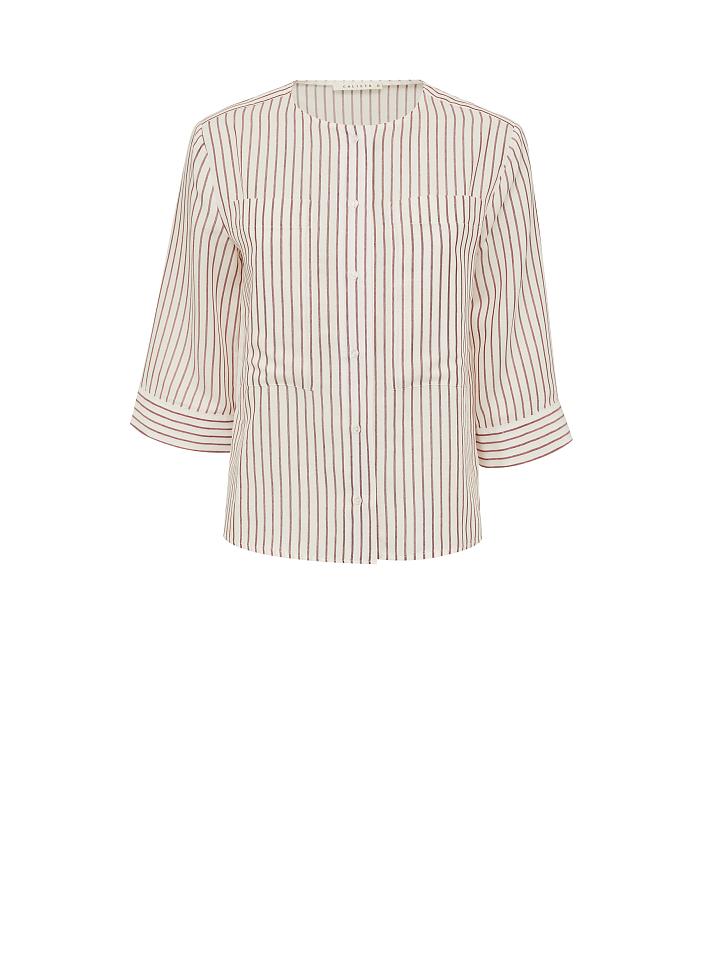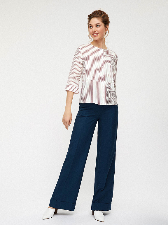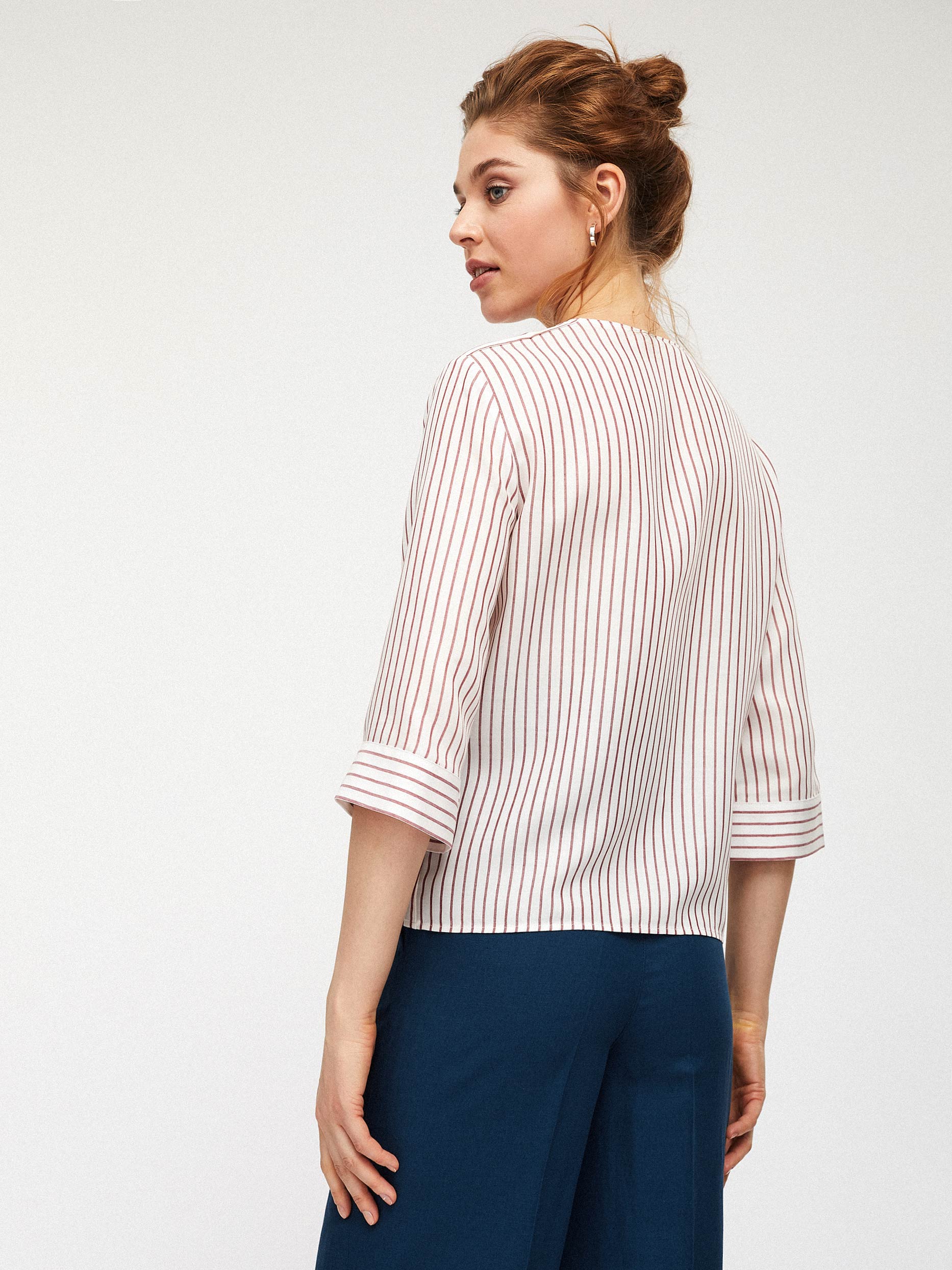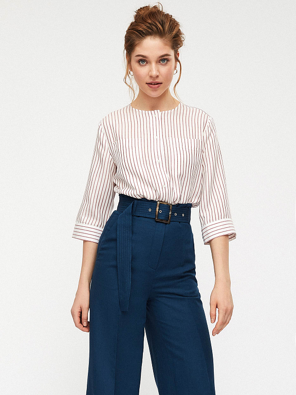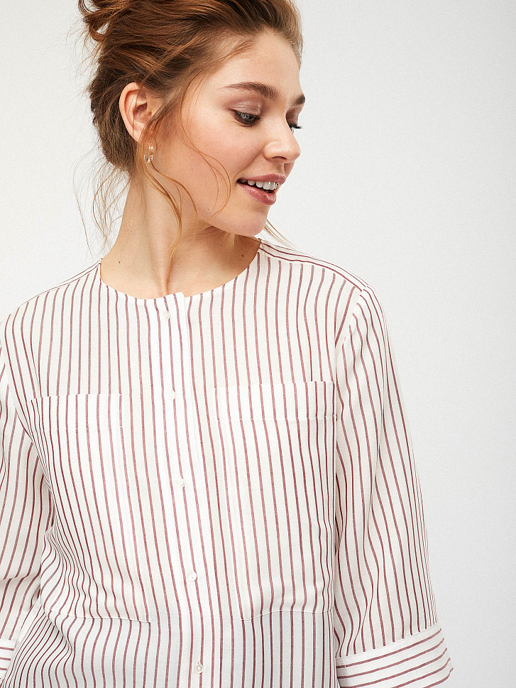 Блуза прямого силуэта с накладными нагрудными карманами, округлым вырезом, рукавами длины ¾ и застежкой на ряд небольших пуговиц.
