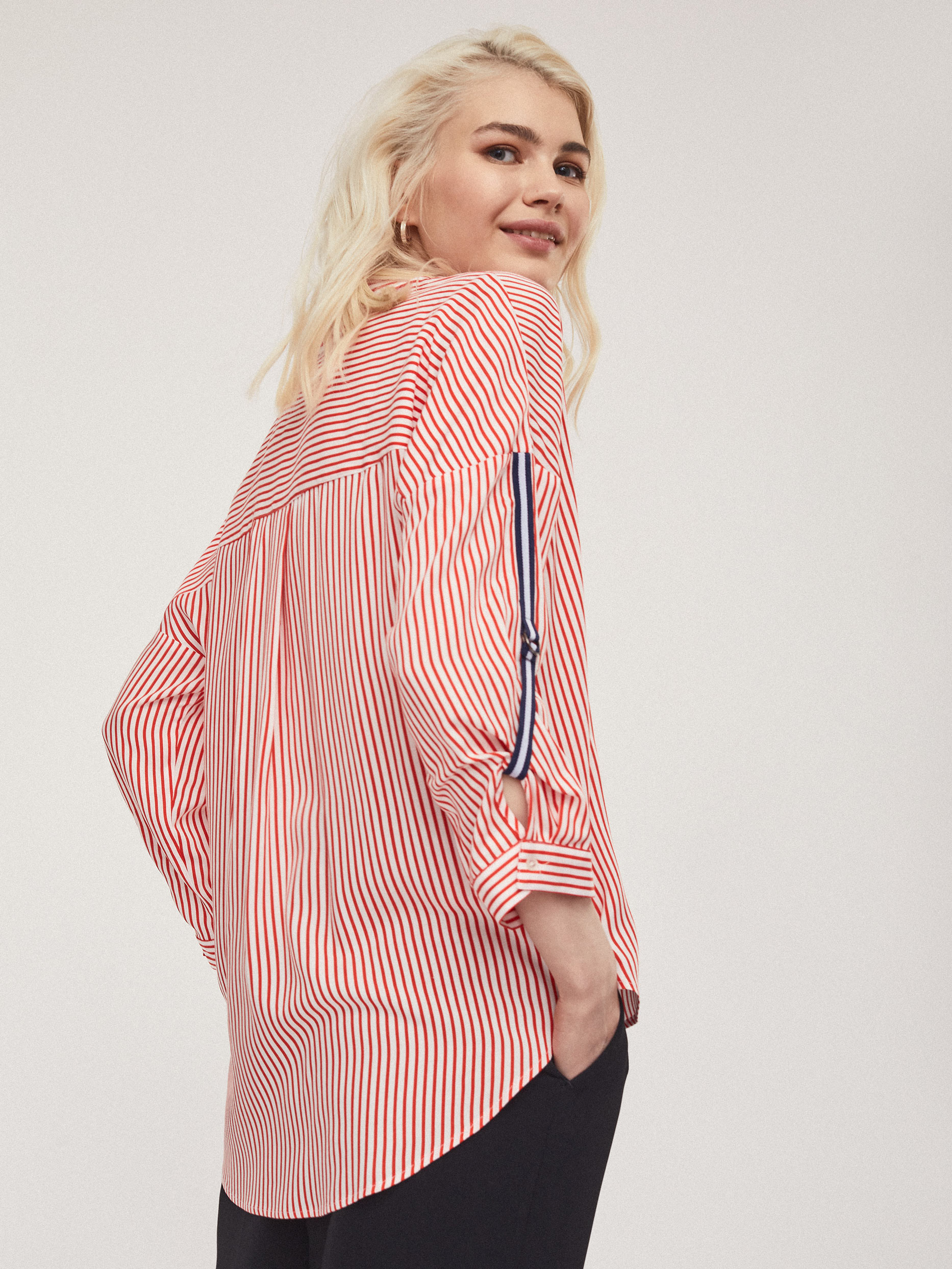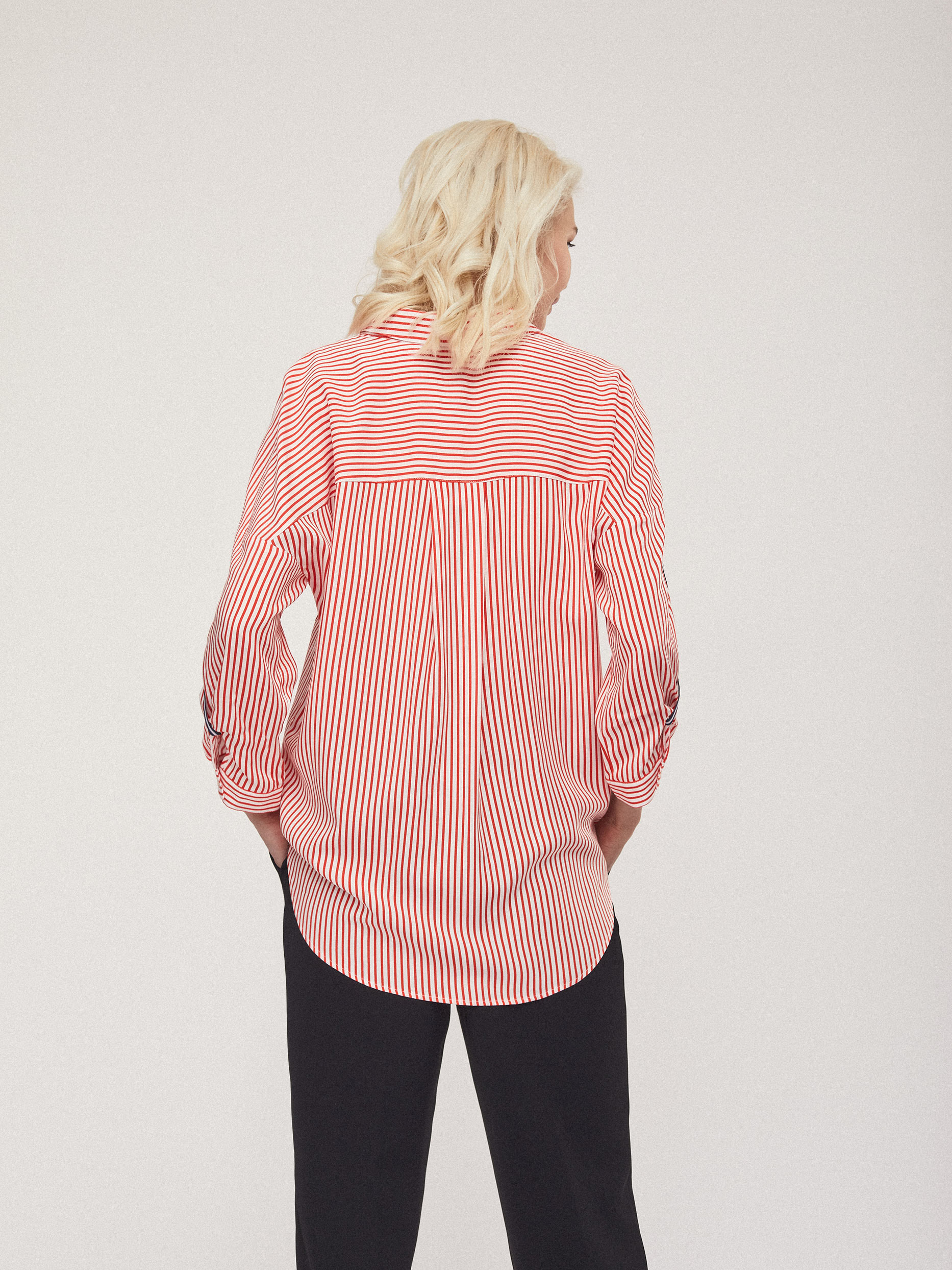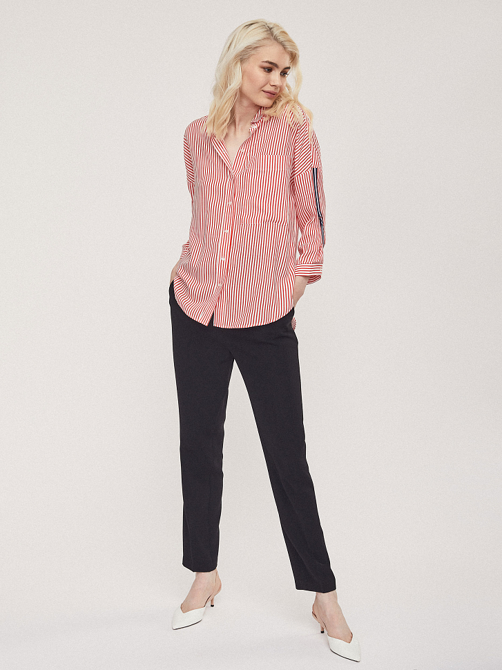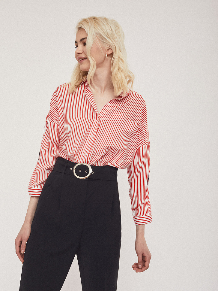 Рубашка прямого кроя с накладным нагрудным карманом. Рукава с отворотами на хлястиках с металлической фурнитурой.