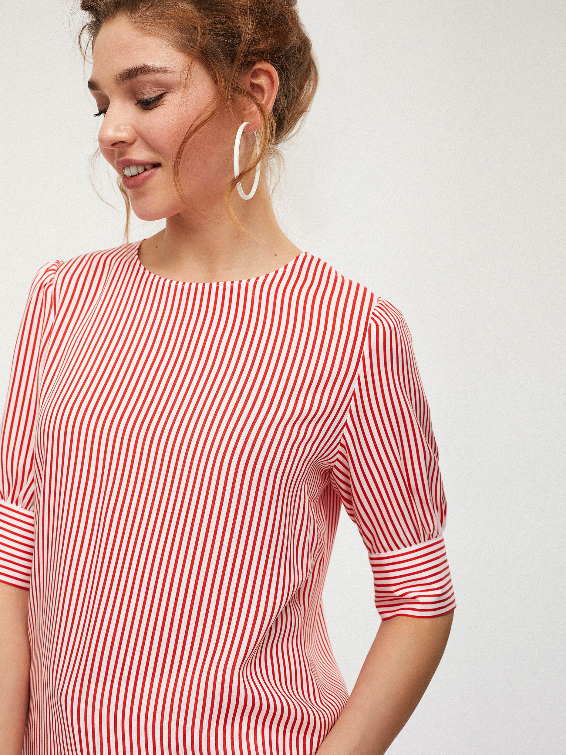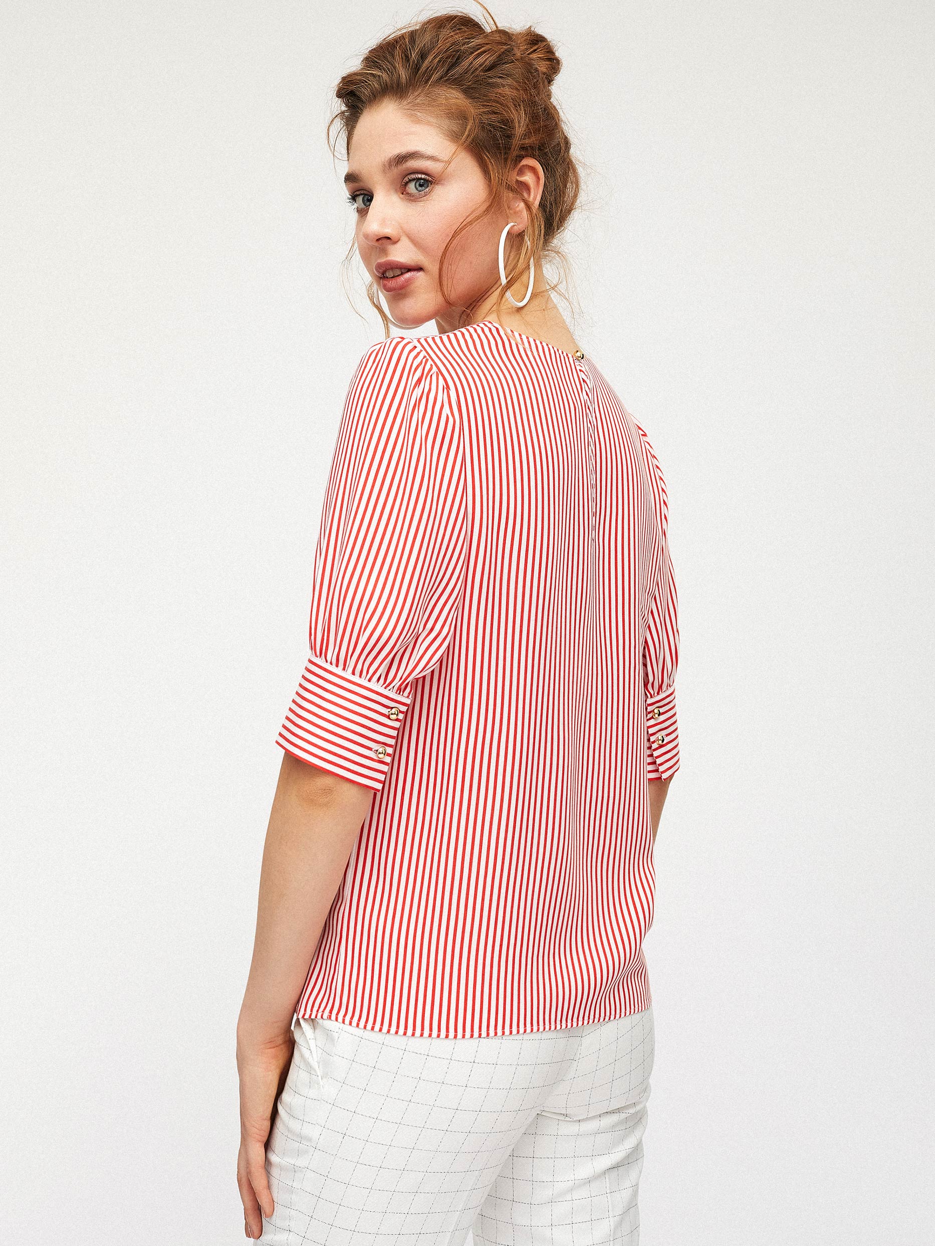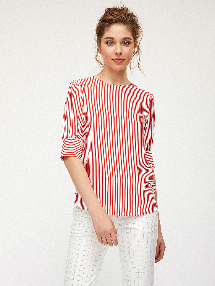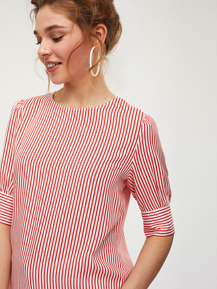 Блуза прямого кроя, выполненная из 100% вискозы. Округлый вырез, укороченные объемные рукава с пуговицами.