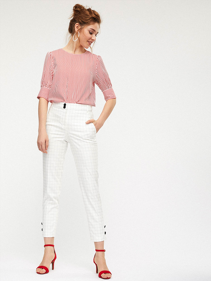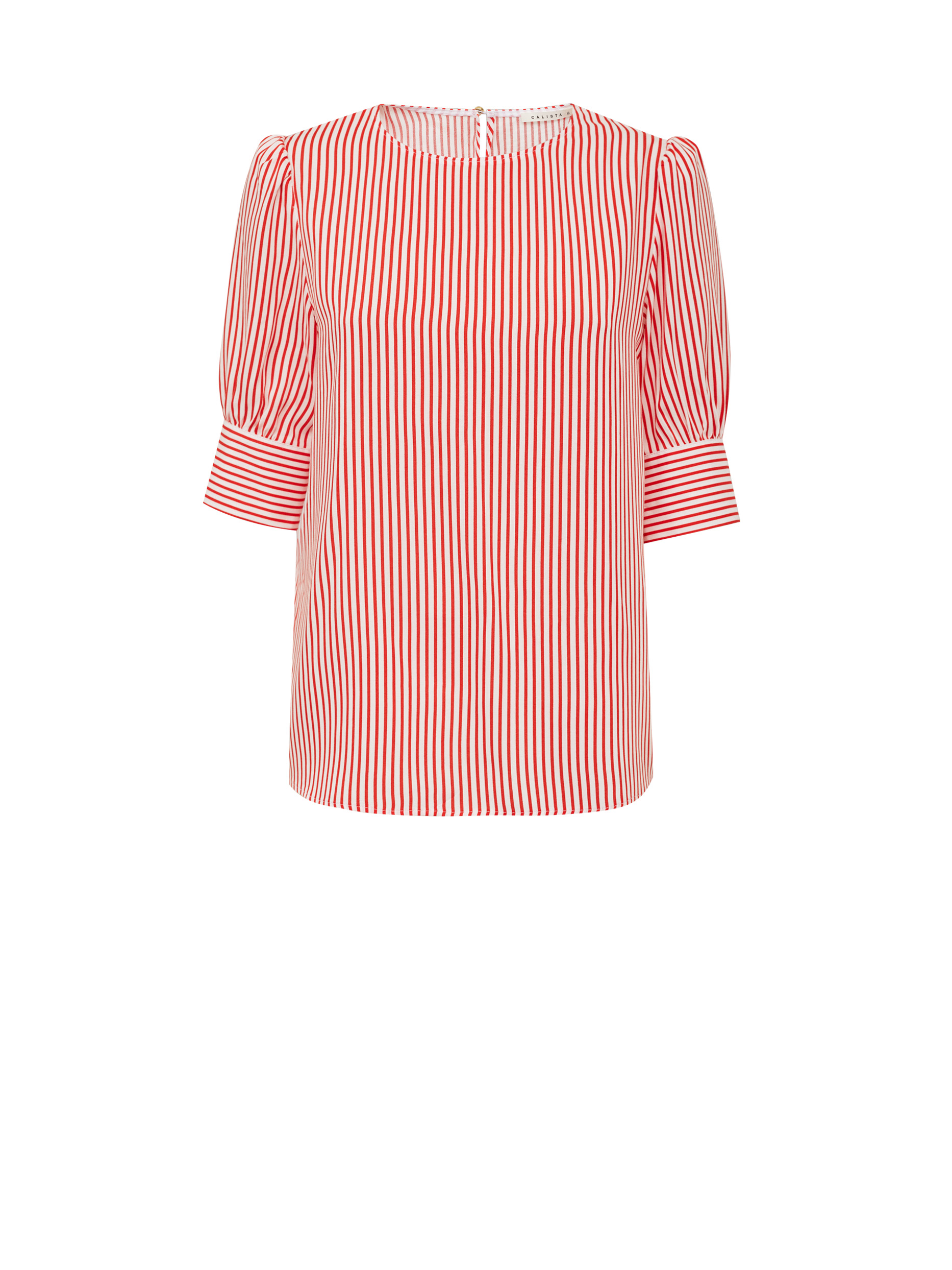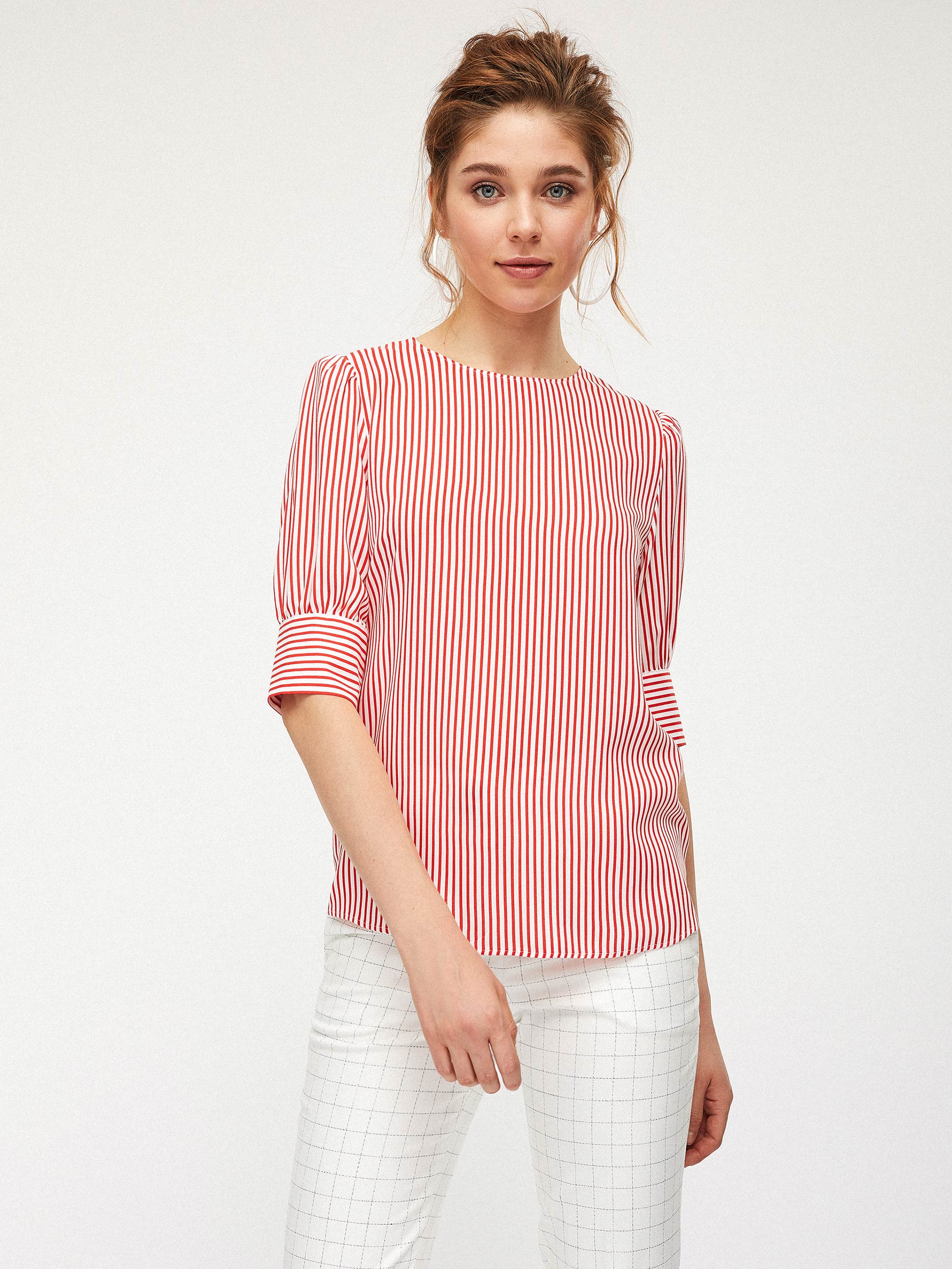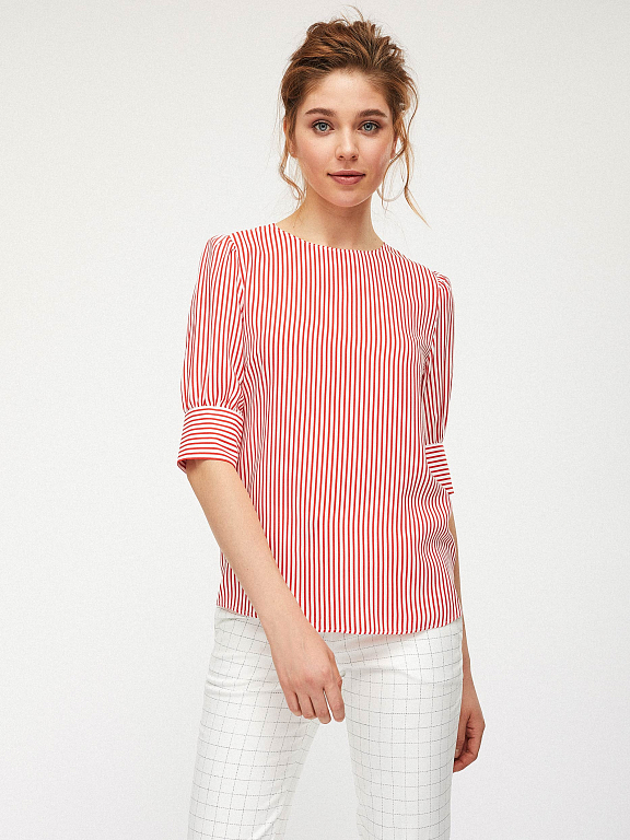 Блуза прямого кроя, выполненная из 100% вискозы. Округлый вырез, укороченные объемные рукава с пуговицами.