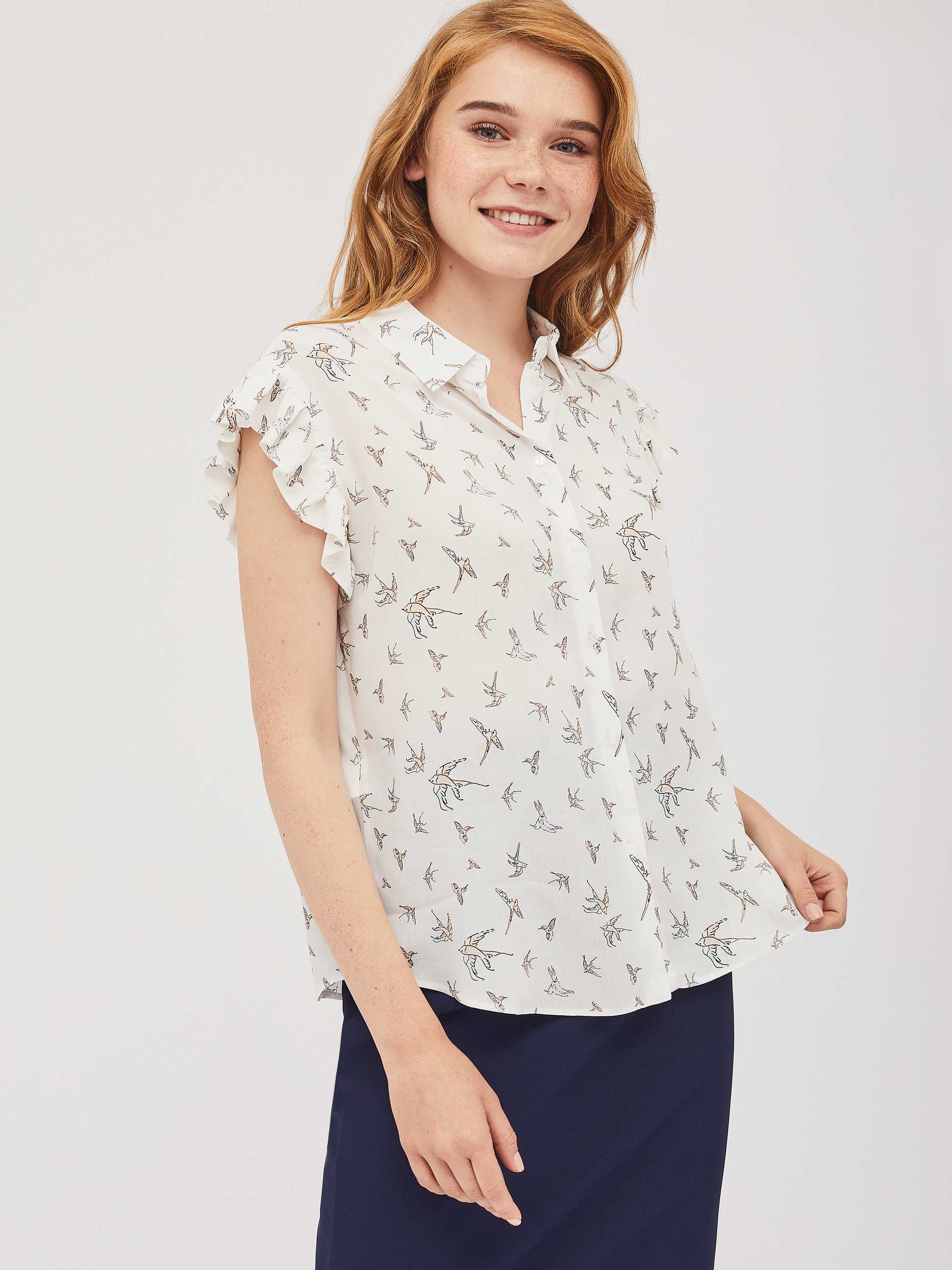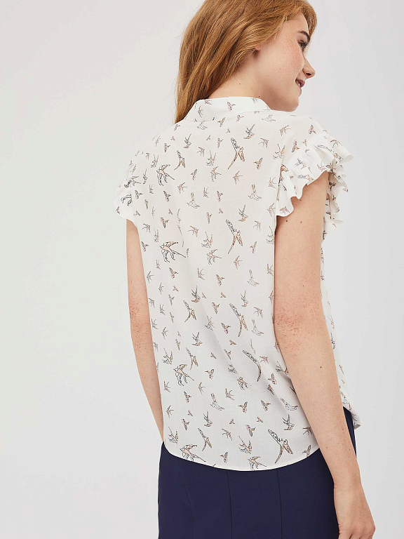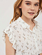 Топ из вискозы с авторским принтом, отложным воротником и короткими рукавами со складками. Застёжка на пуговицы.  Изделие без подкладки.  Рост модели 172 см, размер 42 (российский)