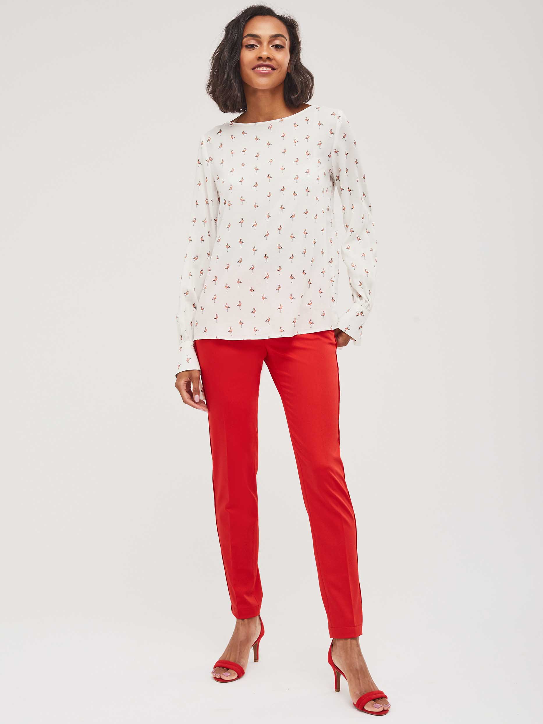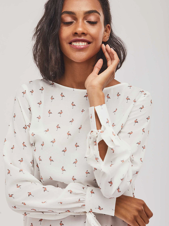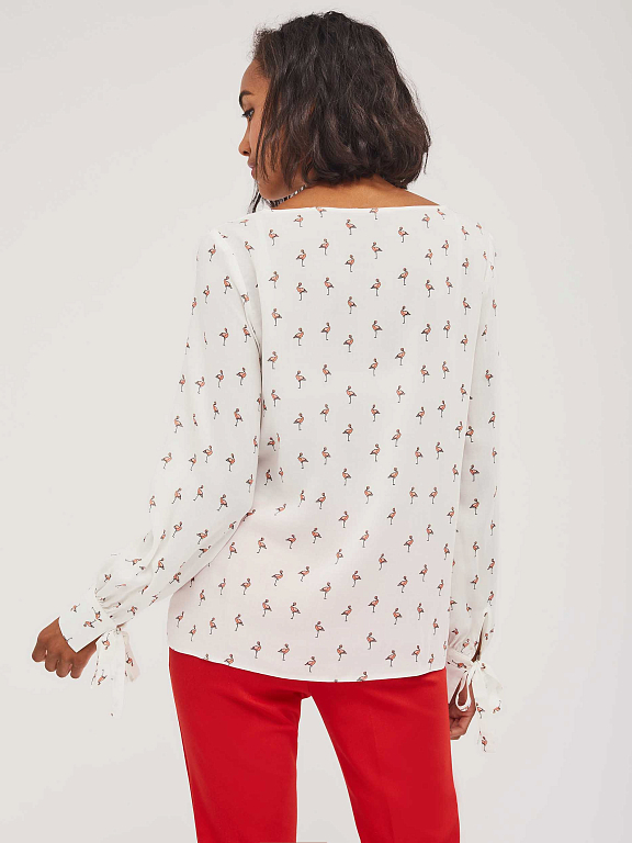 Блуза с воротником "лодочка", длинными рукавами, присборенными у манжета с завязками на бант. Изделие прямого силуэта, без застёжки. Изделие без подкладки.  Рост модели 173 см, размер 42 (российский)