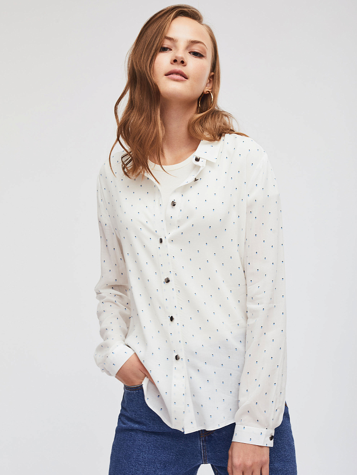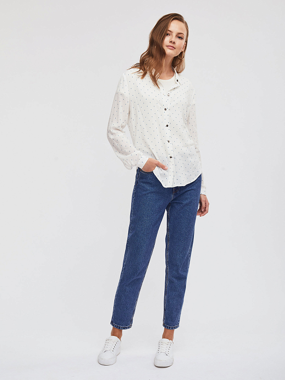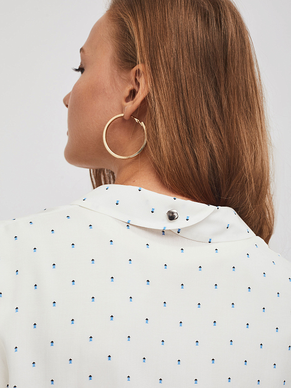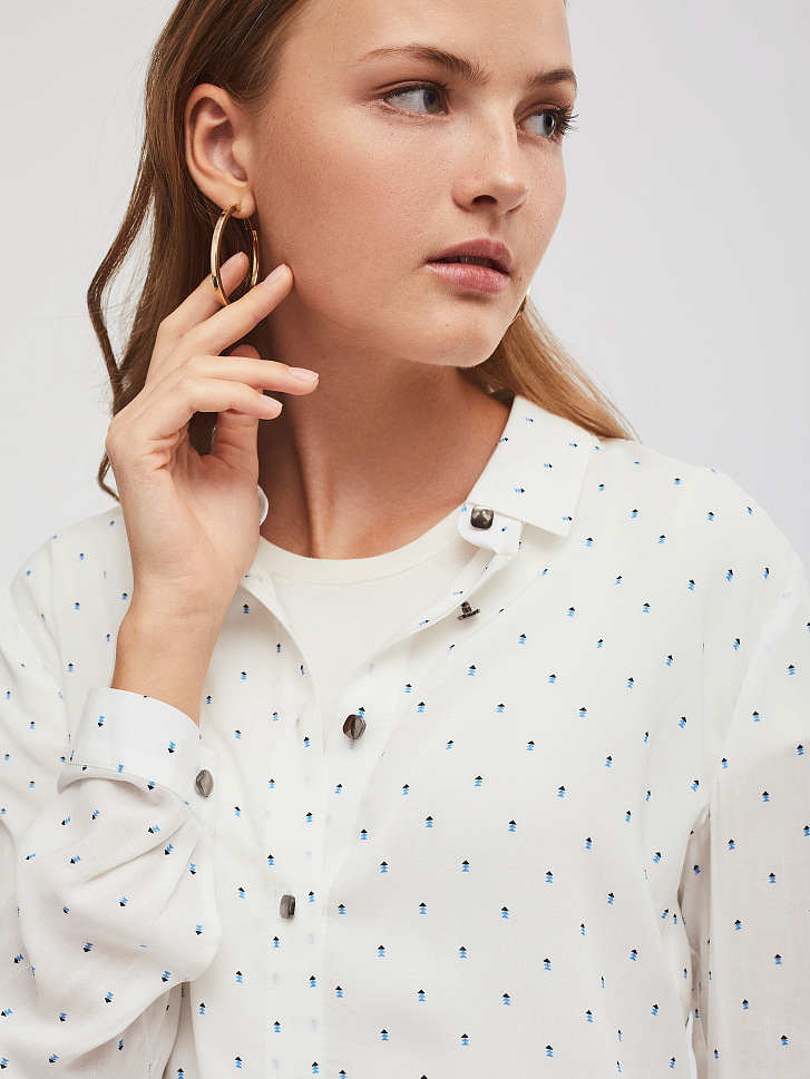 Блуза свободного кроя с объемными рукавами. Отложной воротник, спущенная линия плеч, рукава на манжетах с пуговицами. Застегивается на ряд небольших металлических пуговиц.