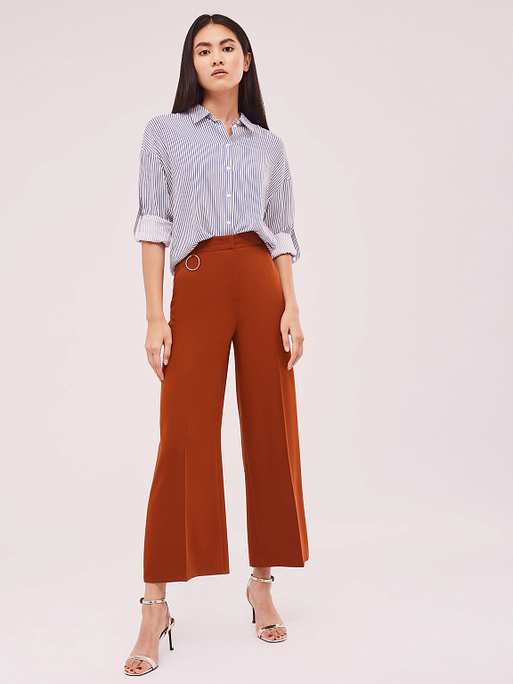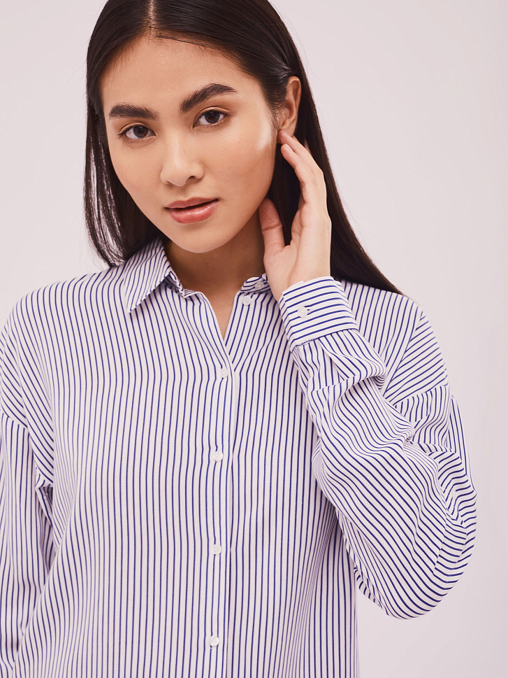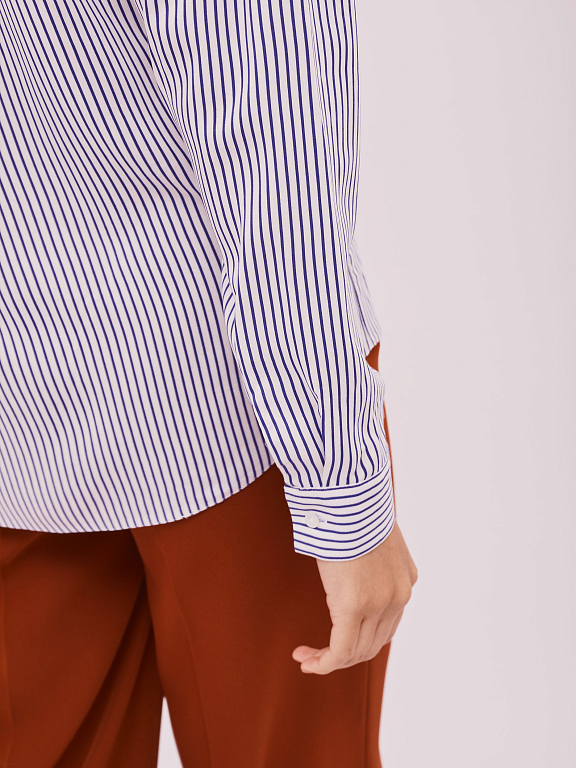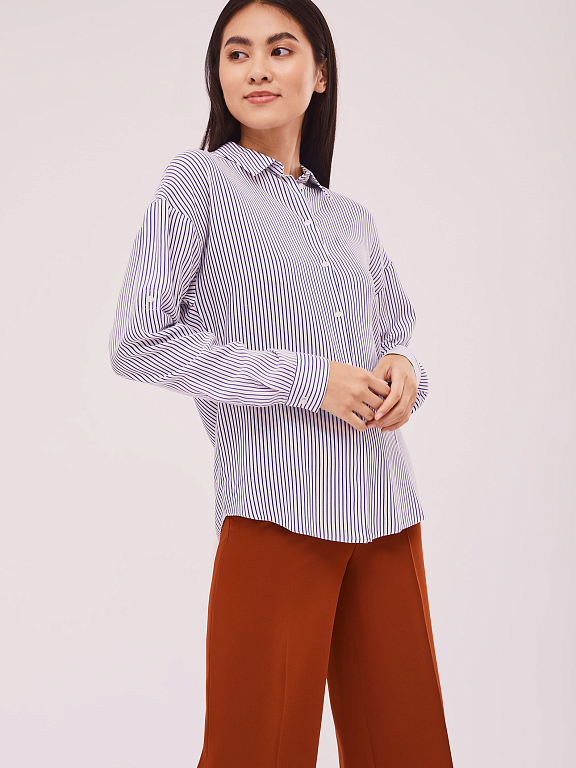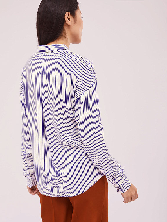 Рубашка прямого кроя, выполненная из 100% вискозы. Классический отложной воротник, потайные хлястики на рукавах. Застегивается на ряд небольших пуговиц.