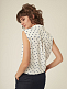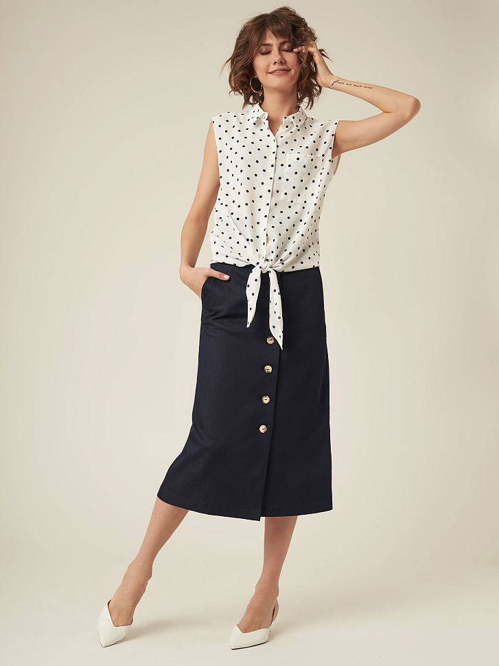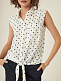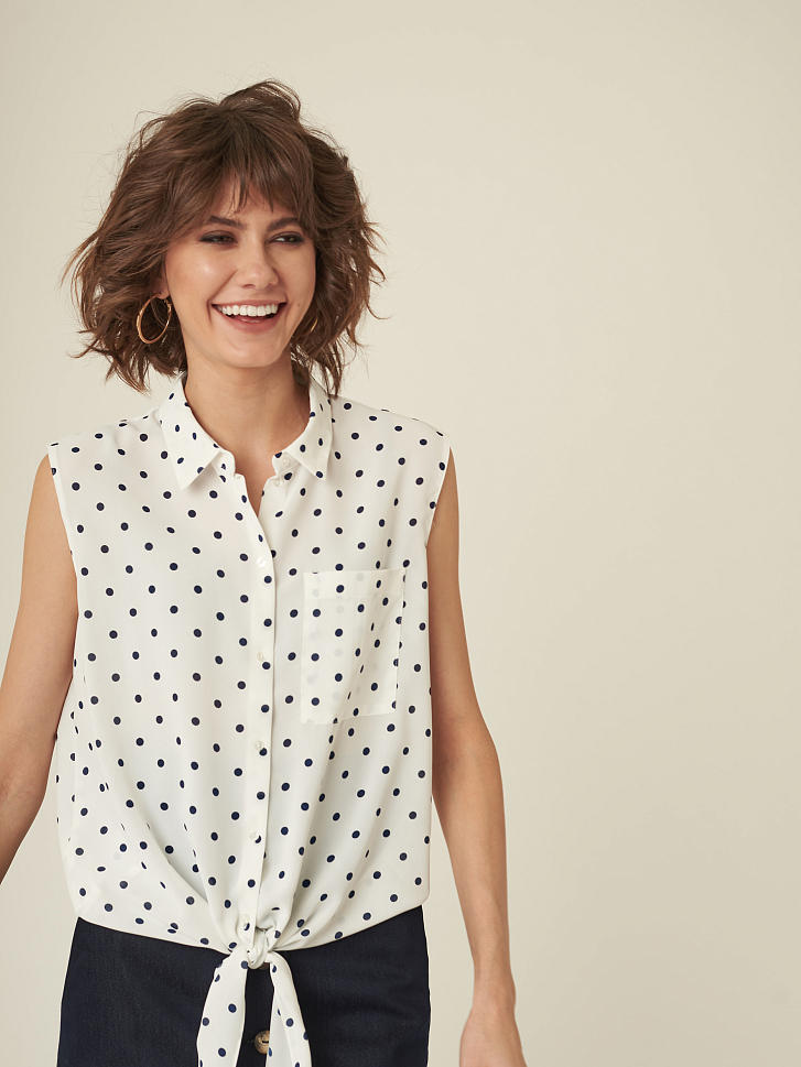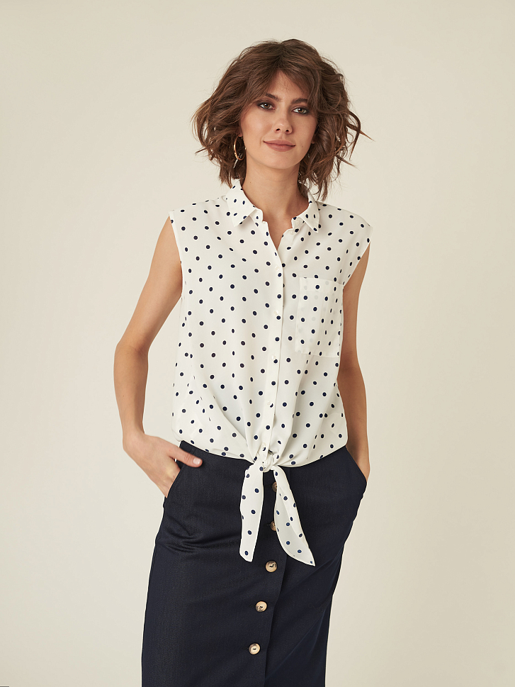 Блуза прямого кроя без рукавов. Декоративные завязки, классический отложной воротник, накладной нагрудный карман. Застегивается на ряд небольших пуговиц.