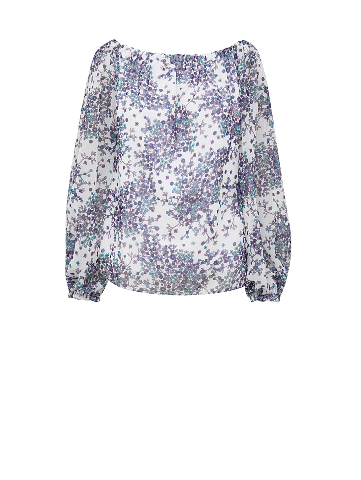 Блуза свободного кроя со спущенными плечами и объемными рукавами на эластичных манжетах.
