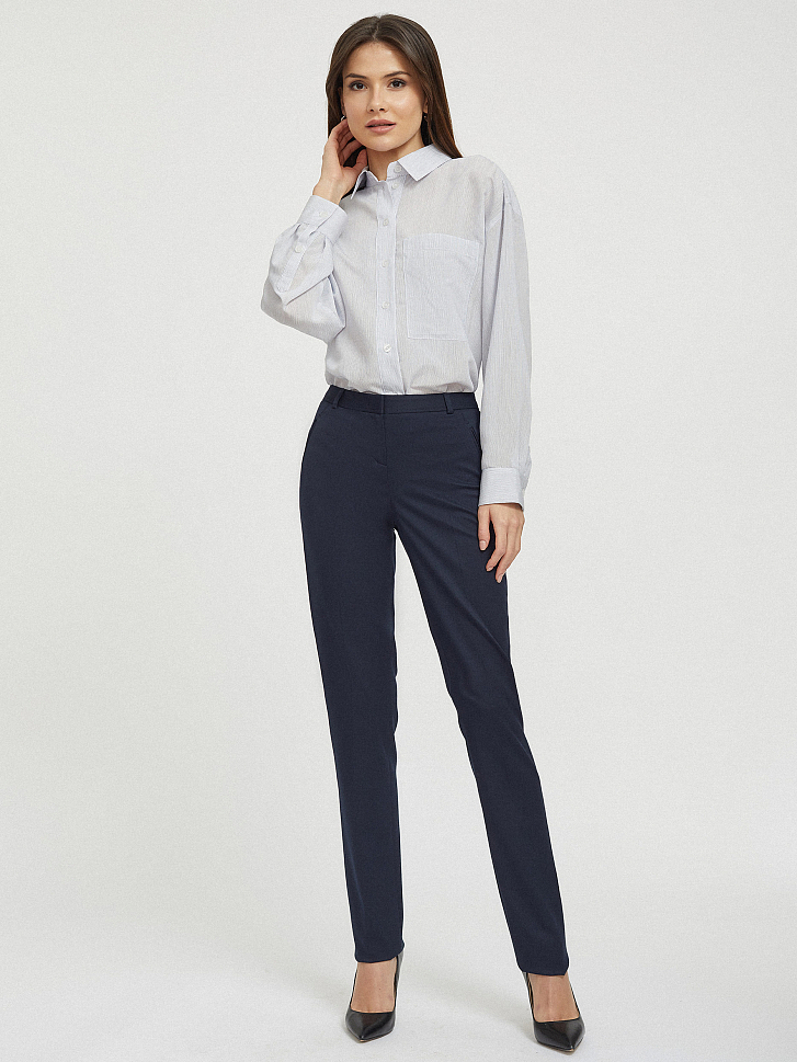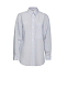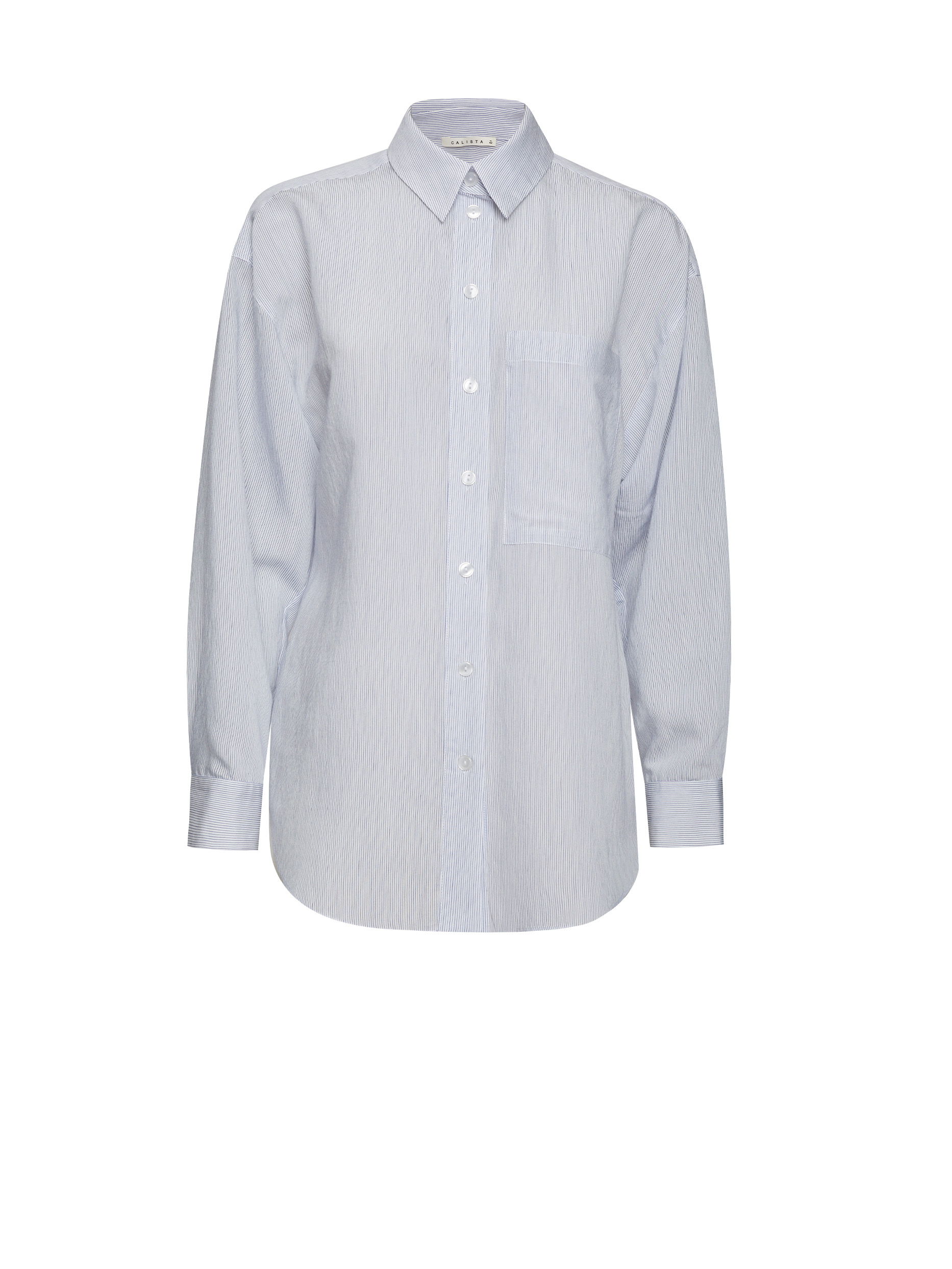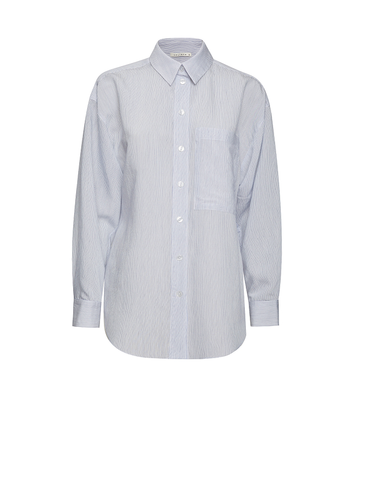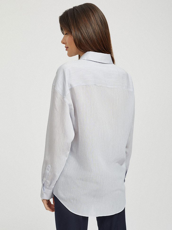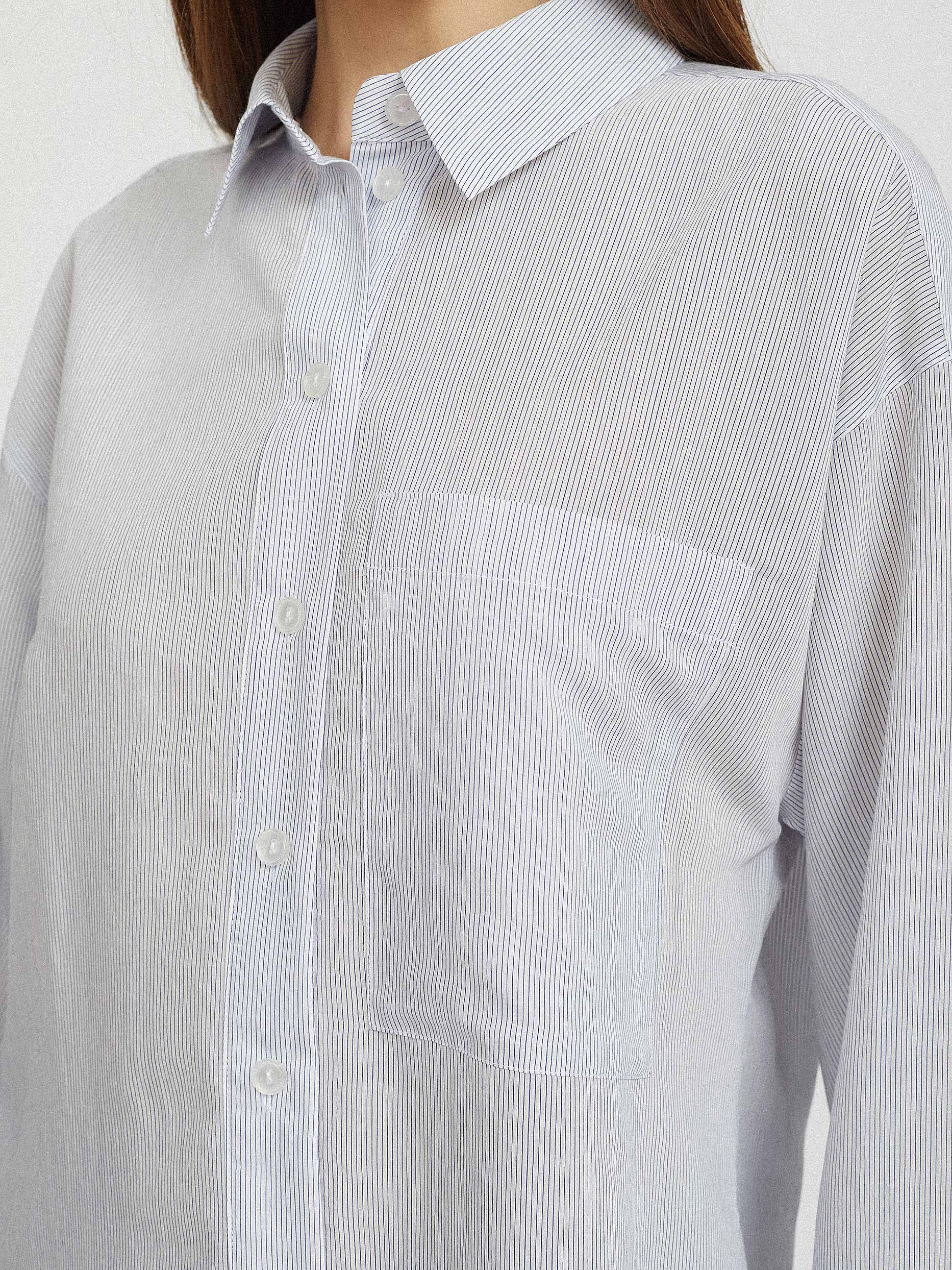 Рубашка свободного кроя в тонкую полоску. Широкий крой, классический отложной воротник, накладной нагрудный карман, спущенная линия плеч, рукава с широкими манжетами.