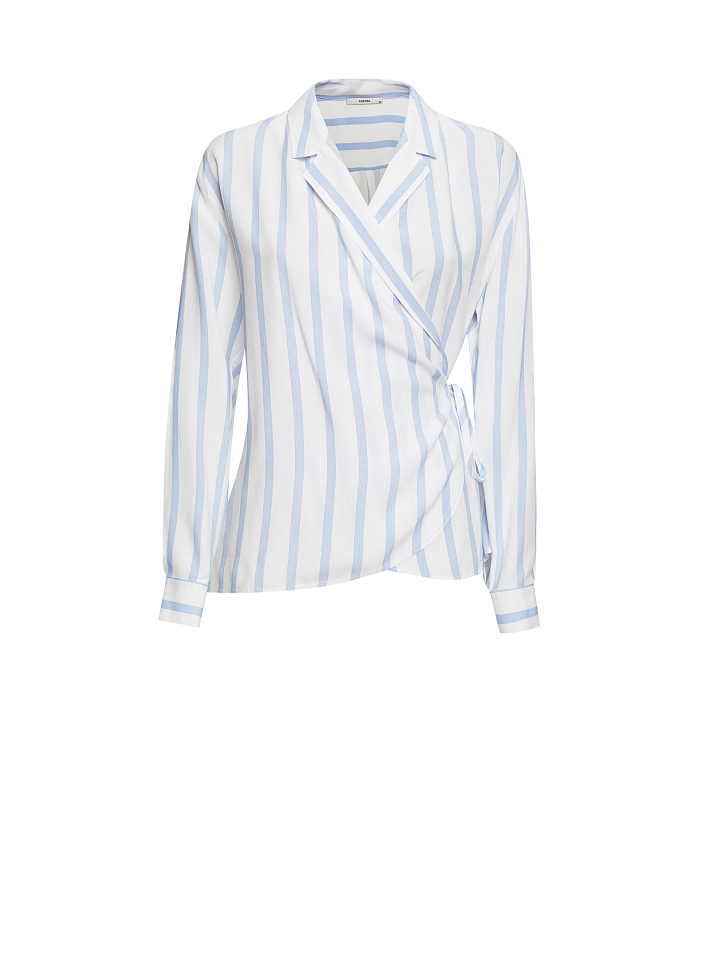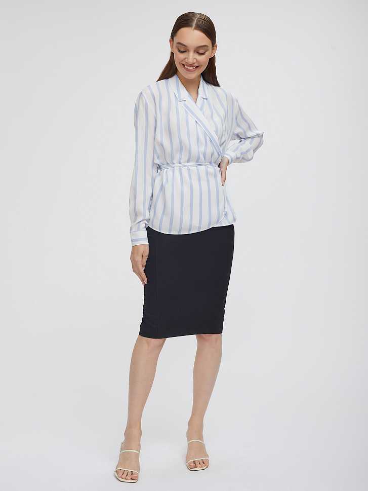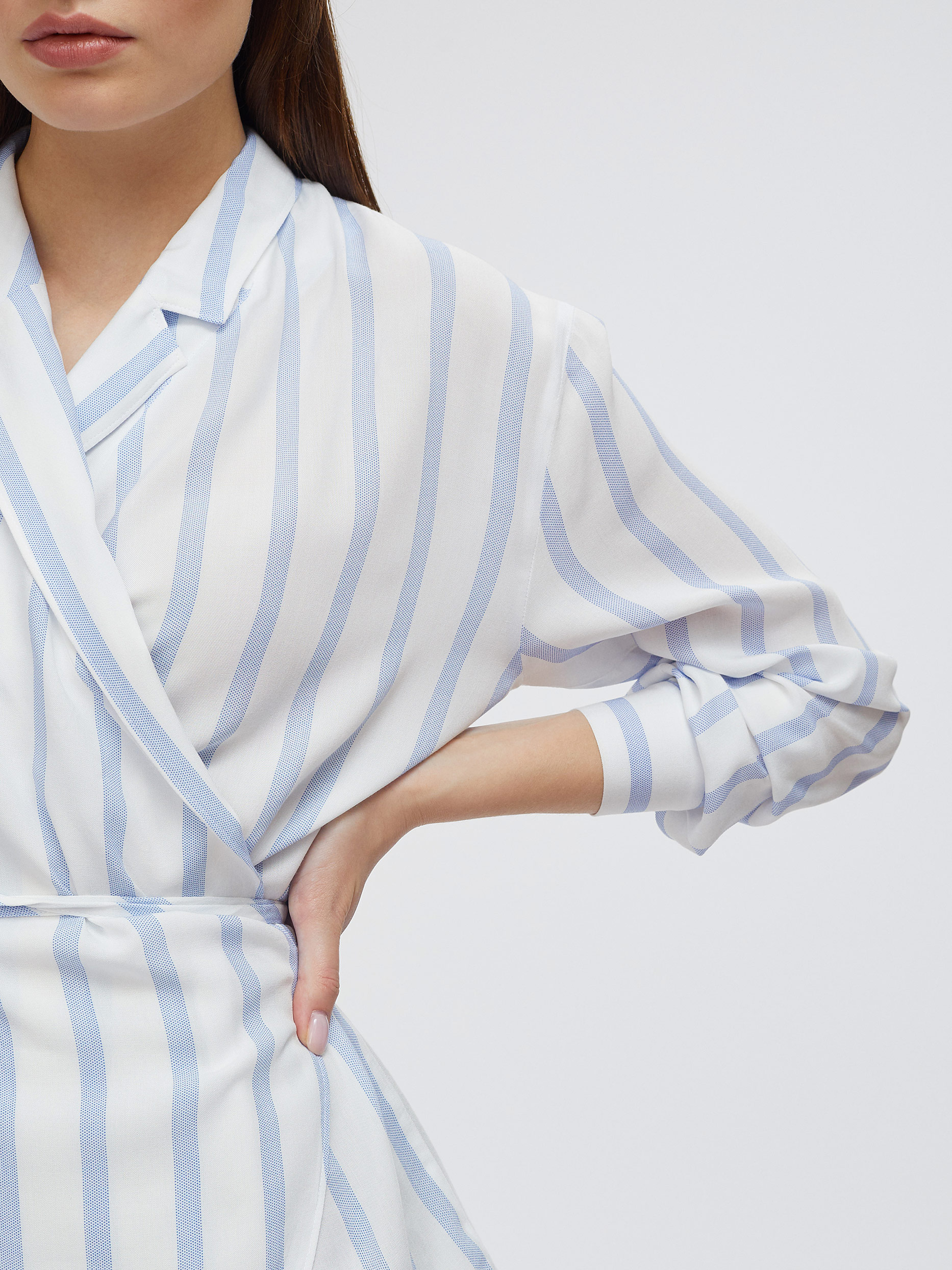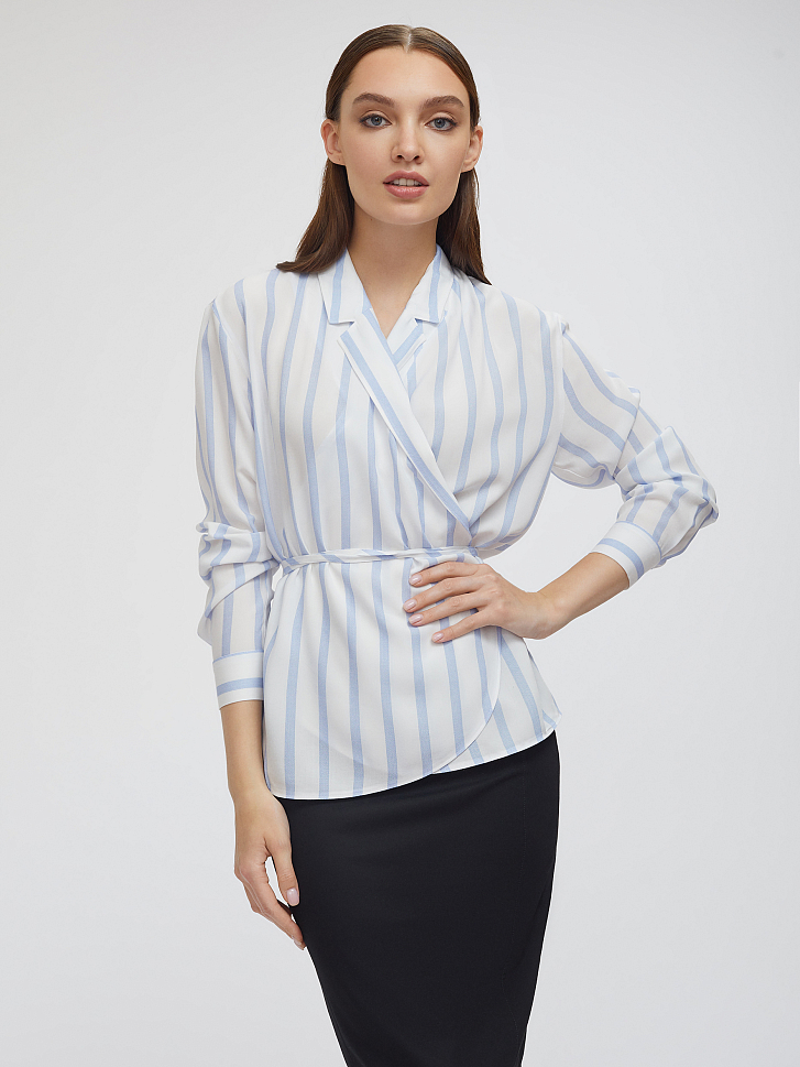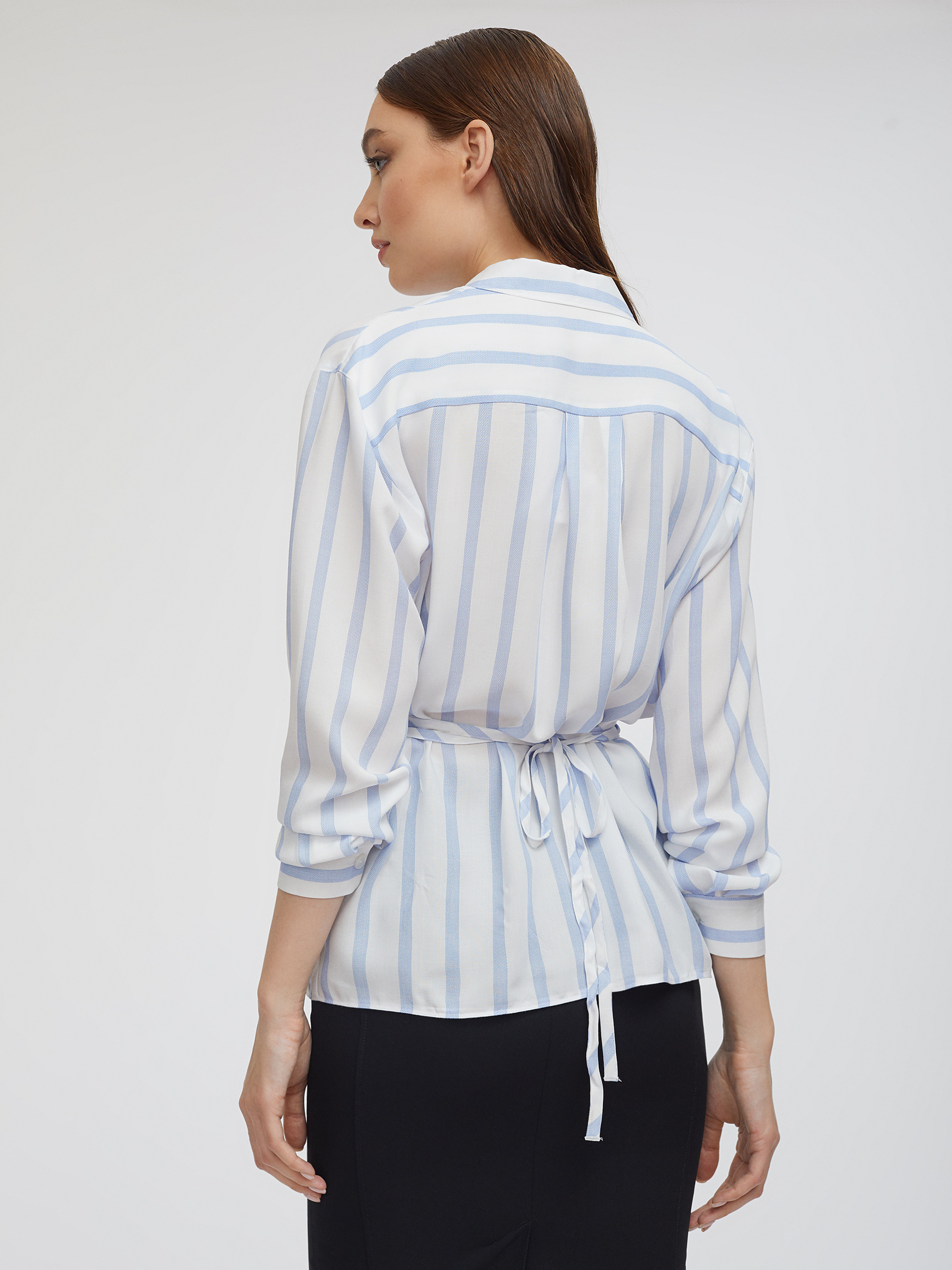 Блуза из мягкой вискозы в полоску. Приталенный силуэт, отложной воротник с лацканами, объемные рукава с манжетами на пуговицах.