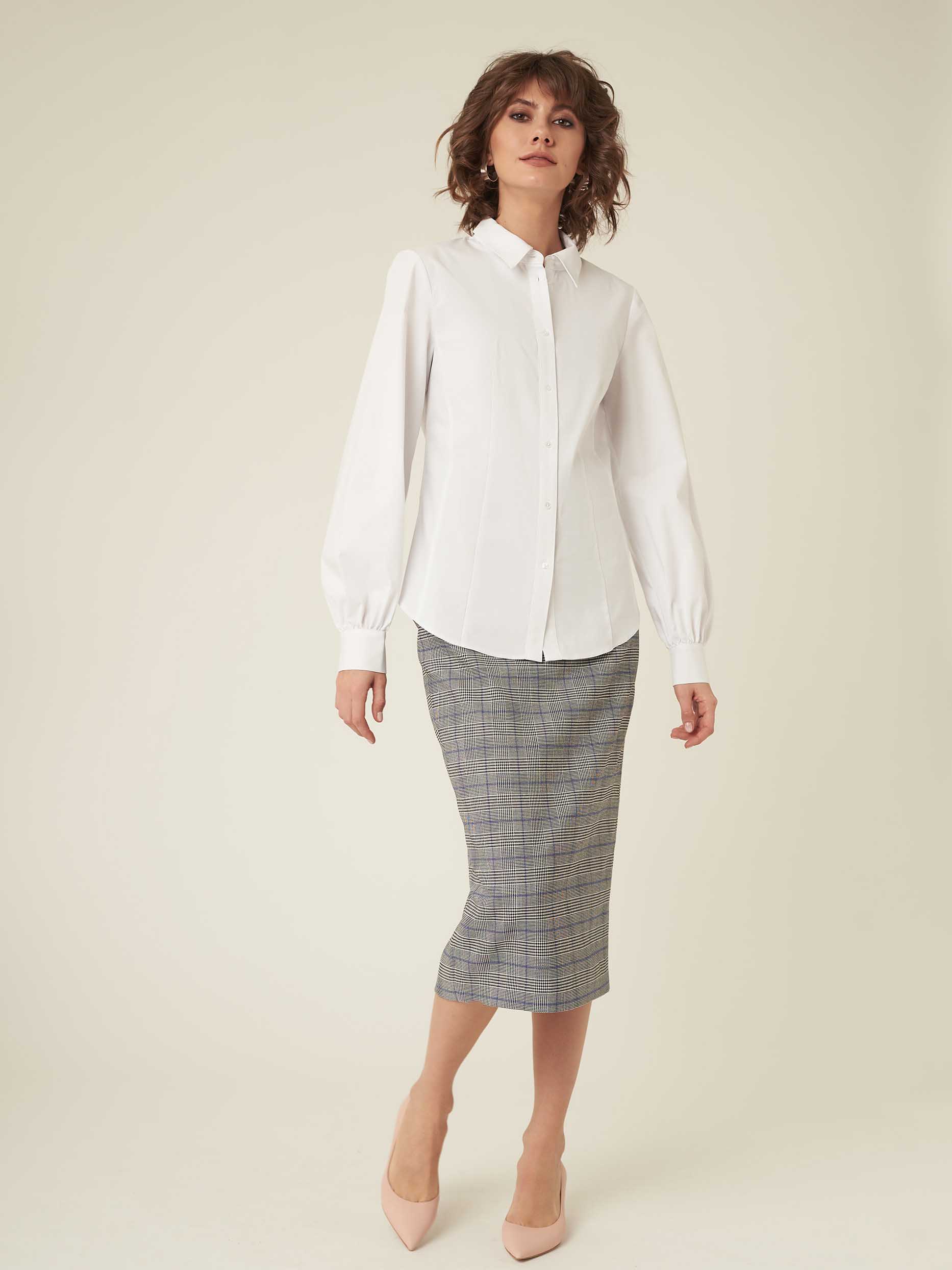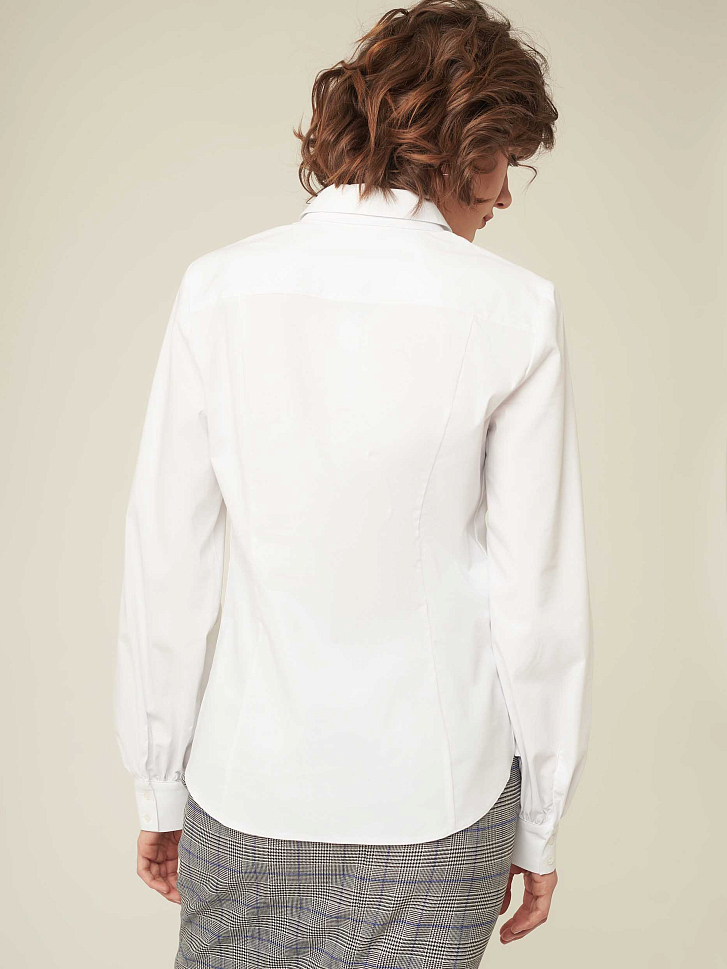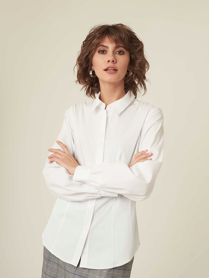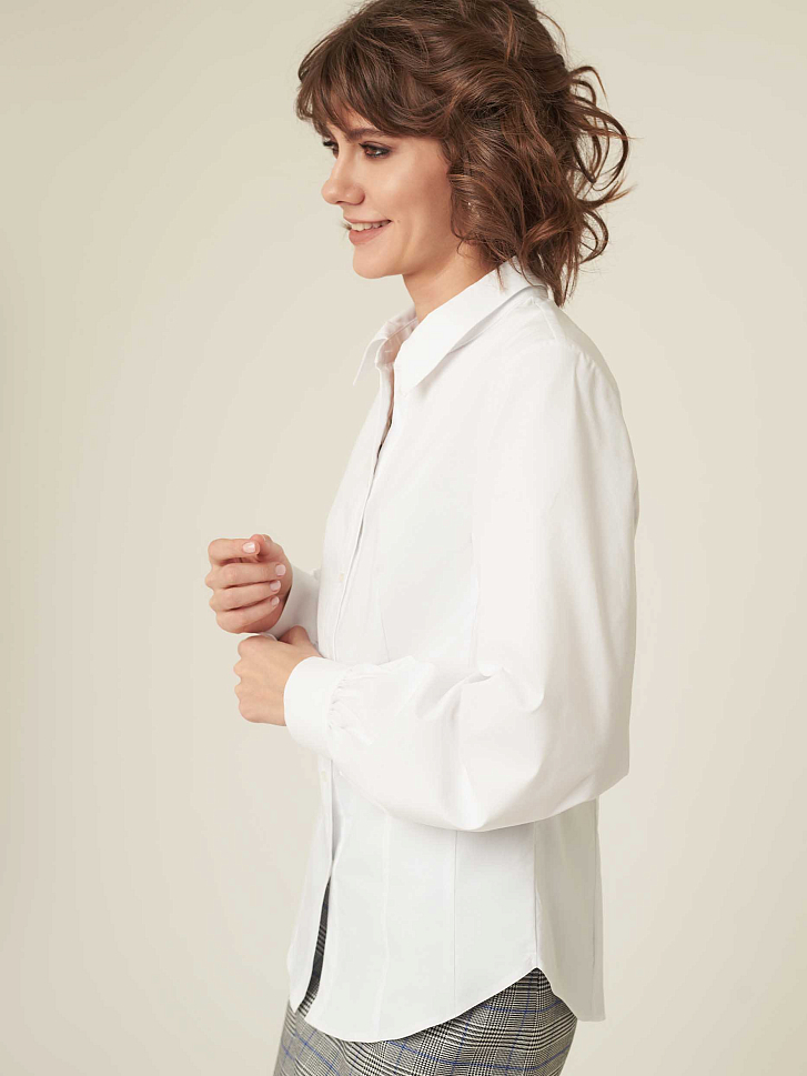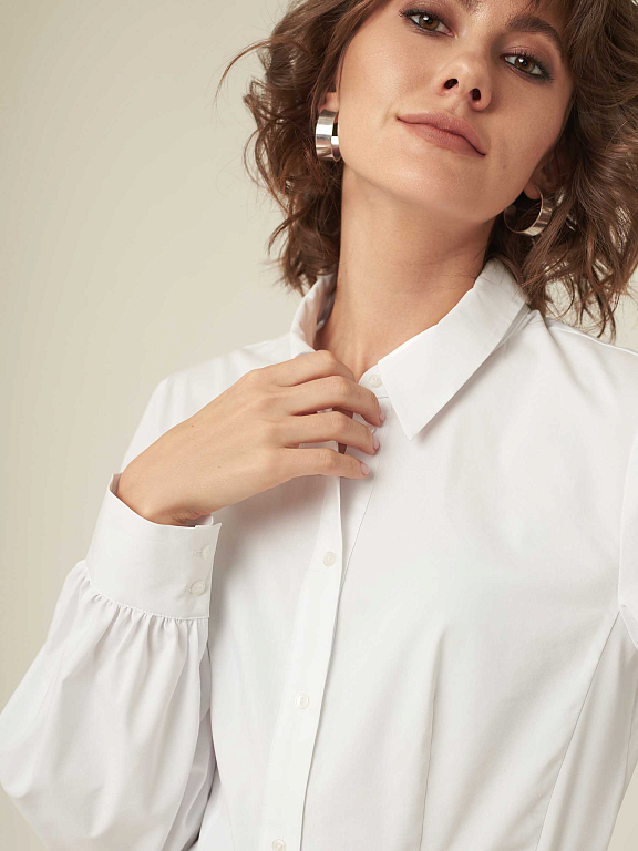 Рубашка приталенного кроя, выполненная из смесового хлопка. Классический отложной воротник, длинные объемные рукава на манжетах, закругленный нижний край. Застегивается на ряд небольших пуговиц в тон ткани.