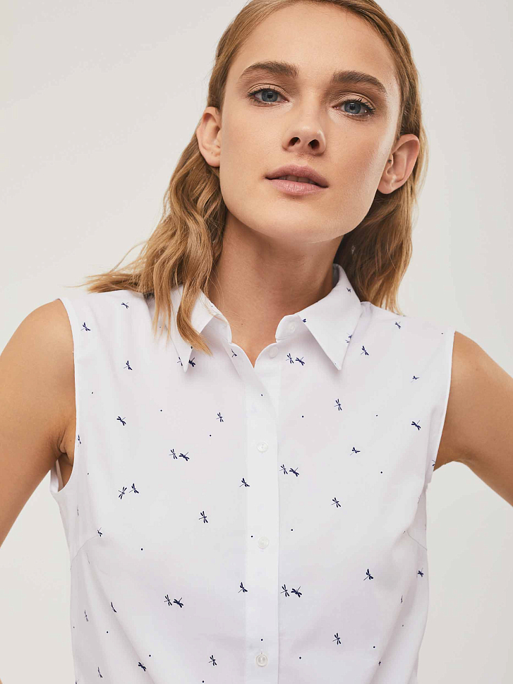 Топ приталенного силуэта без рукавов с отложным воротником и повторяющимся рисунком "стрекозы". Изделие с застёжкой на пуговицы. Изделие без  подкладки.  Рост модели 175 см, размер 42 (российский)
