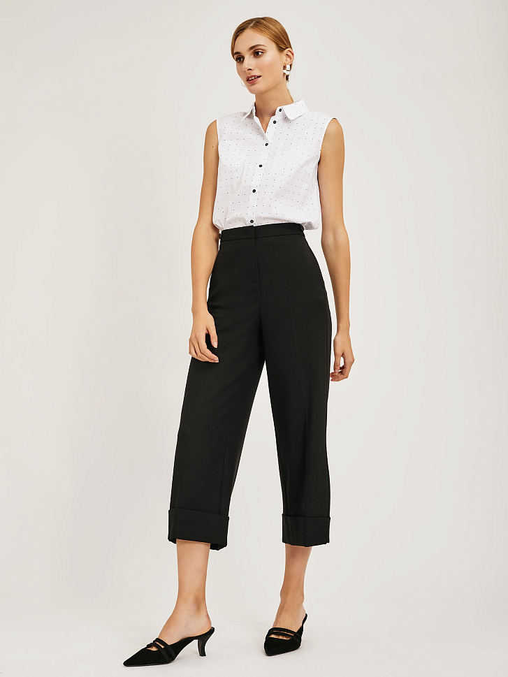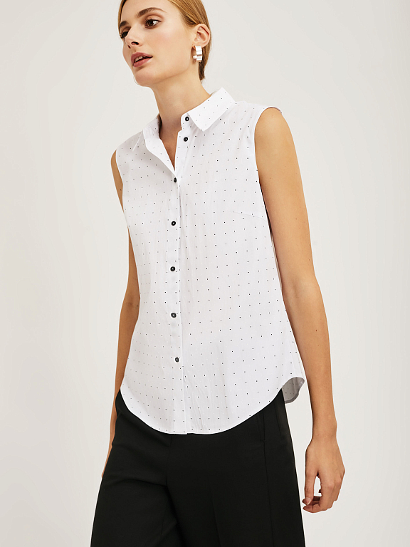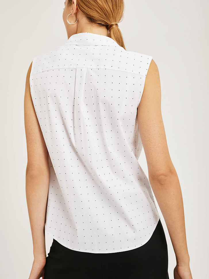 Легкая блуза без рукавов. Иделие с принтом "Мелкий горох" и отложным воротником. По спинке изделия сборка.