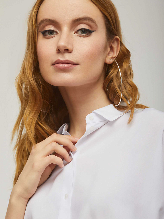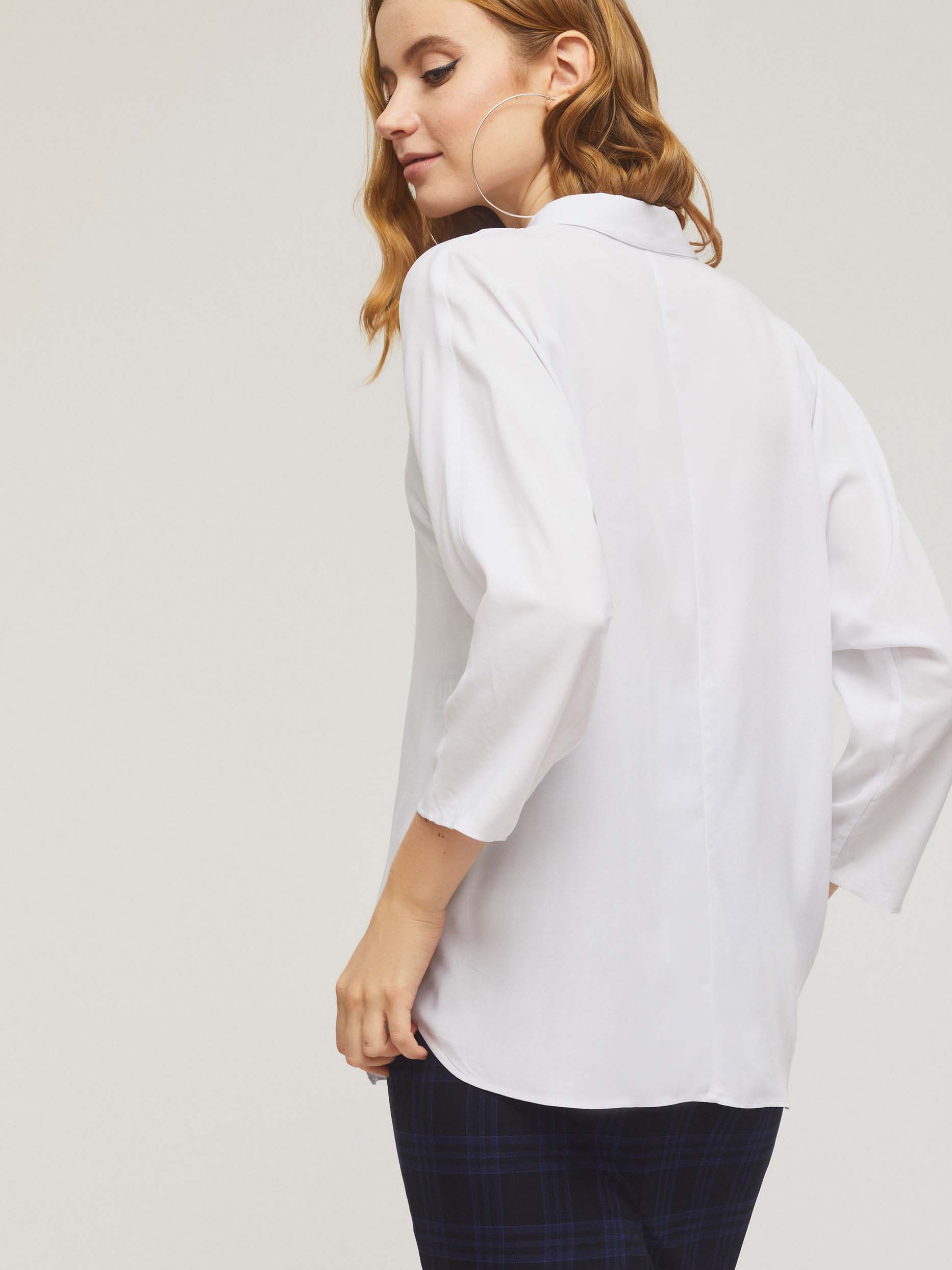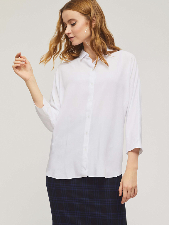 Блуза свободного силуэта с отложным воротником из вискозы. Объемные рукава длиной 3/4. Застёжка на пуговицы. Слегка удлиненная спинка. Изделие без подкладки.  Рост модели 173 см, размер 42 (российский). Плотность ткани: 119 г/м2