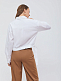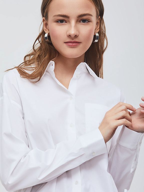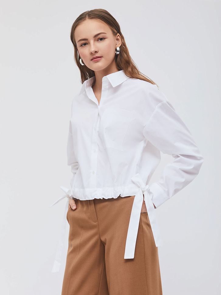 Укороченная свободная рубашка, выполненная из смесового хлопка. Отложной воротник, спущенная линия плеч, накладной нагрудный карман, кулиска по нижнему краю с завязками.