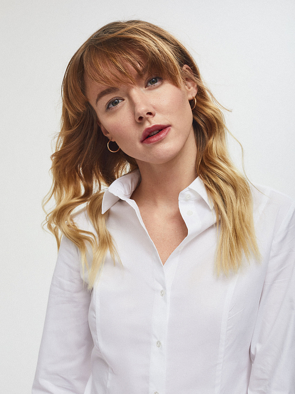 Рубашка приталенного кроя с длинными рукавами из смесового хлопка. Классический отложной воротник, манжеты, застежка на ряд небольших пуговиц, закругленный нижний край.
