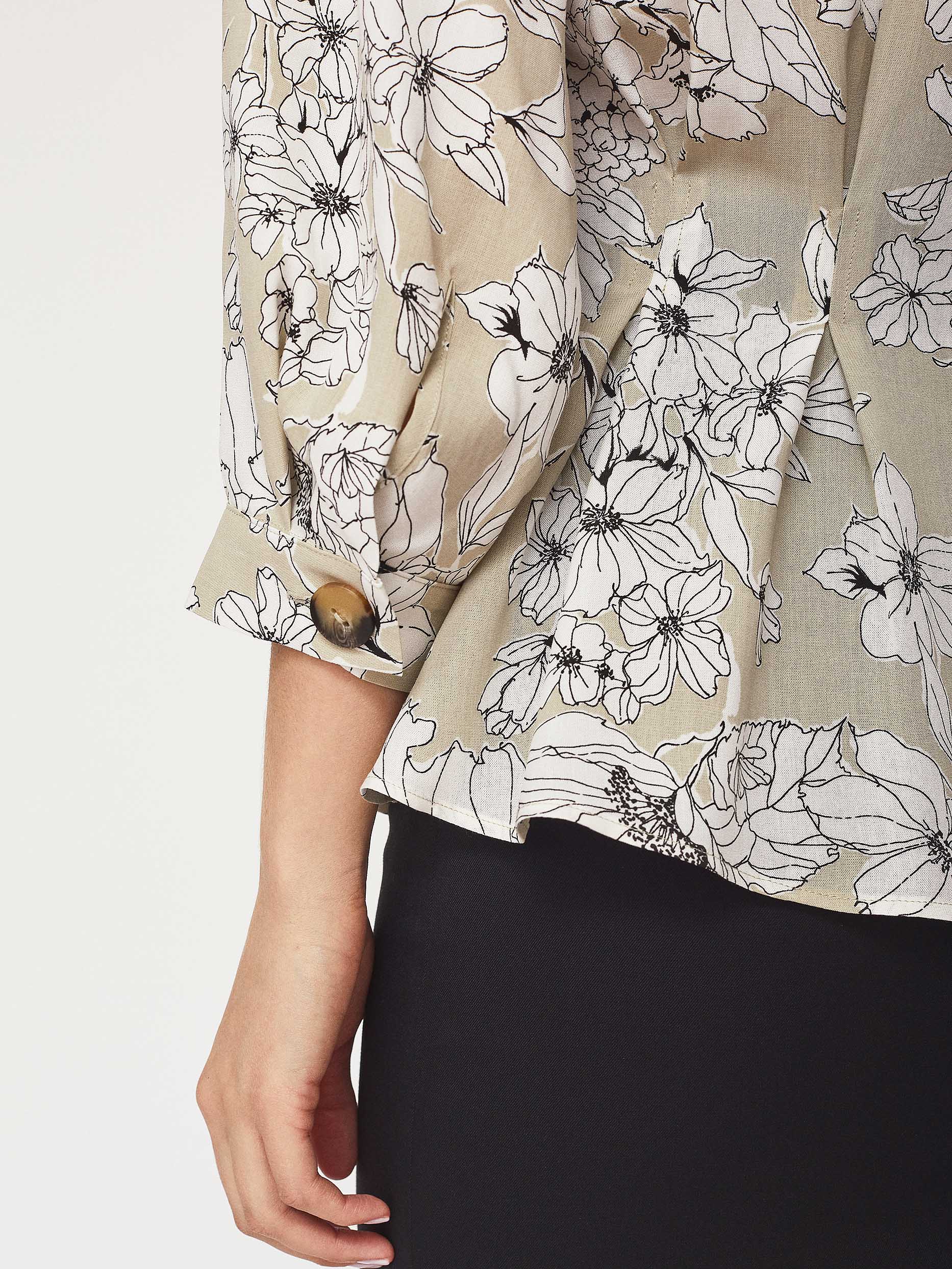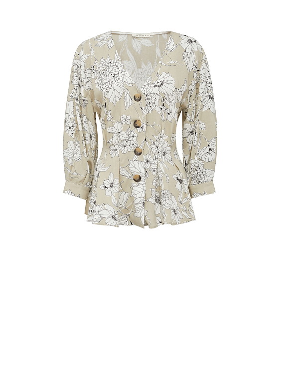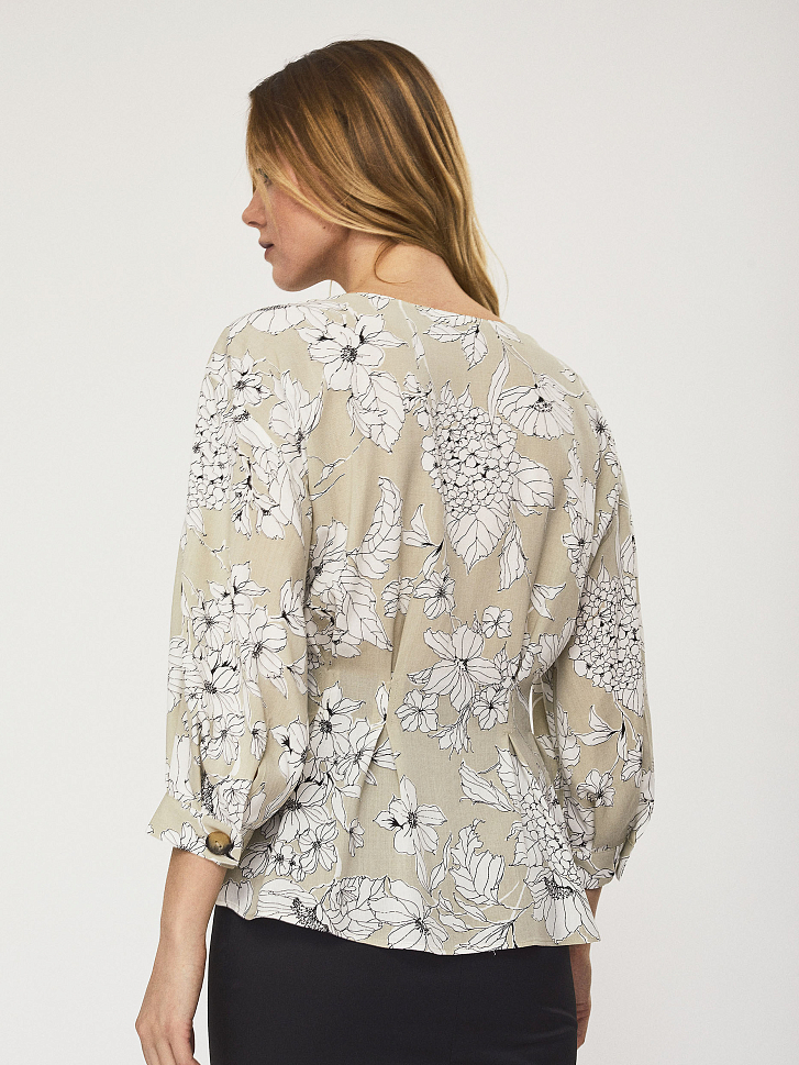 Блуза приталенного кроя, выполненная из 100% вискозы. Защипы на талии, V-образный вырез, объемные рукава длины ¾. Застегивается на ряд крупных пуговиц.