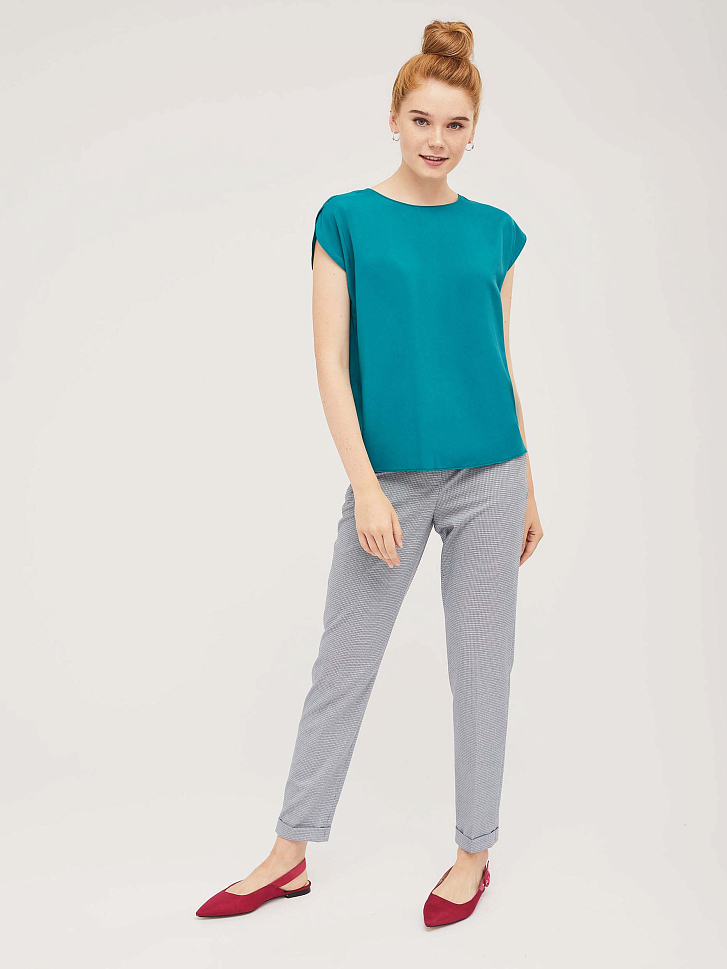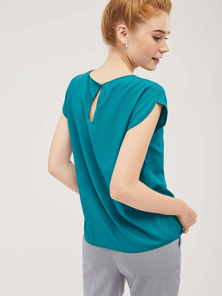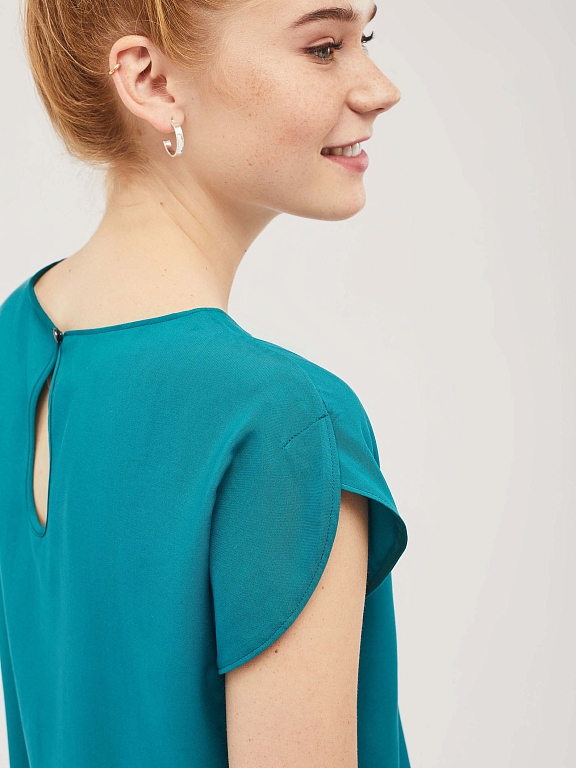 Топ прямого силуэта с фантазийными рукавами и круглым вырезом горловины.  Сзади разрез с застёжкой на пуговицу. Изделие без подкладки.  Рост модели 172 см, размер 42 (российский)