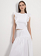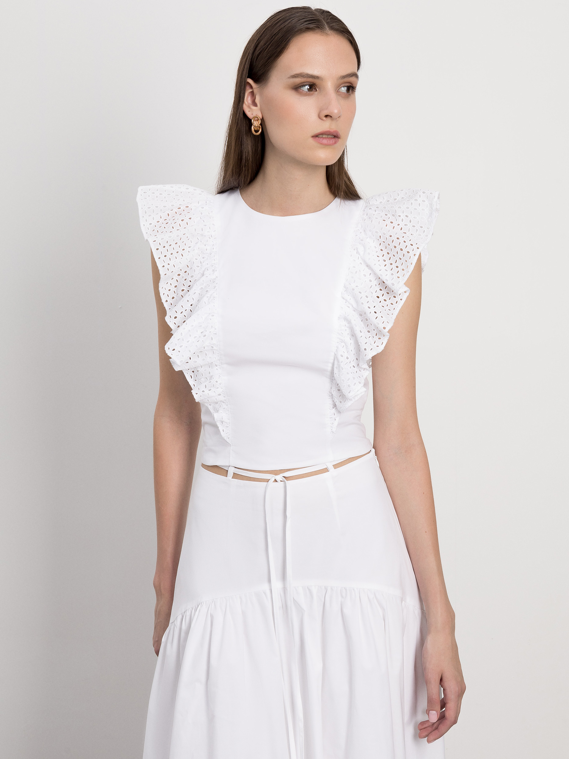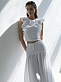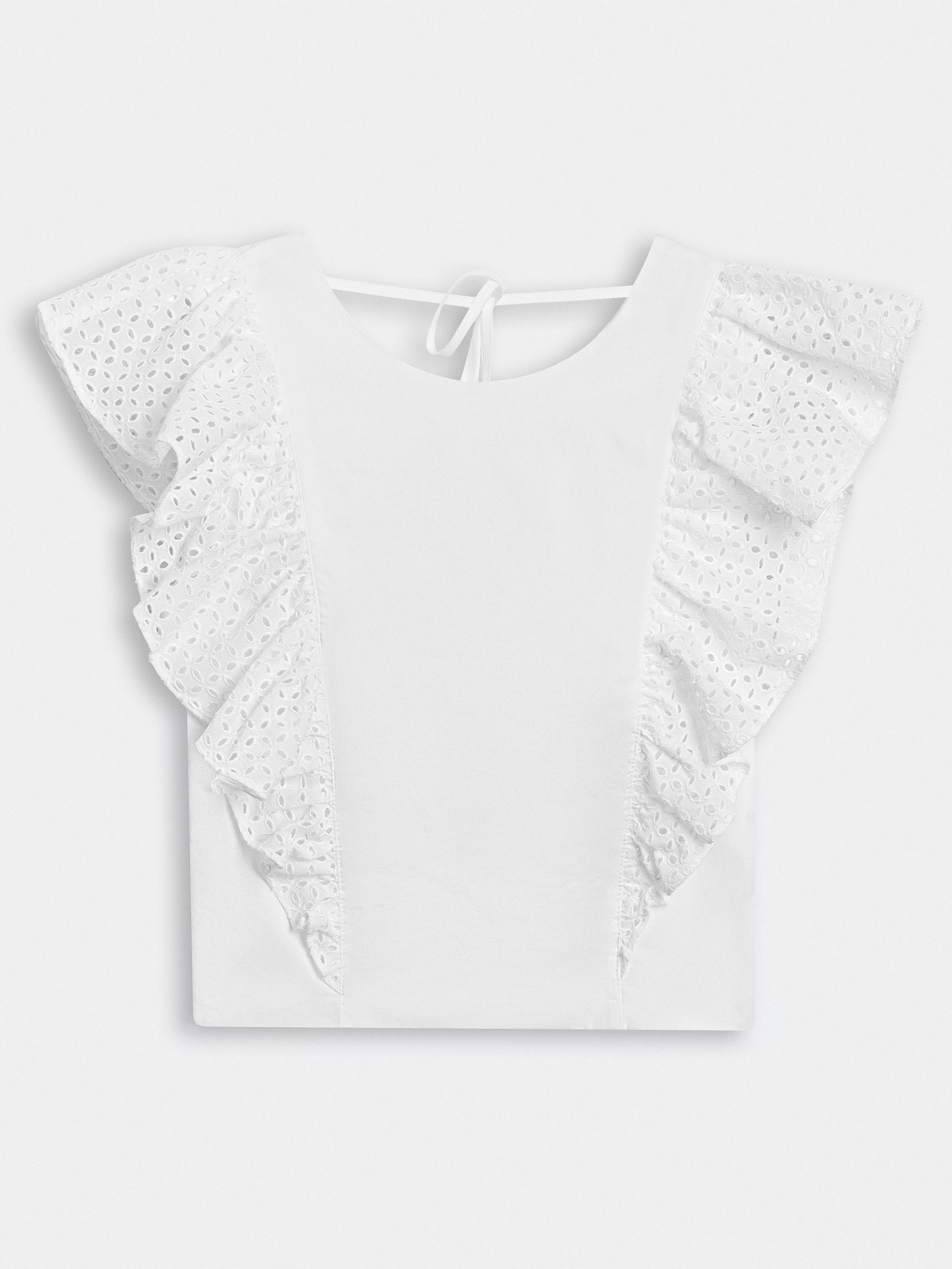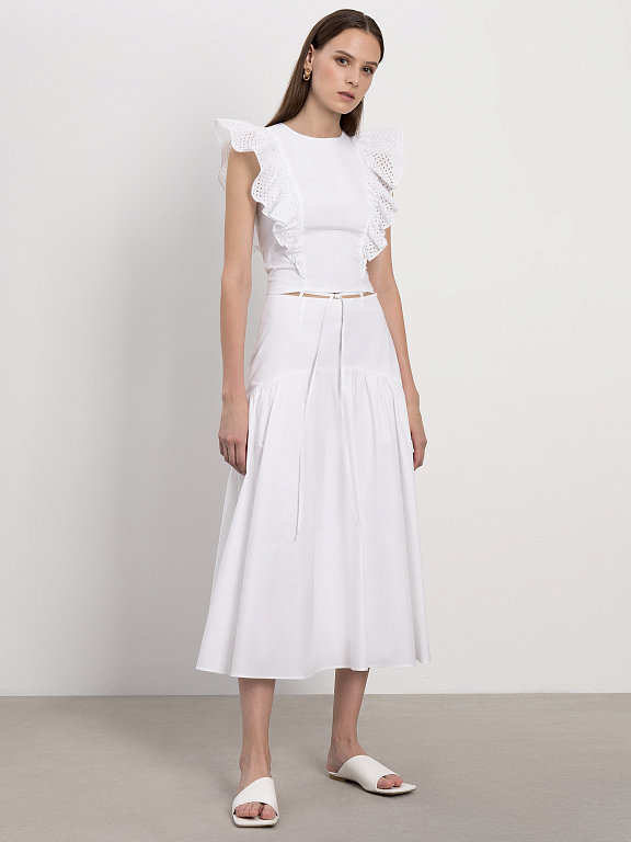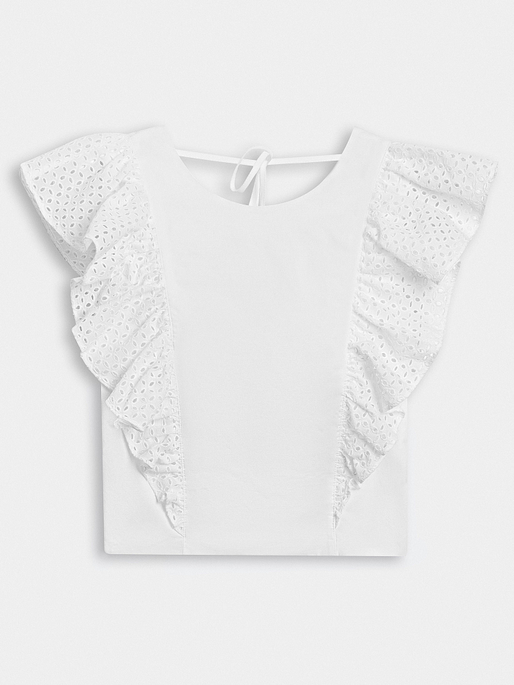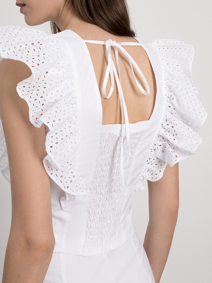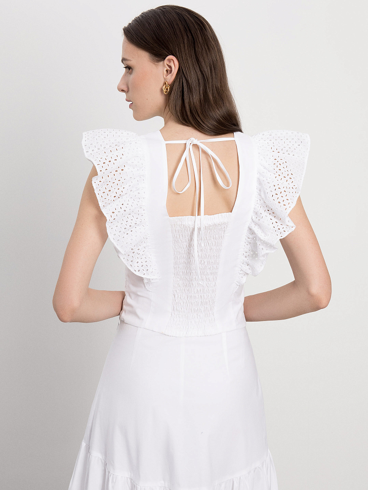 Романтичное настроение обеспечили топу рукава-воланы с ажурной вышивкой. Декор хорошо держит форму за счет материала. Для пошива модели использовали мягкий, но при этом плотный хлопок с добавлением стрейчевых волокон.