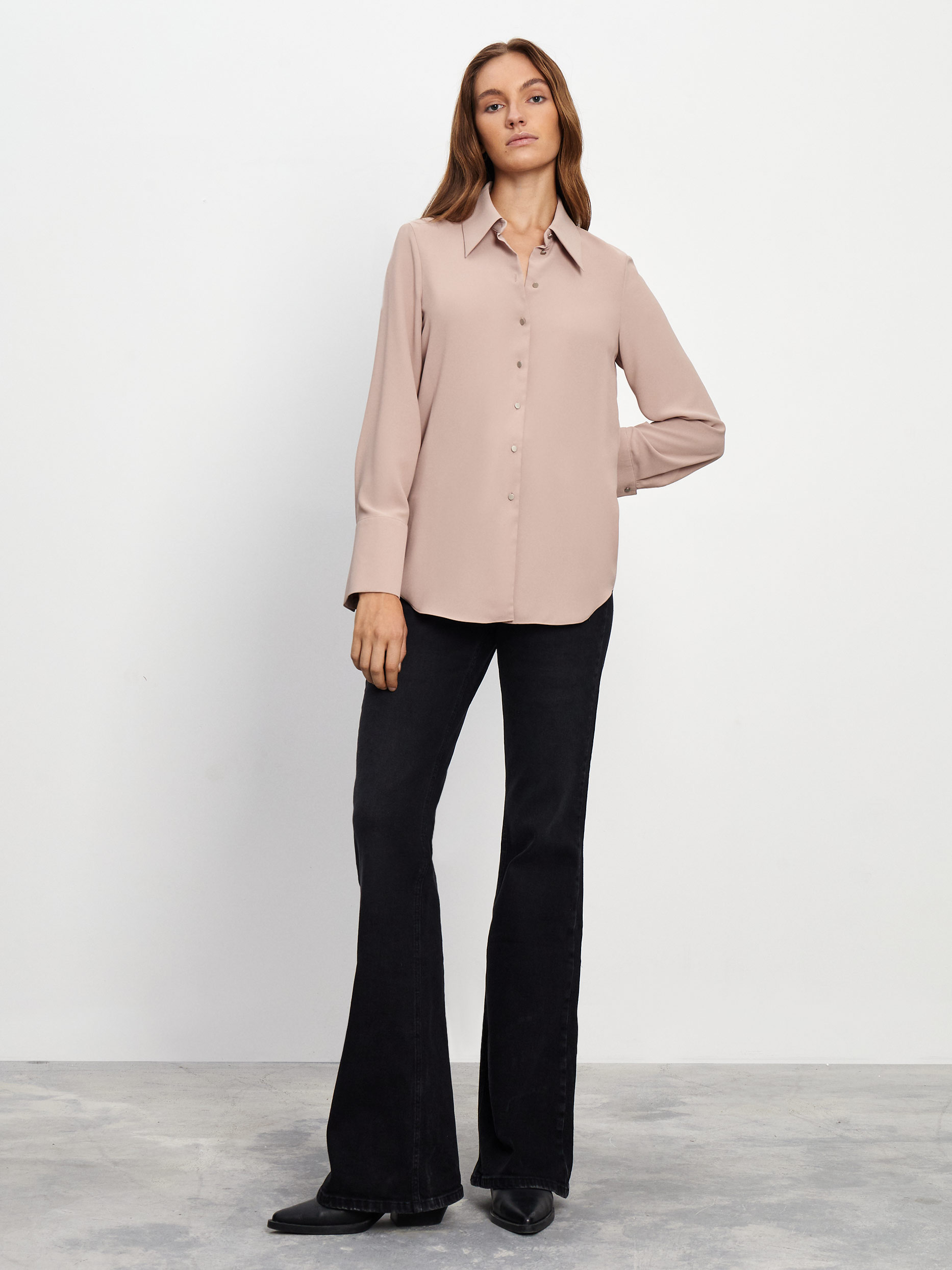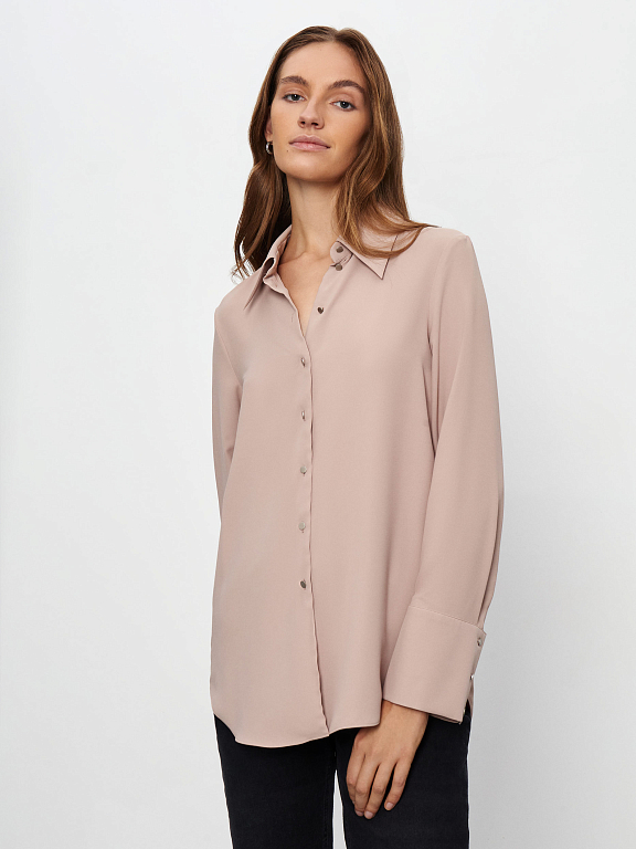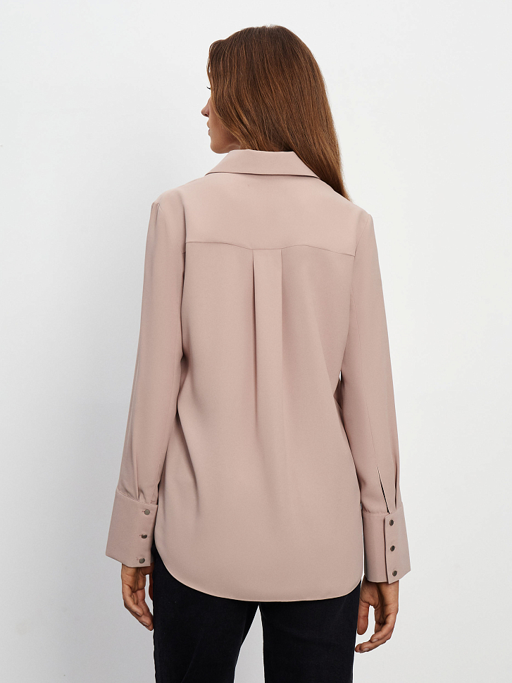 Блуза из струящейся ткани с шелковистым блеском легко впишется в повседневный гардероб. Изделие лаконичного кроя подчеркнет женственность и будет уместно в любой ситуации.  С джинсами блуза составит повседневный дневной образ, а с классическими брюками – эффектный вечерний.