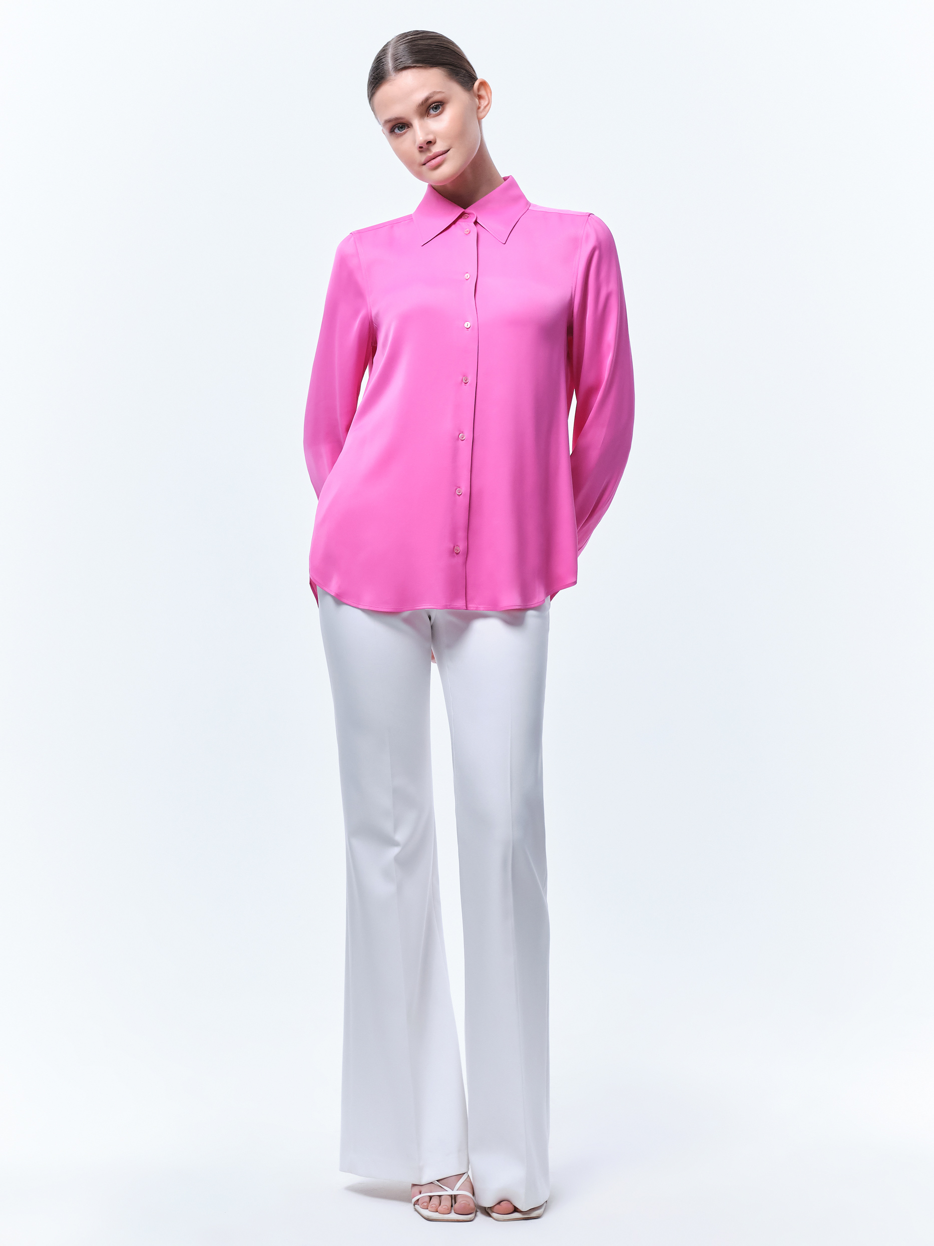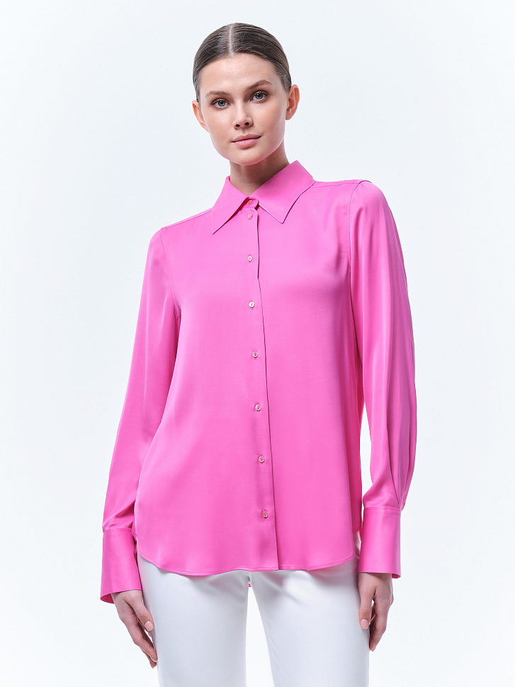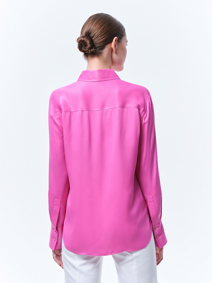 Яркая блуза выполнена из искусственного шелка на основе вискозы, который приятно прилегает к телу и создает ощущение прохлады. Блуза прямого кроя обеспечит комфортную расслабленную посадку для повседневных образов, а если заправить ее в брюки, получится сдержанный офисный аутфит.