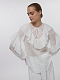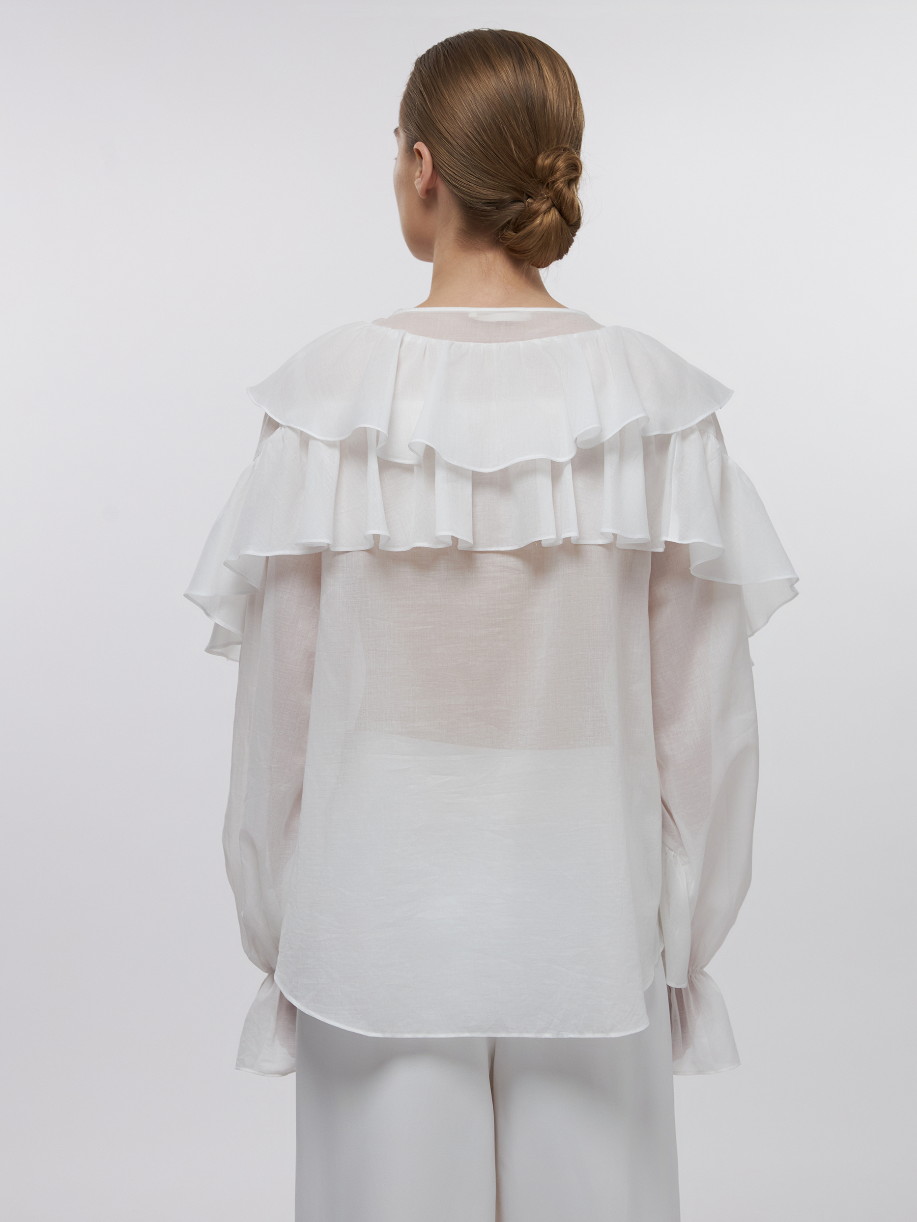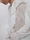 Блуза с воланами на лифе и рукавах создает легкий образ за счет воздушной ткани и свободного кроя. Тонкий полупрозрачный хлопок как вуаль нежно окутывает и приятно прилегает к телу. Дополните блузу базовыми брюками или денимом для повседневных женственных комплектов.