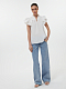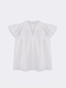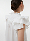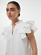 Блуза с летящими рукавами-воланами создаст воздушный летний образ. Тонкий поплин из натурального хлопка хорошо пропускает воздух, что особенно важно в жаркие дни. V-образный вырез фиксируется шнурками, формируя воротник-стойку со складками.