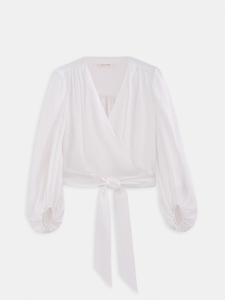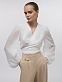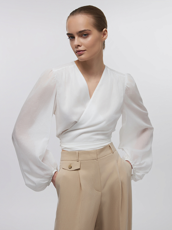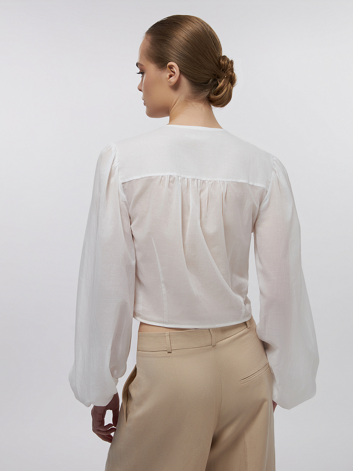 Укороченная блузка поможет выглядеть женственно и привлекательно. Такой эффект гарантируют деликатный вырез, объемные воздушные рукава и ленты, которые завязываются на спине. Модель из тонкого полупрозрачного хлопка подойдет к брюкам и юбкам на высокой посадке.