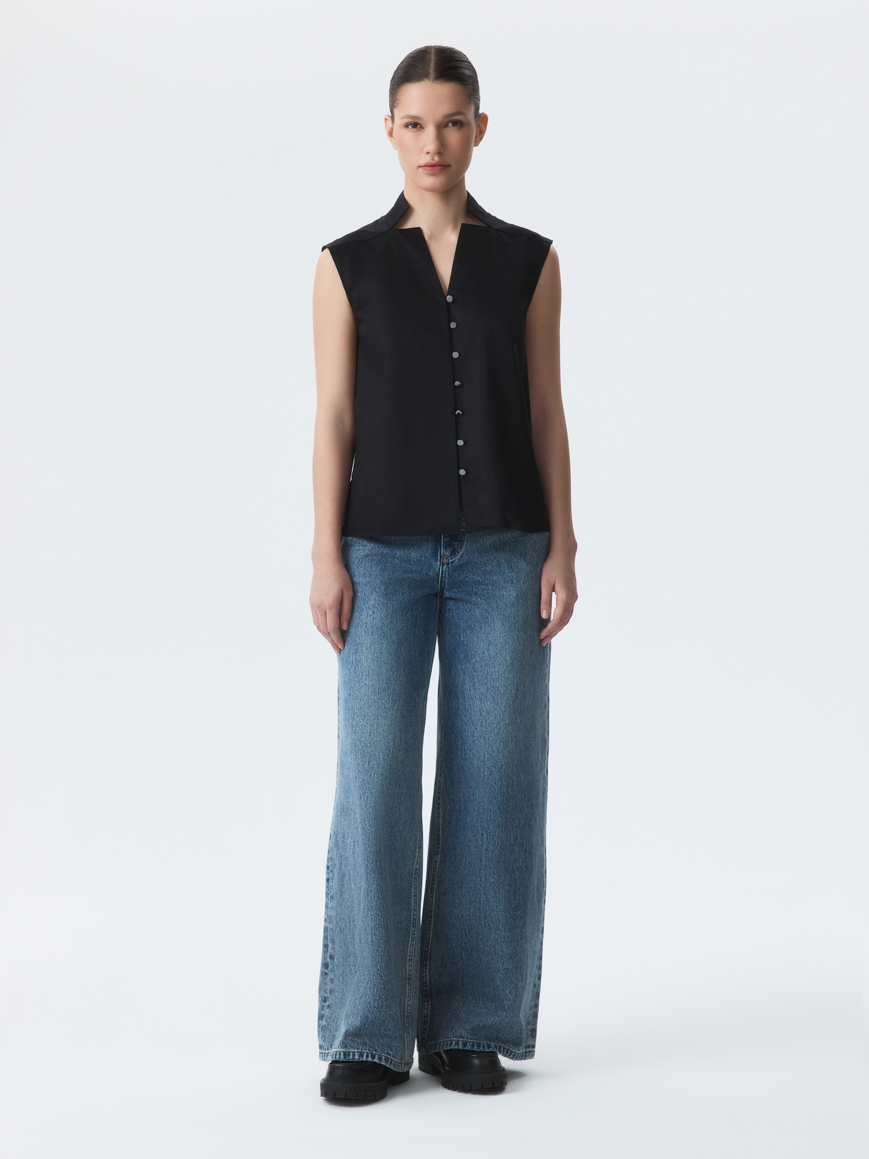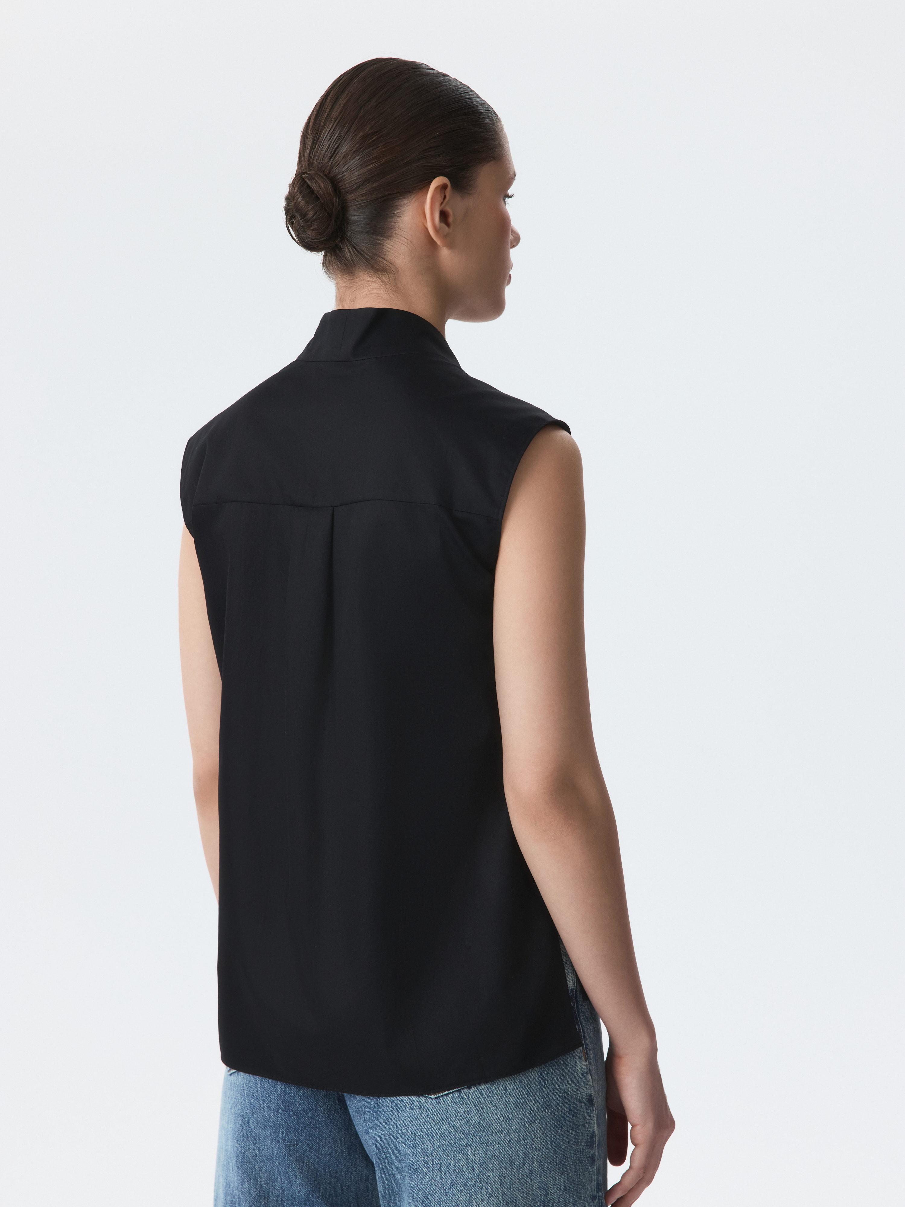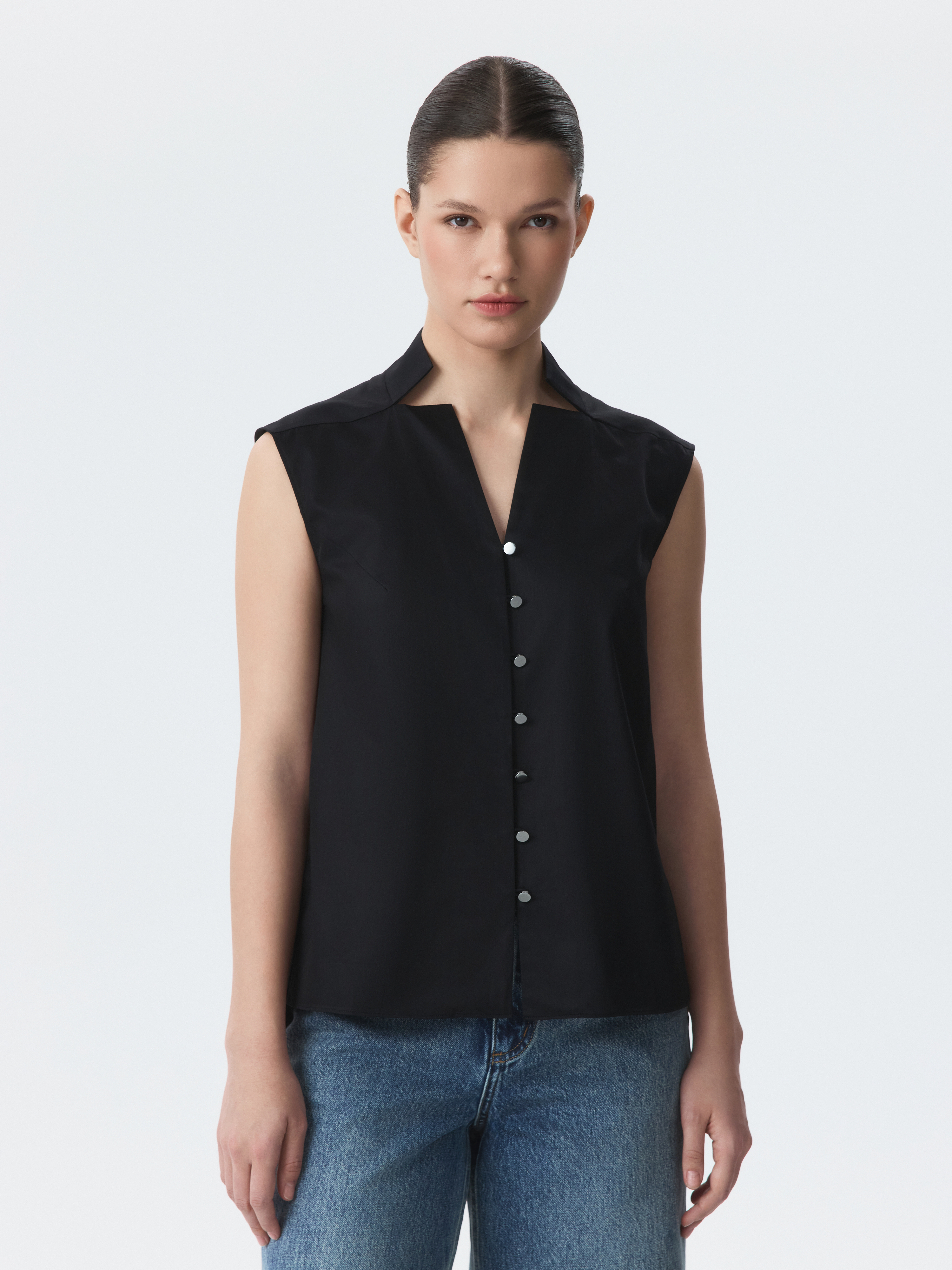 Прямая блуза с фигурным вырезом работает как с деловым гардеробом, так и с образами на каждый день. Тонкий гладкий текстиль из натурального хлопка с шелковистой на ощупь фактурой приятно касается тела и не просвечивает даже без подкладки.