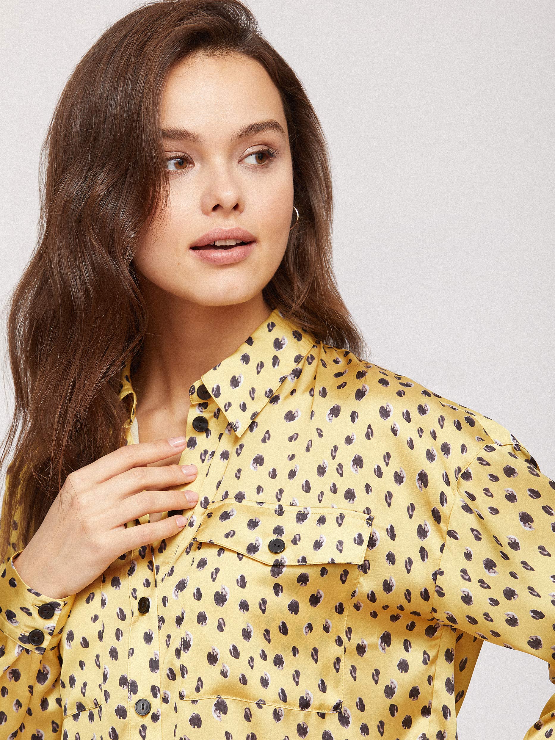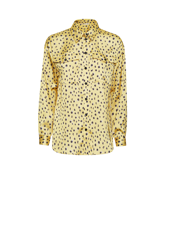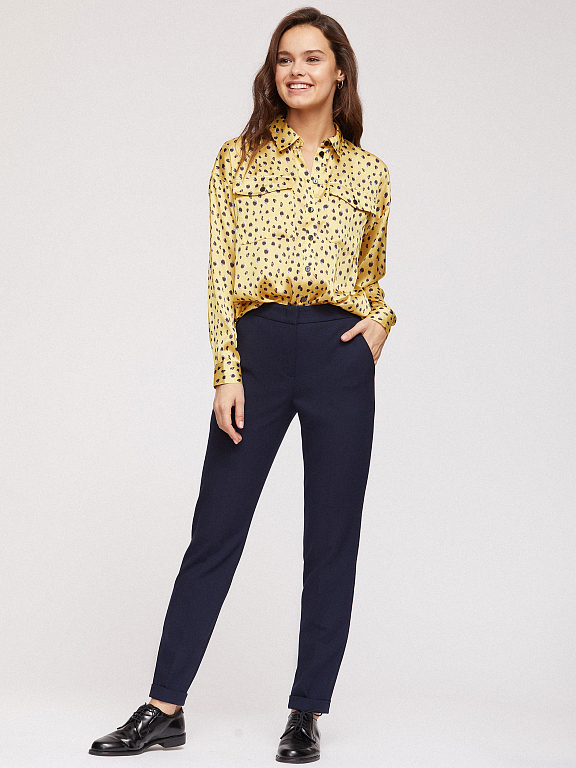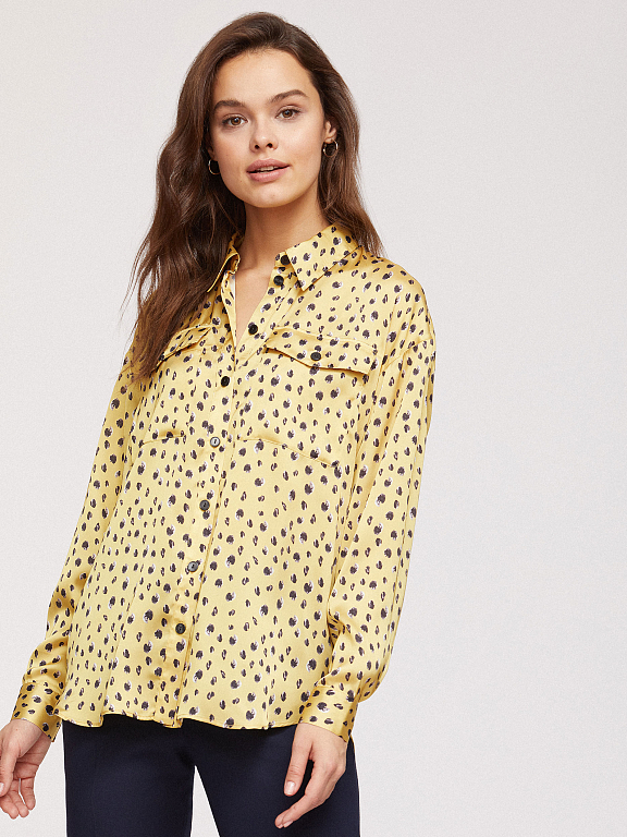 Блуза рубашечного кроя, выполненная из струящейся ткани. Отложной воротник, накладные нагрудные карманы с клапанами, длинные рукава с широкими манжетами на пуговицах, спущенная линия плеч.