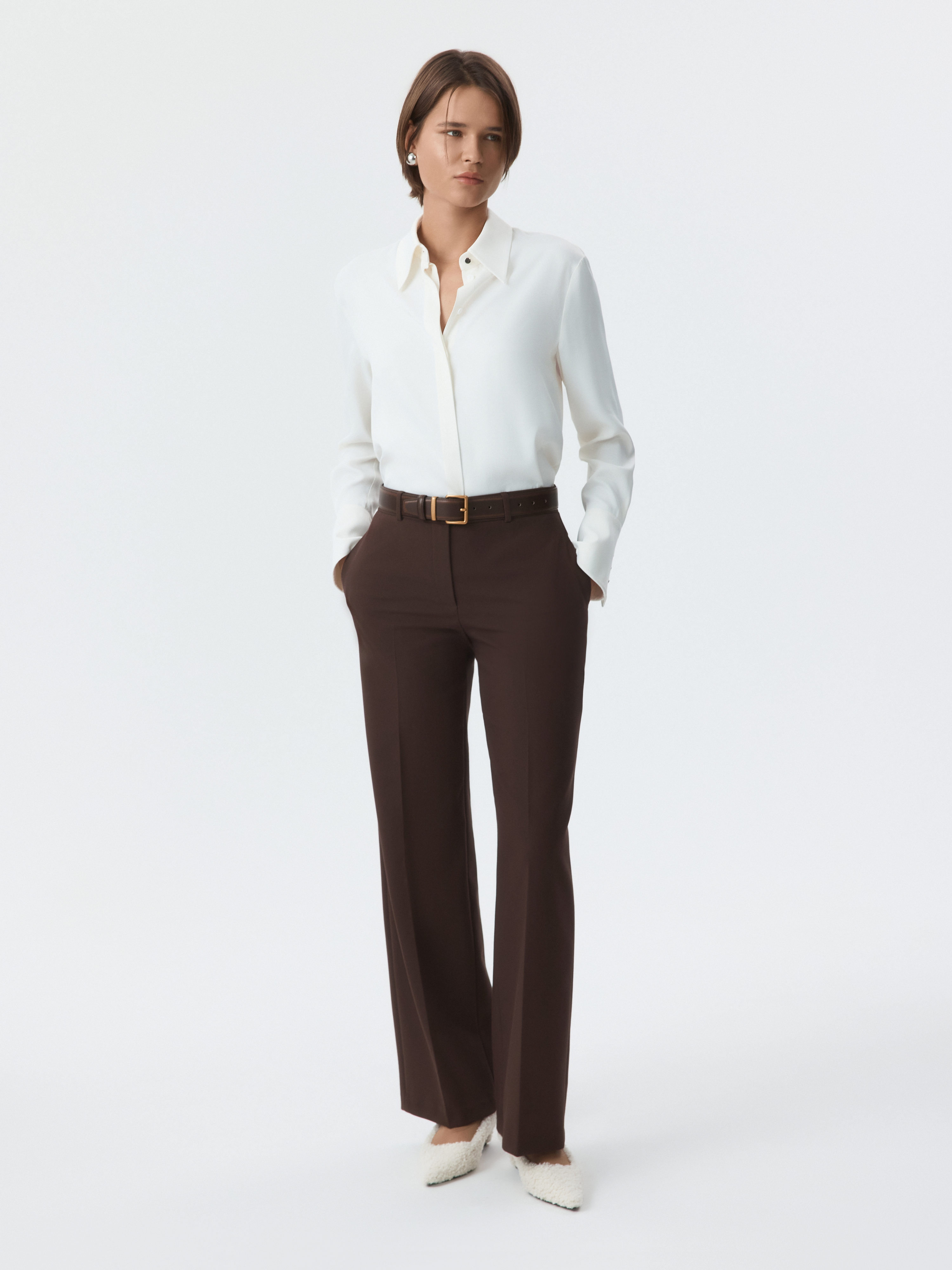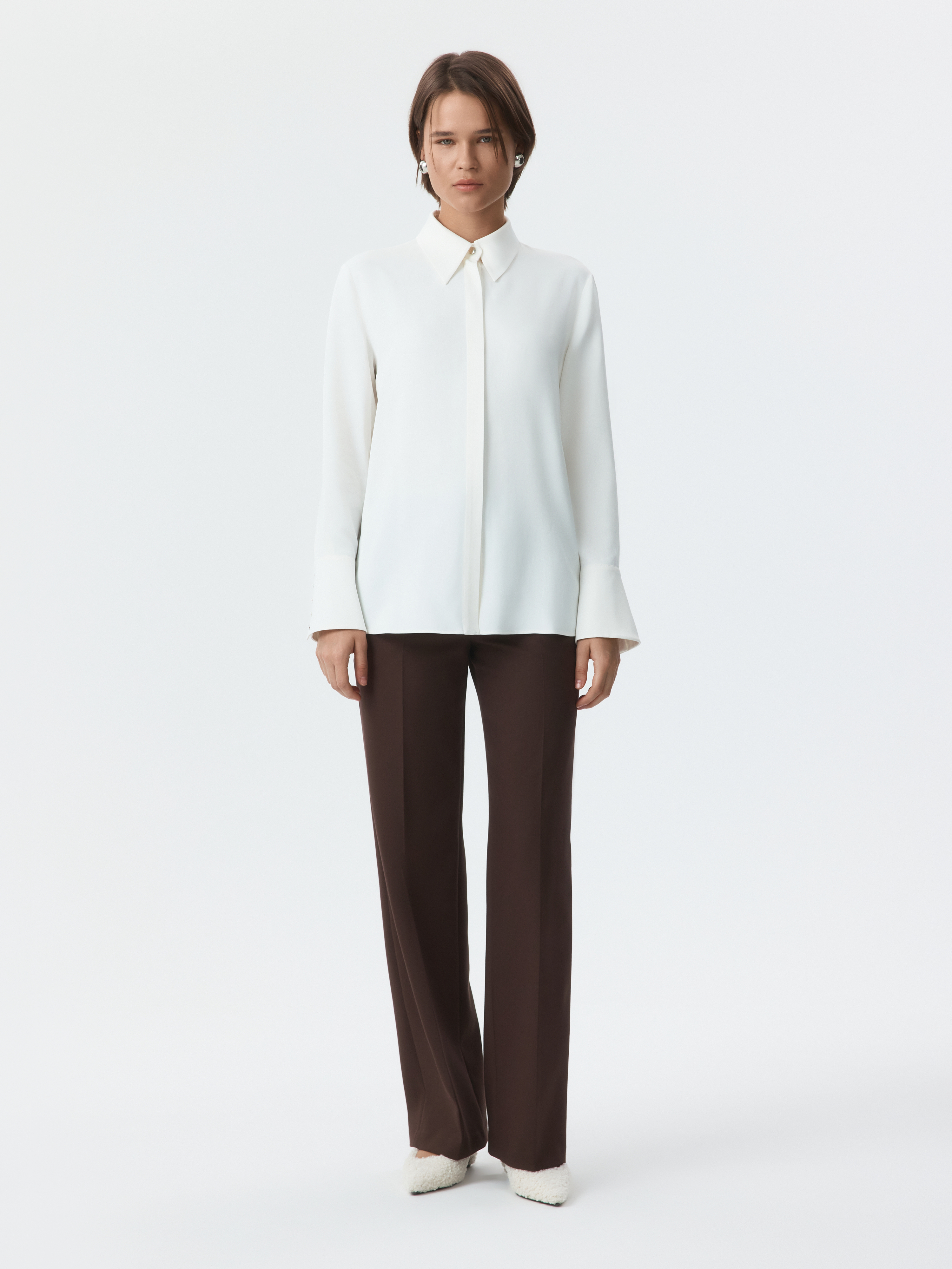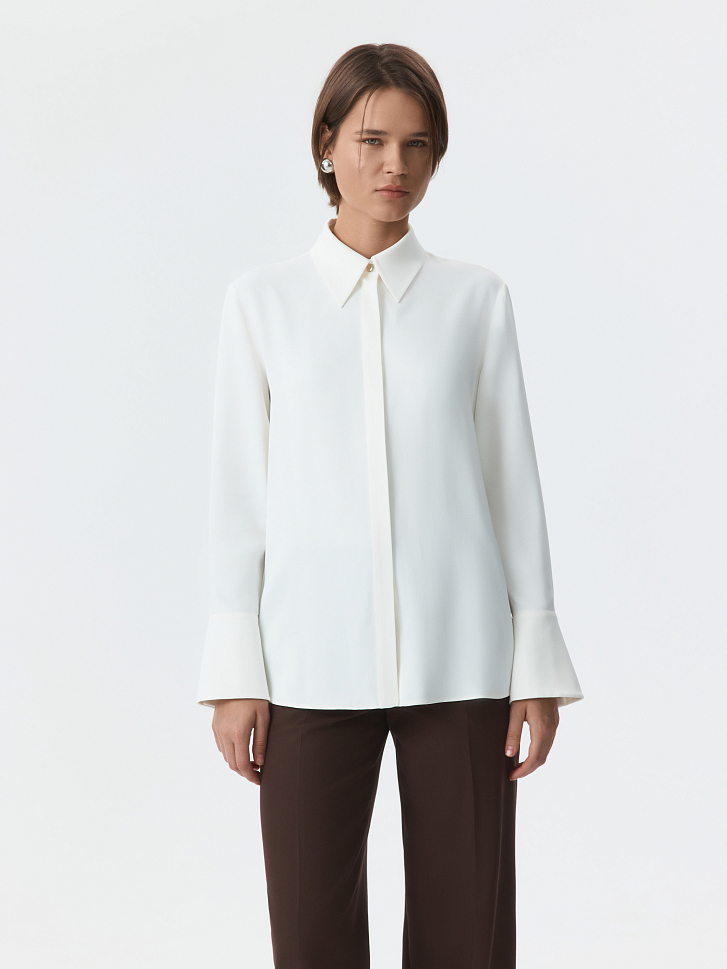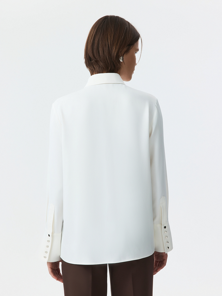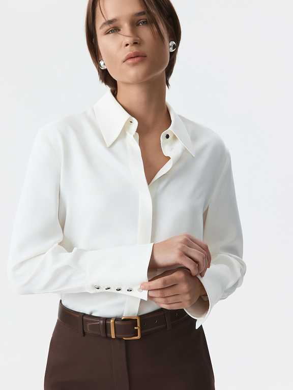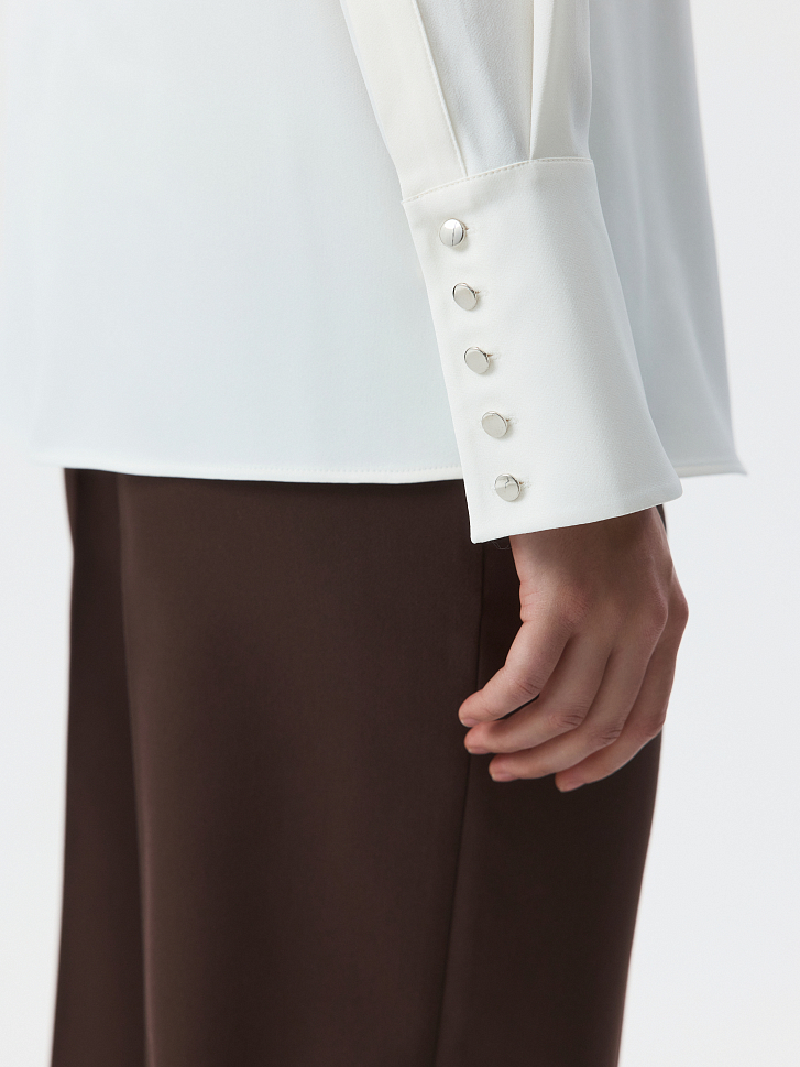 Атласная блуза создает утонченный и элегантный образ. Шелковистый текстиль с приятной на ощупь фактурой не просвечивает и комфортно прилегает к телу. Широкие манжеты с рядом металлических пуговиц придают акценты.