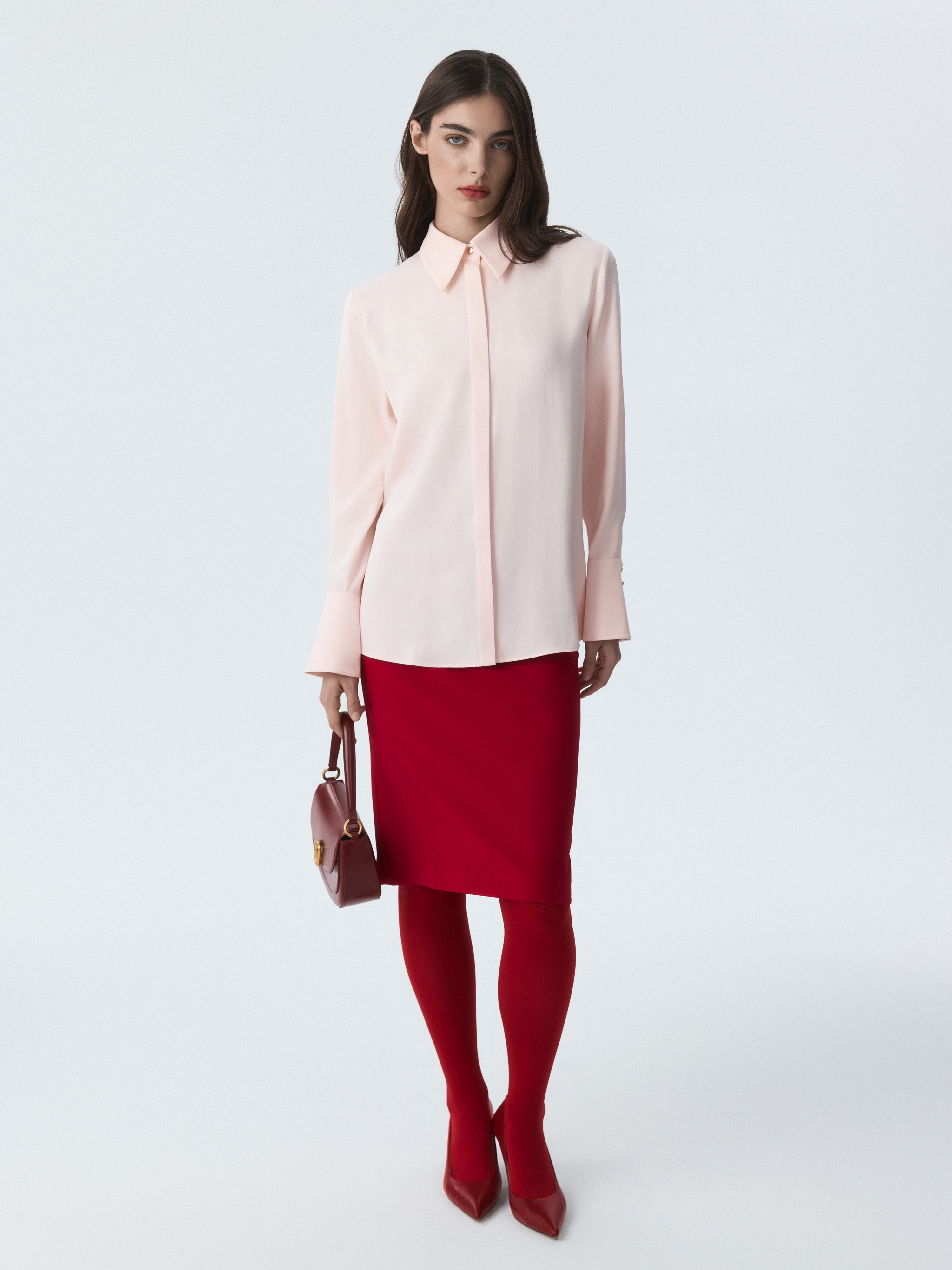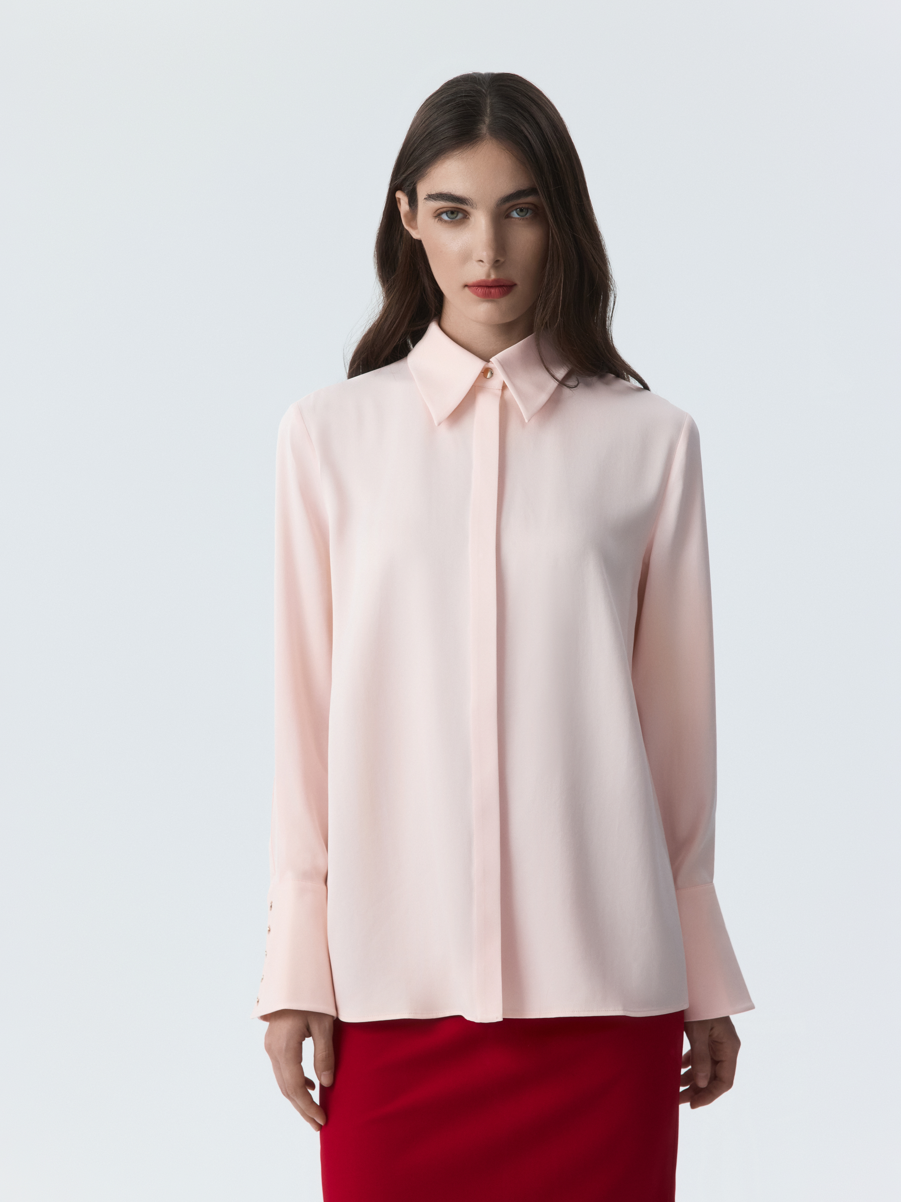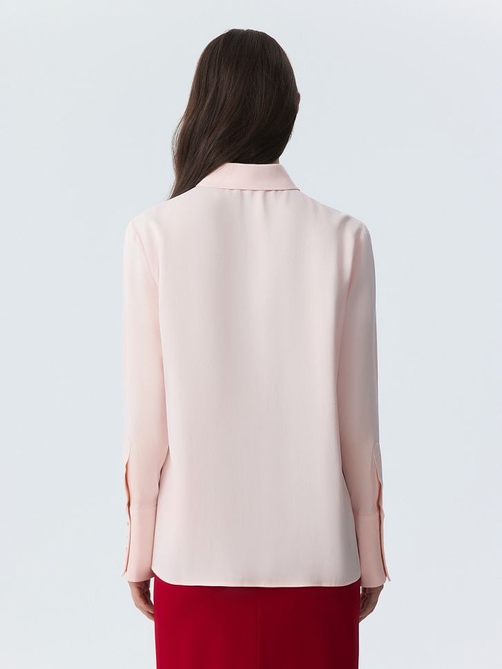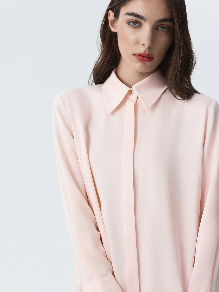 Атласная блуза создает утонченный и элегантный образ. Шелковистый текстиль с приятной на ощупь фактурой не просвечивает и комфортно прилегает к телу. Широкие манжеты с рядом металлических пуговиц придают акценты.