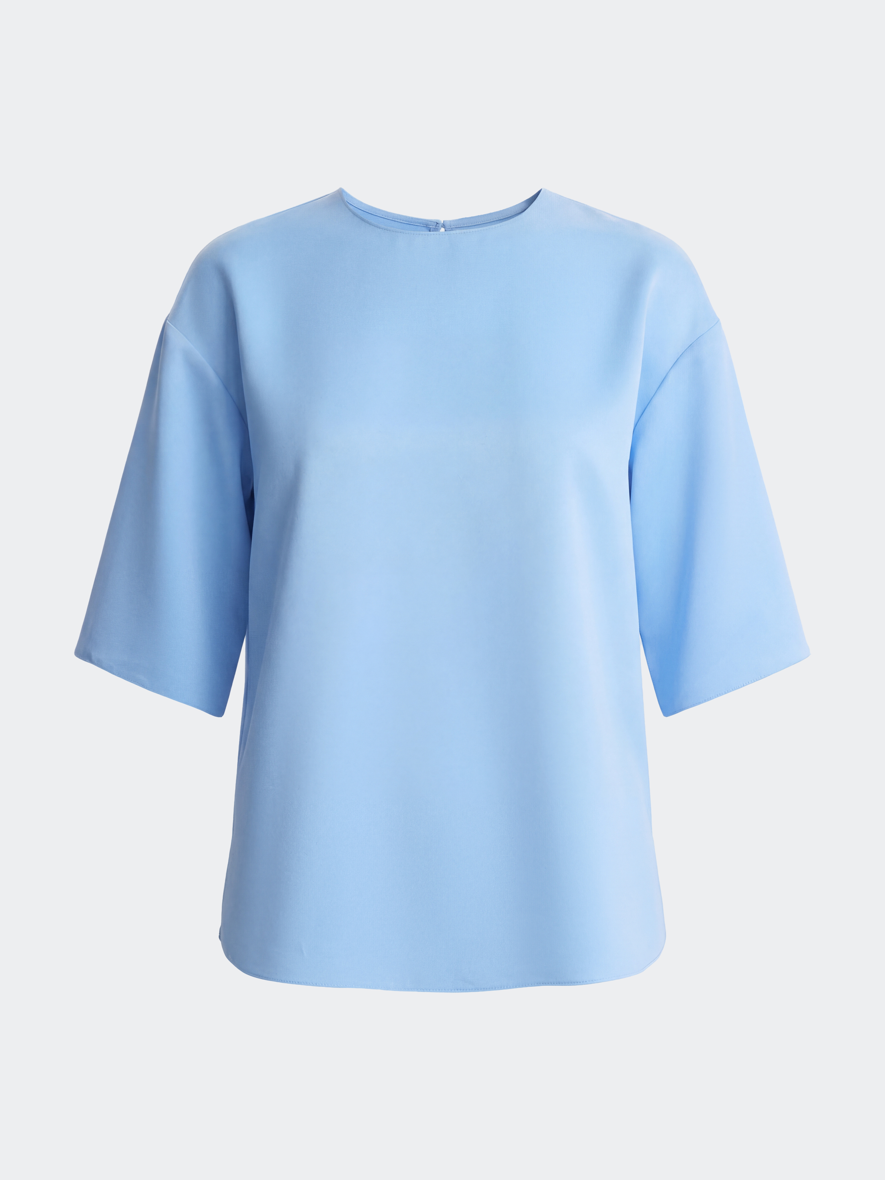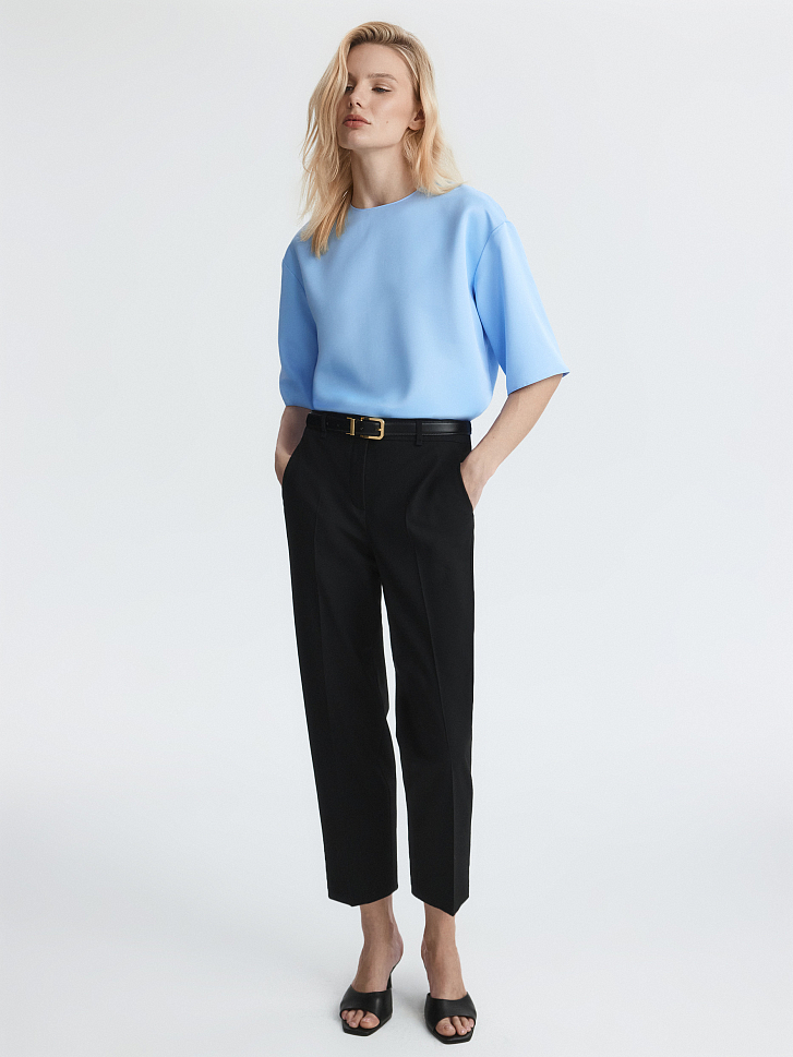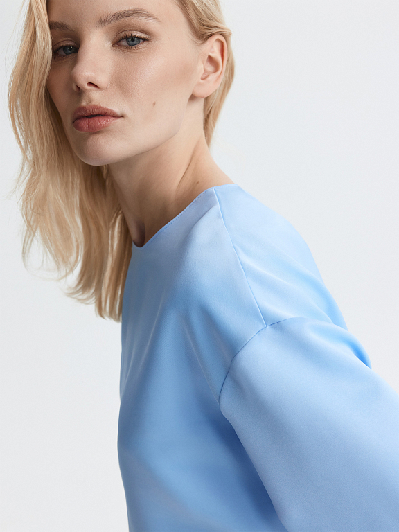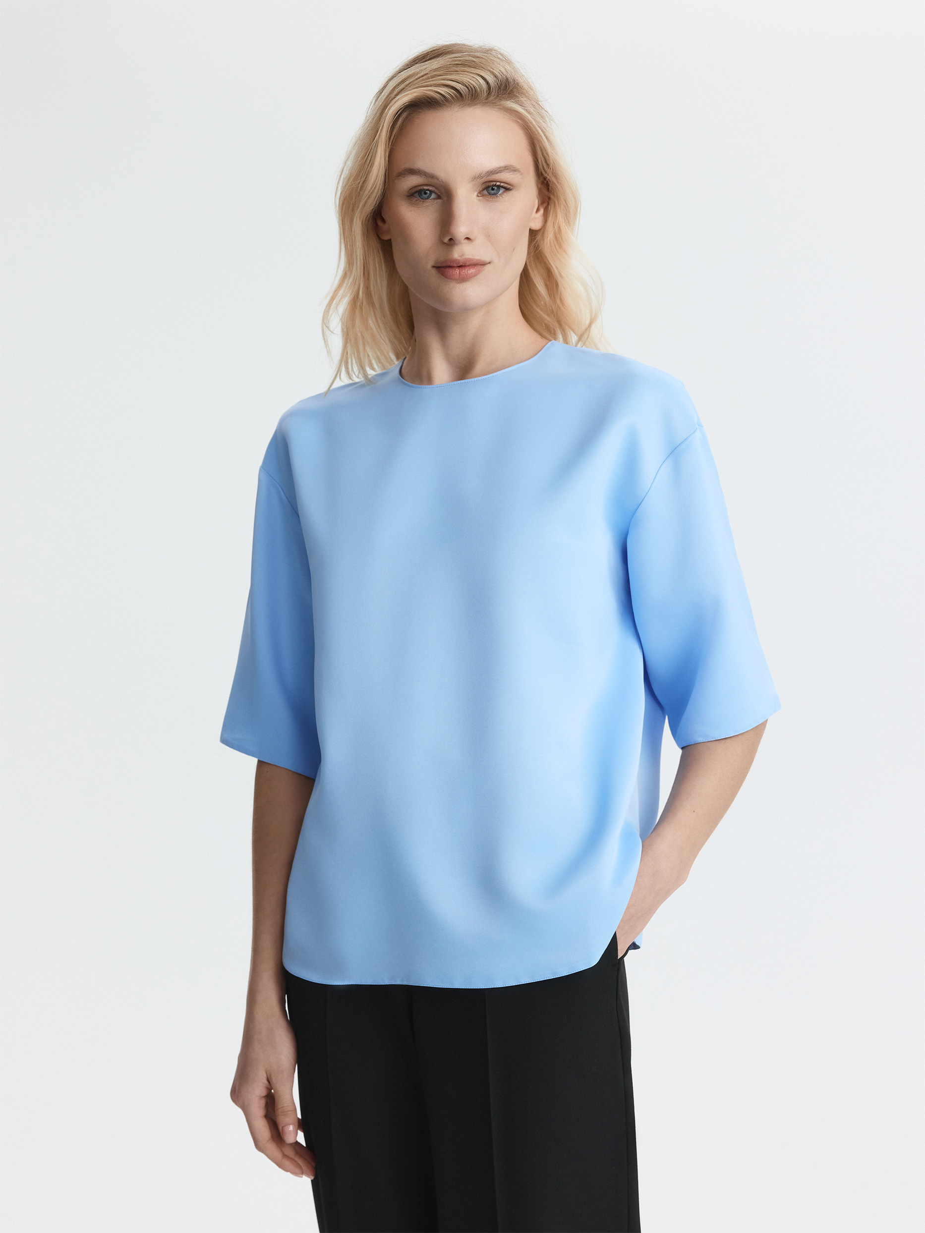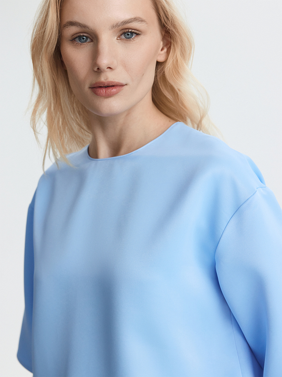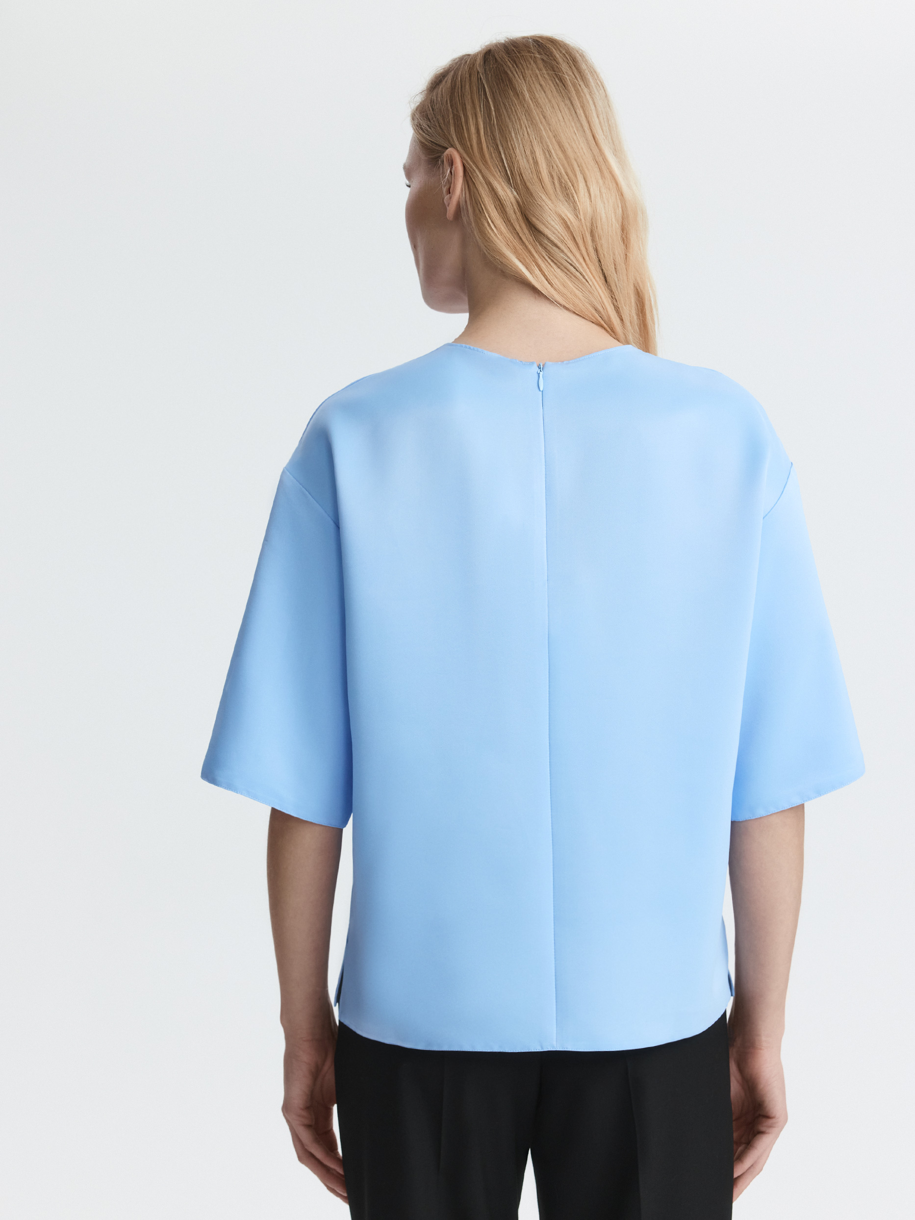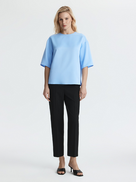 Прямая блуза с круглым вырезом и короткими рукавами сочетает удобство футболки и элегантность атласа. Плотный материал обладает шелковистым эффектом и износостойкостью, но менее прихотлив в уходе, в отличии от натурального шелка. Потайная молния и разрезы по бокам – функциональные детали.