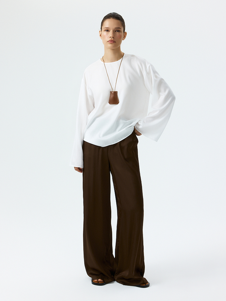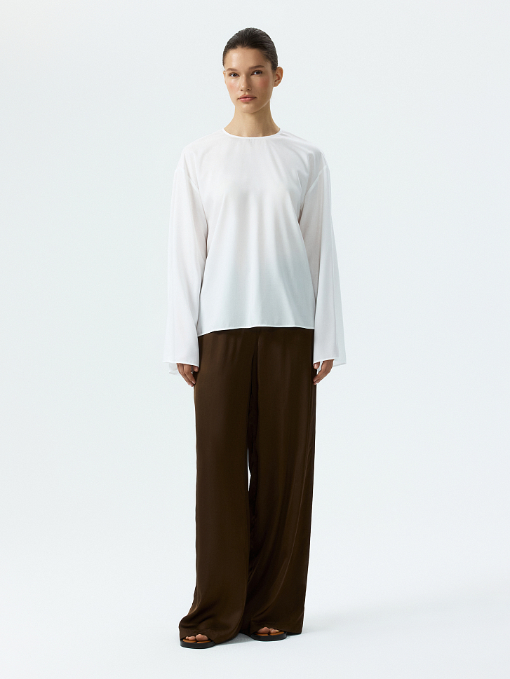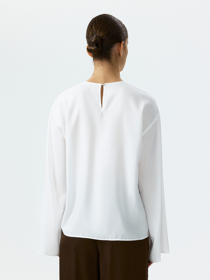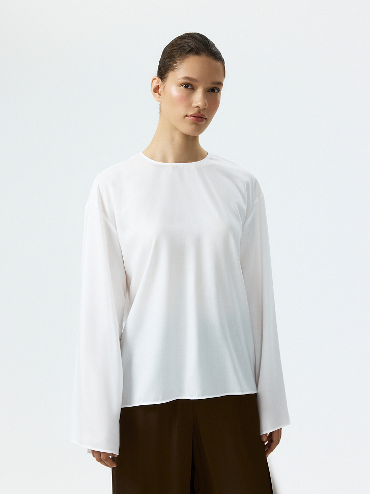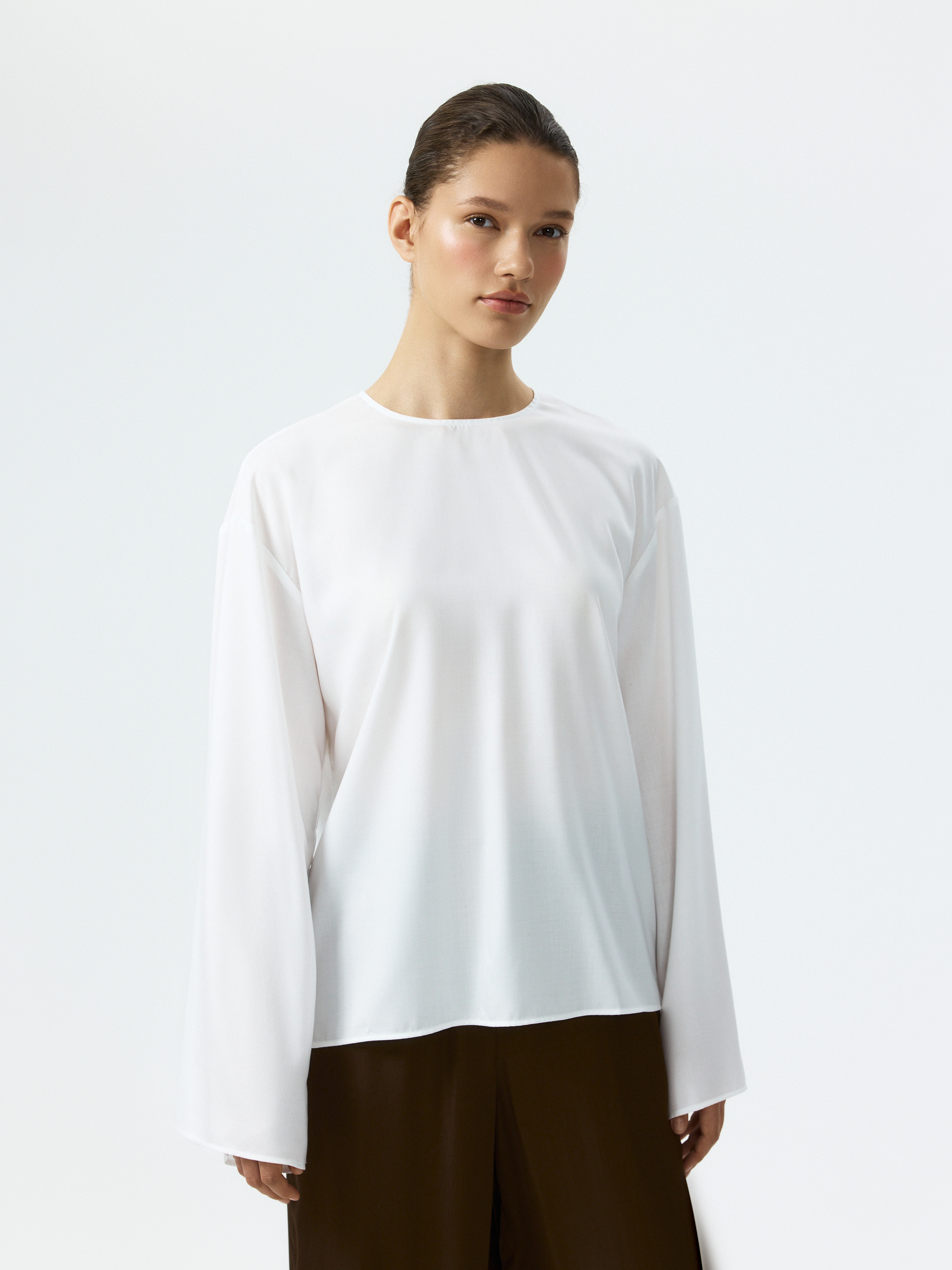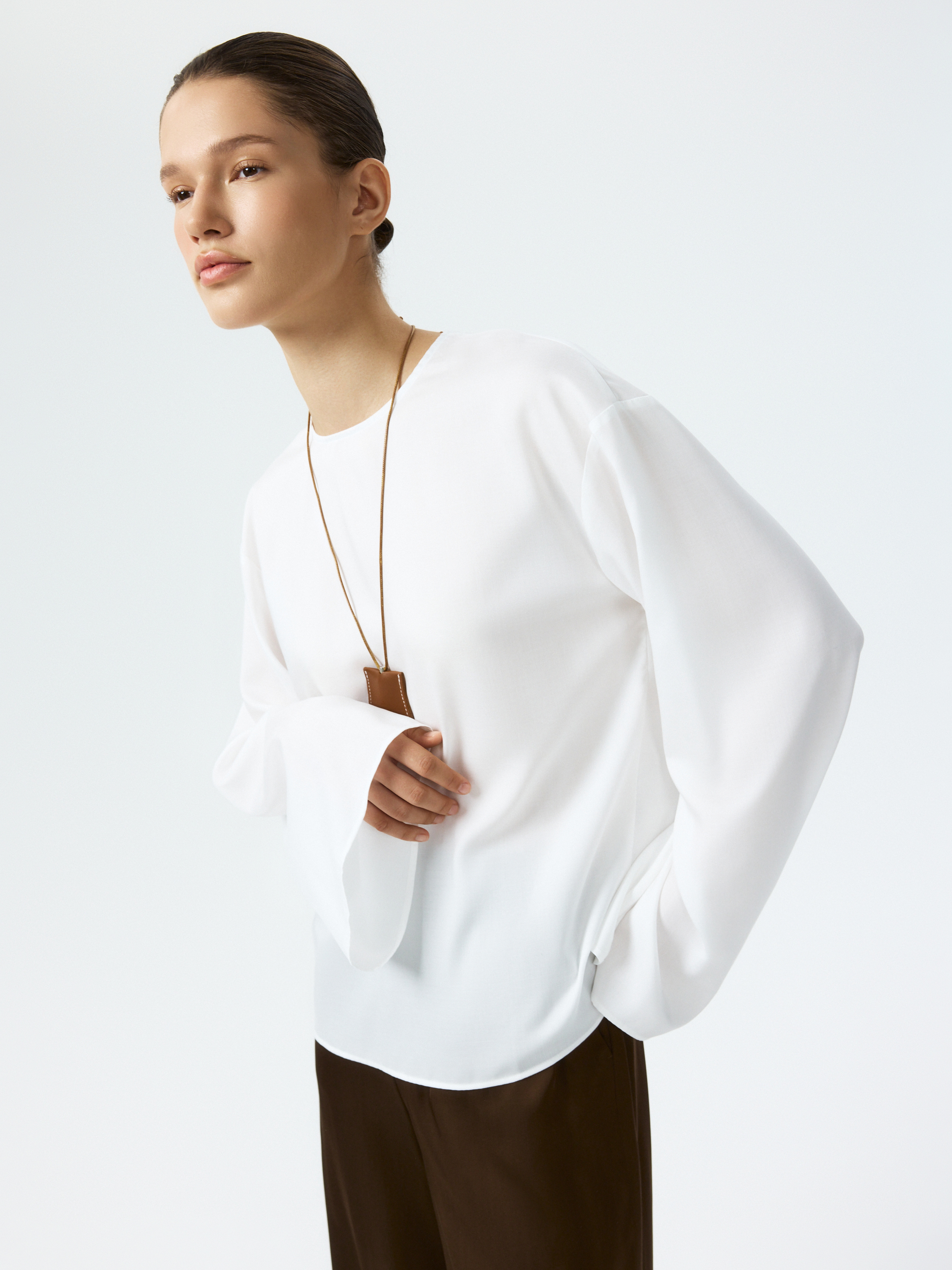 Лаконичная блуза с круглым вырезом – незаменимая вещь для любых планов. Легкий текстиль на основе лиоцелла (волокна целлюлозы) приятно ощущается на теле. Расслабленный крой со спущенной линией плеча подчеркивает плавность линий, обеспечивая комфорт при движении.