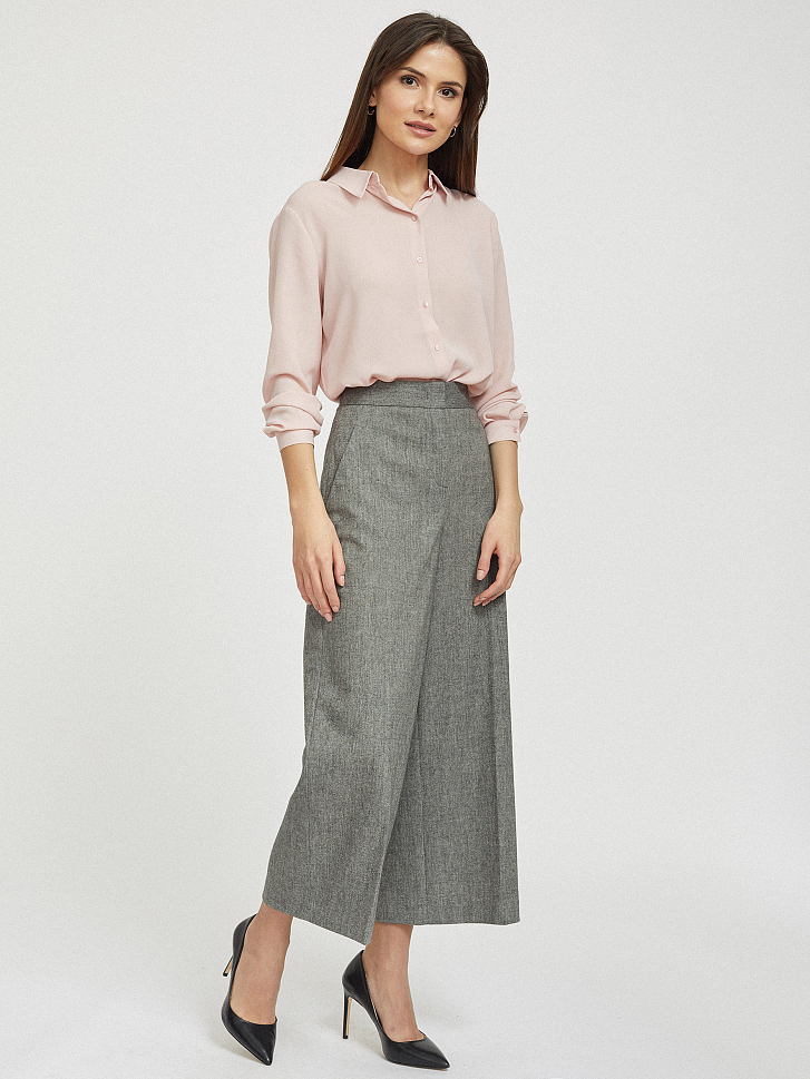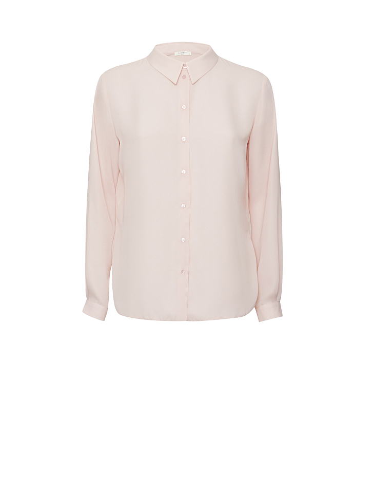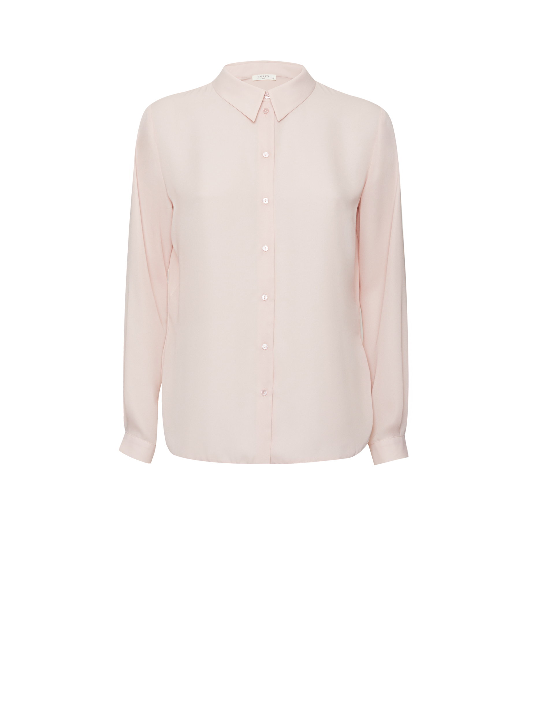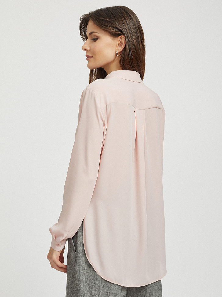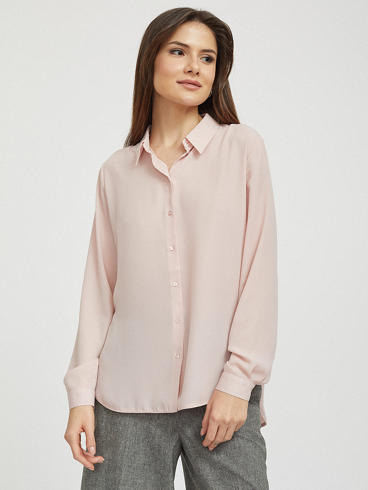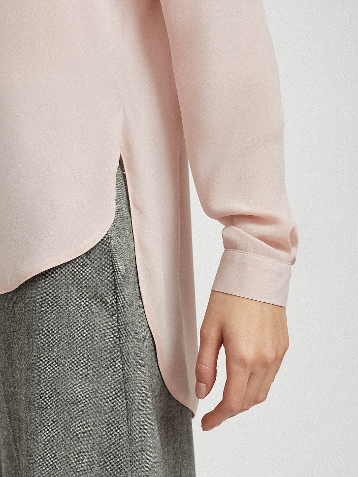 Однотонная рубашка из струящейся ткани. Классический отложной воротник, объемные рукава с манжетами, асимметричный нижний край с разрезами по бокам.