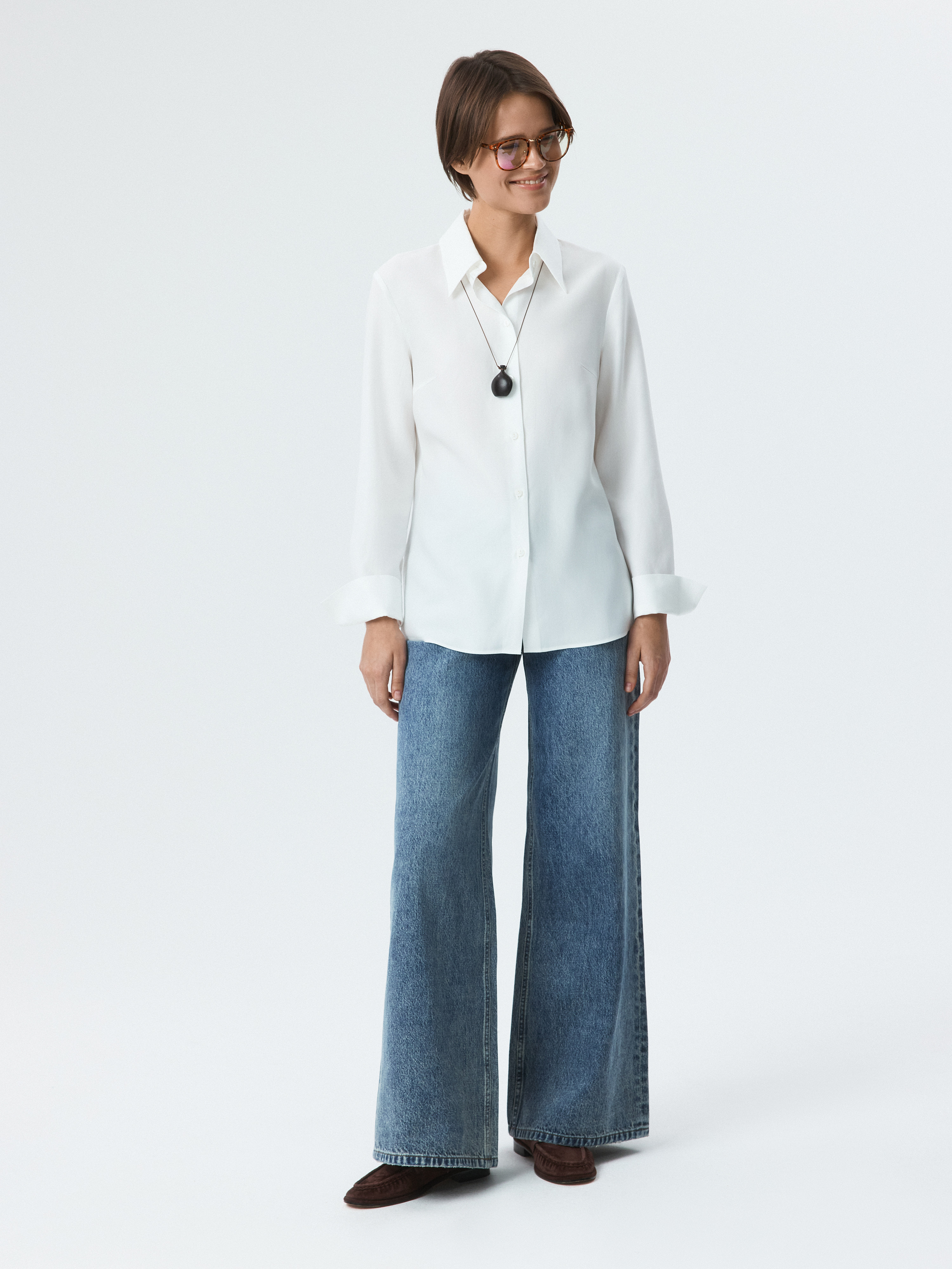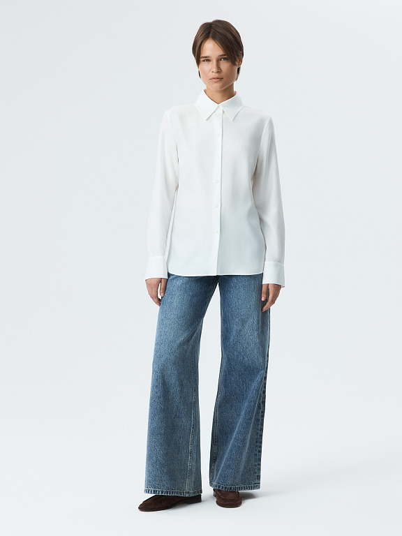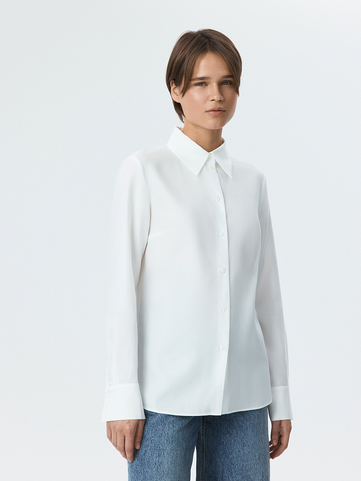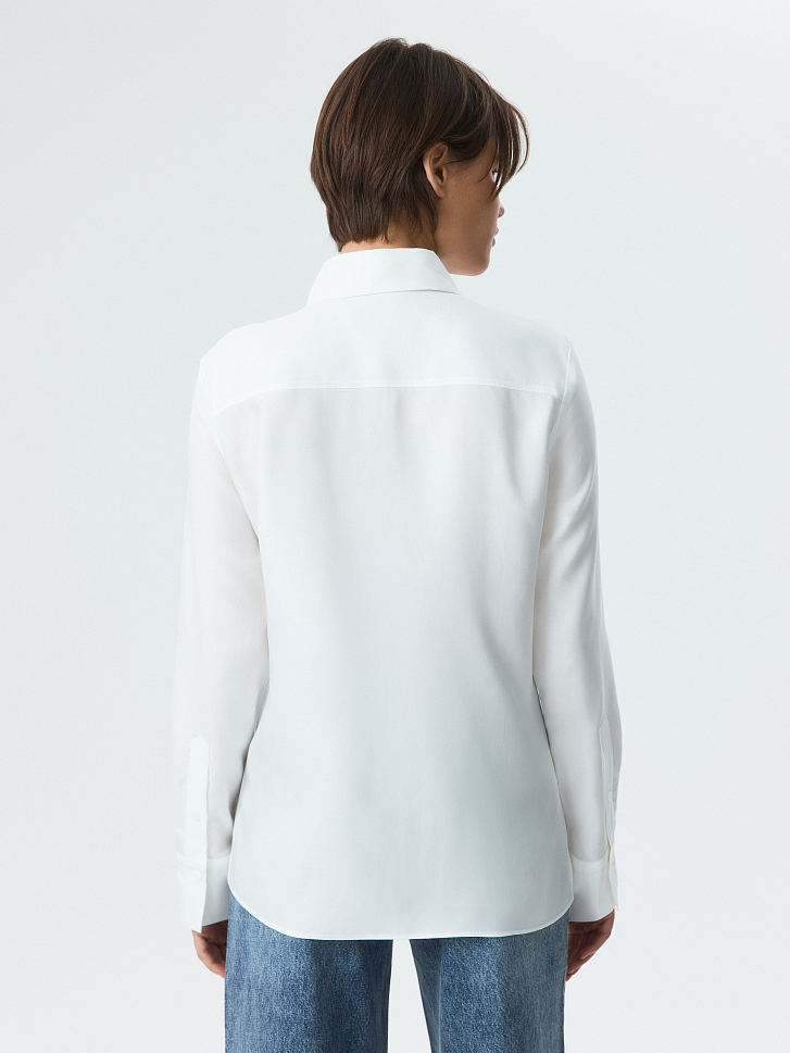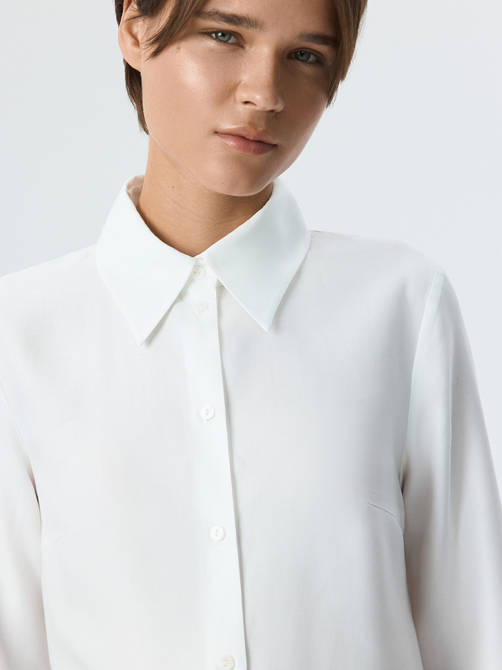 Блуза прямого кроя станет универсальным элементом гардероба, которая придаст образу собранность в расслабленной манере. Модель прямого кроя сшили из тонкого текстиля на основе волокон целлюлозы, который очень легкий и дышащий.
