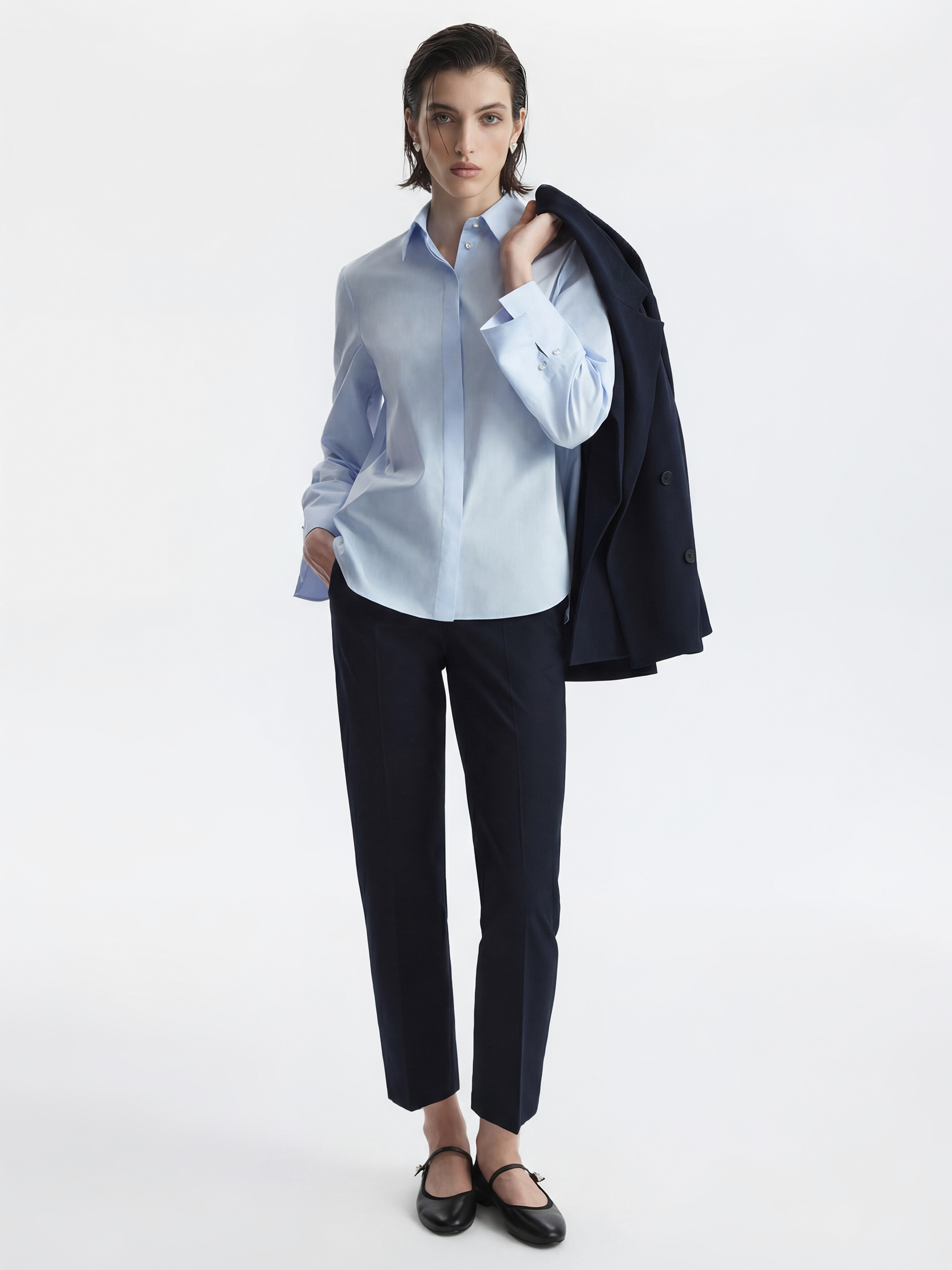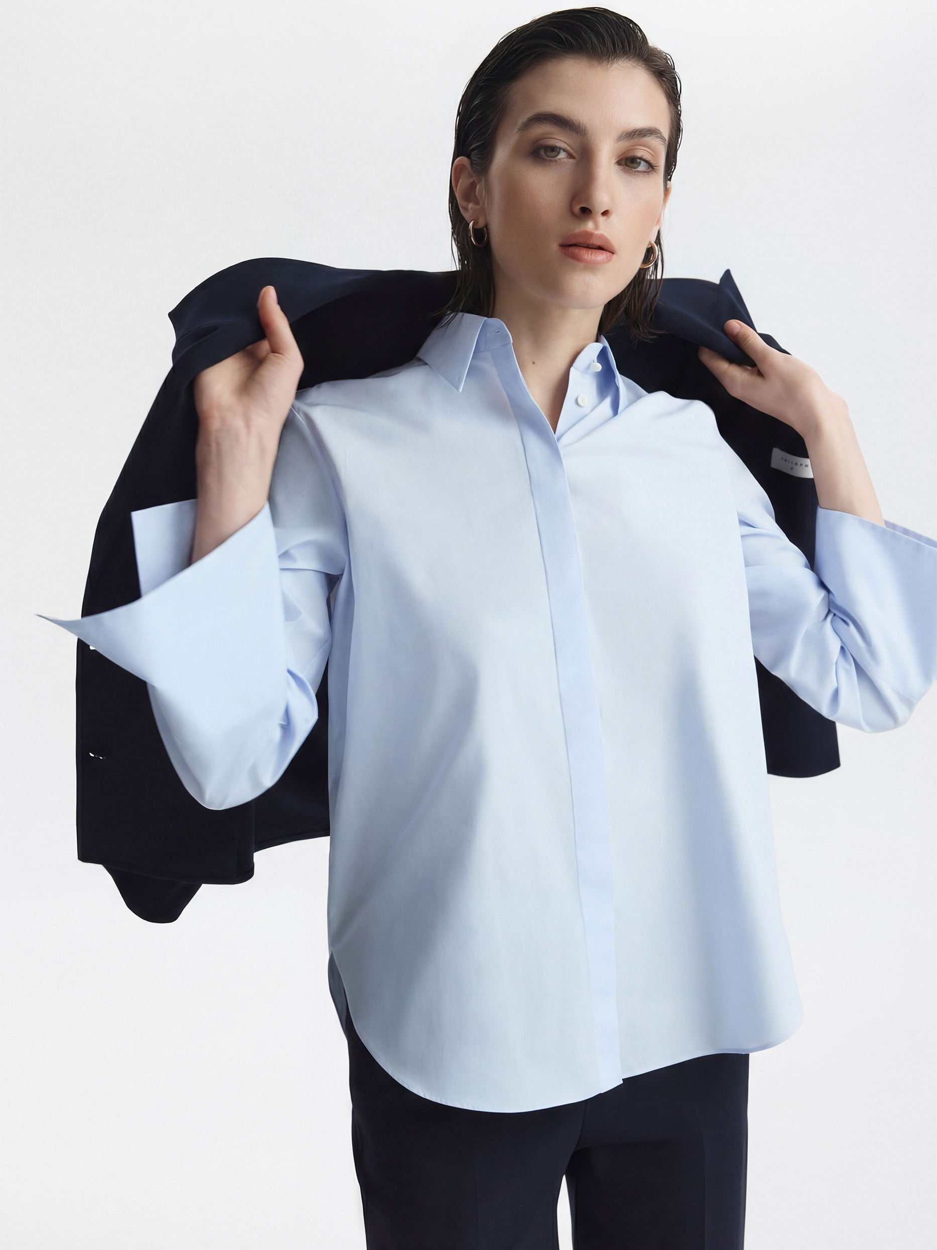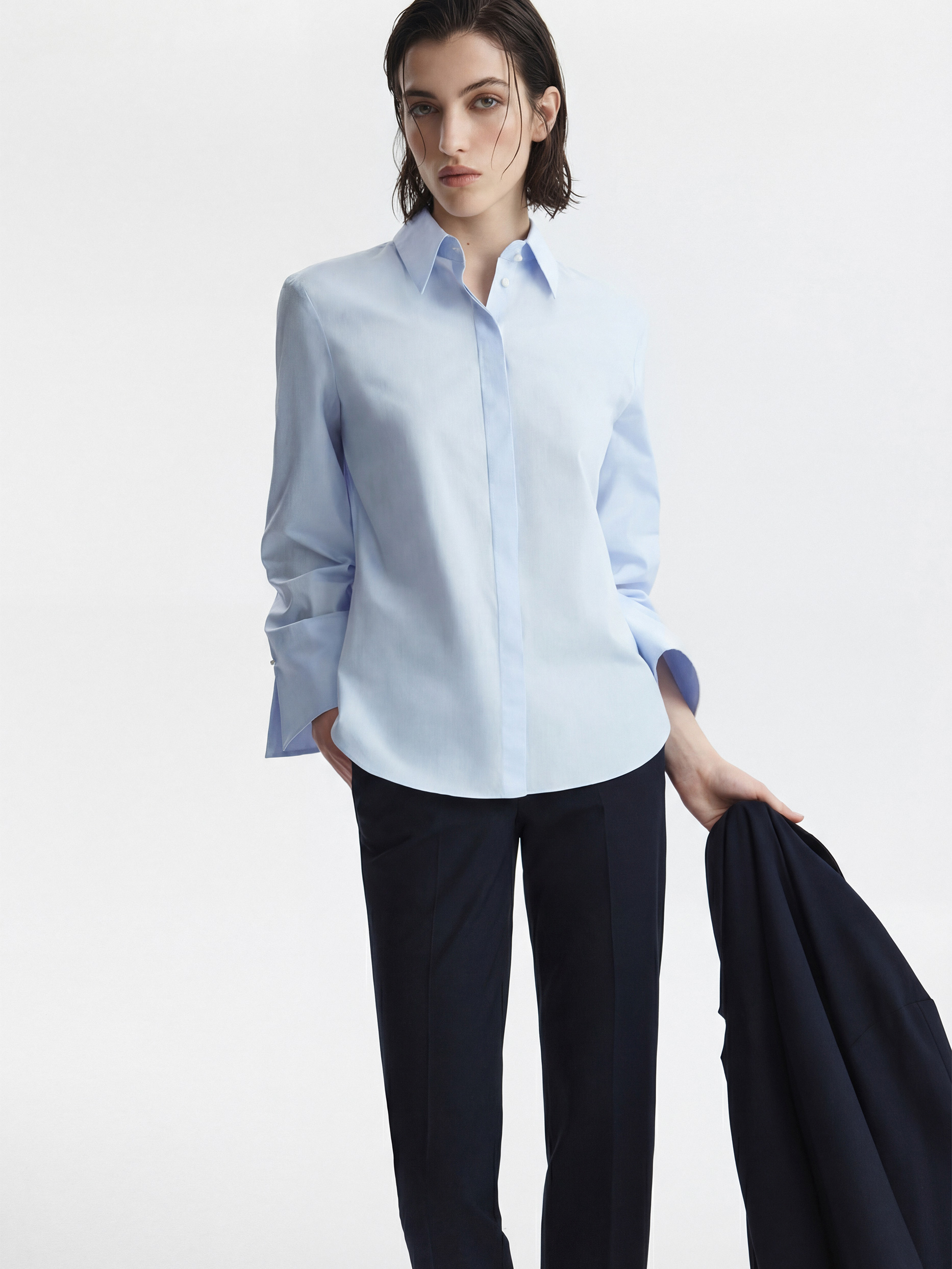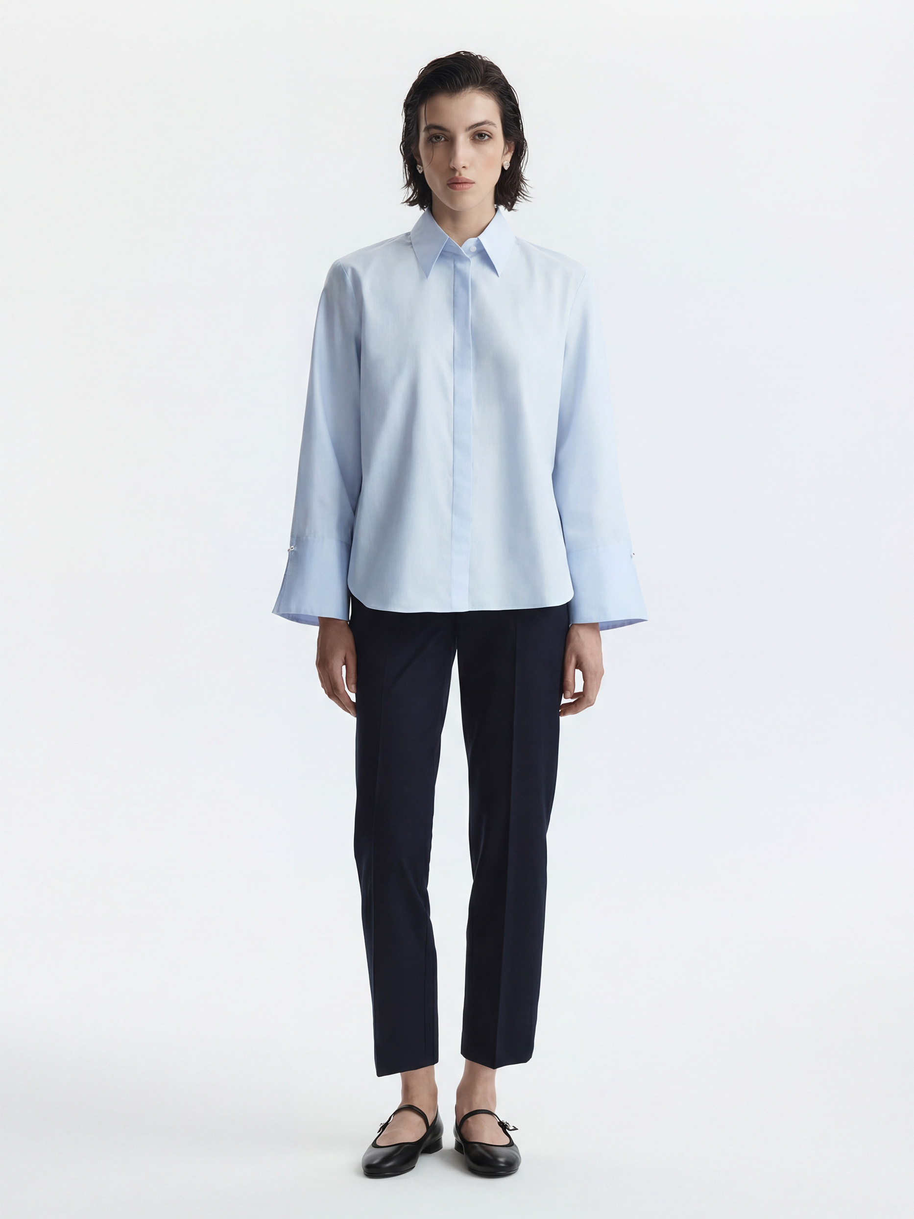 Лаконичная и универсальная рубашка составит офисную базу с брюками или более расслабленные образы с денимом. Тонкий поплин из натурального хлопка обладает дышащими свойствами и дарит комфорт. Расклешенные манжеты с разрезами украшены запонками, которые играют роль декора.