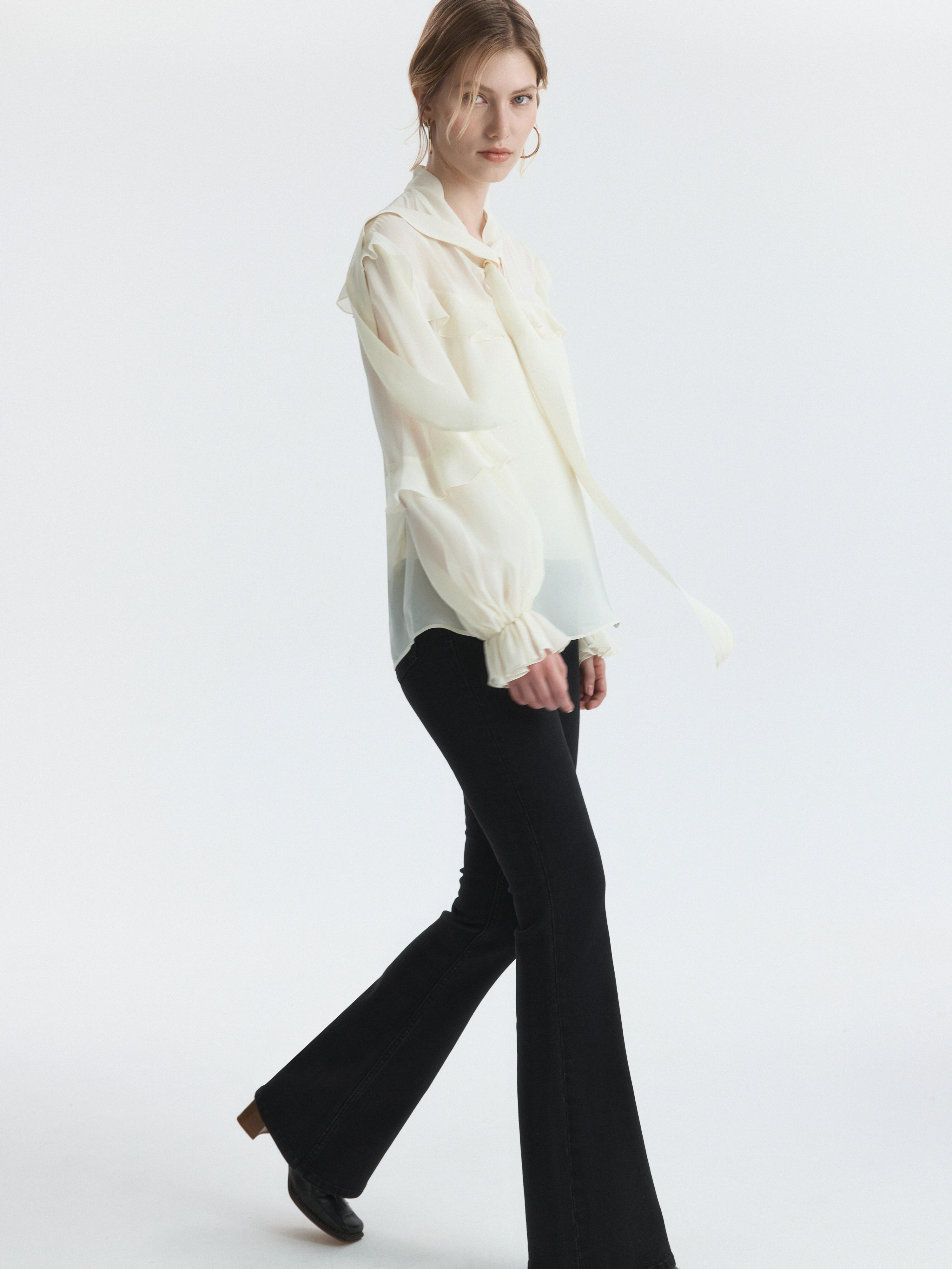 Воздушная блуза с воланами сделает образ заметным и выразительным. Легкий шифон струится вдоль тела, а чтобы изделие не просвечивало, снизу добавили текстильный топ из вискозы. Ленты на воротнике можно завязать на бант.