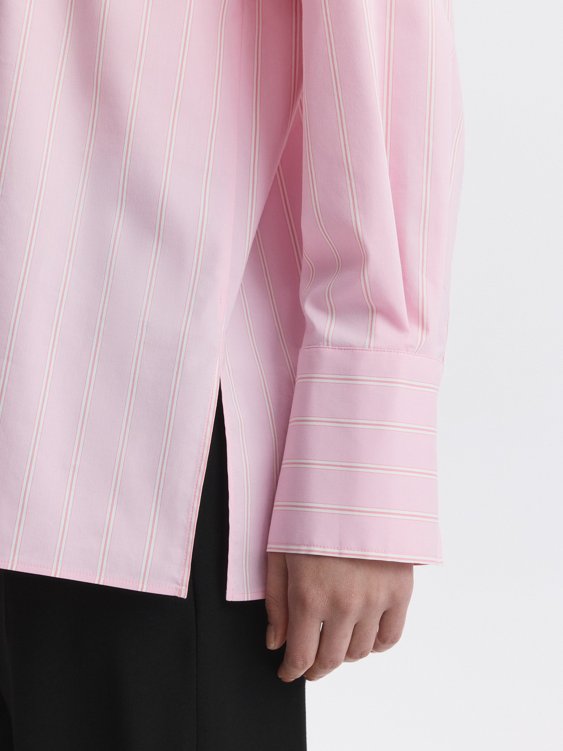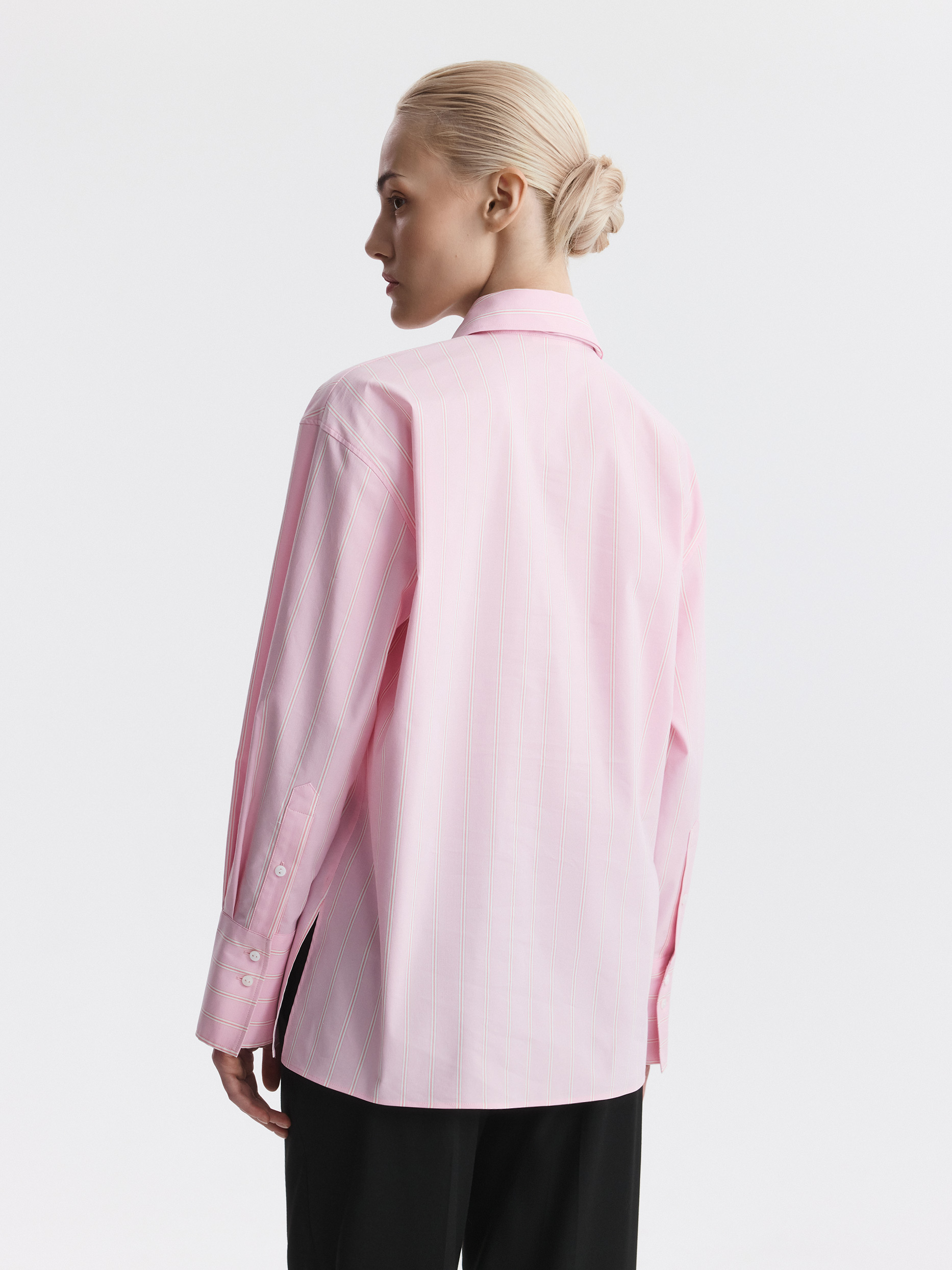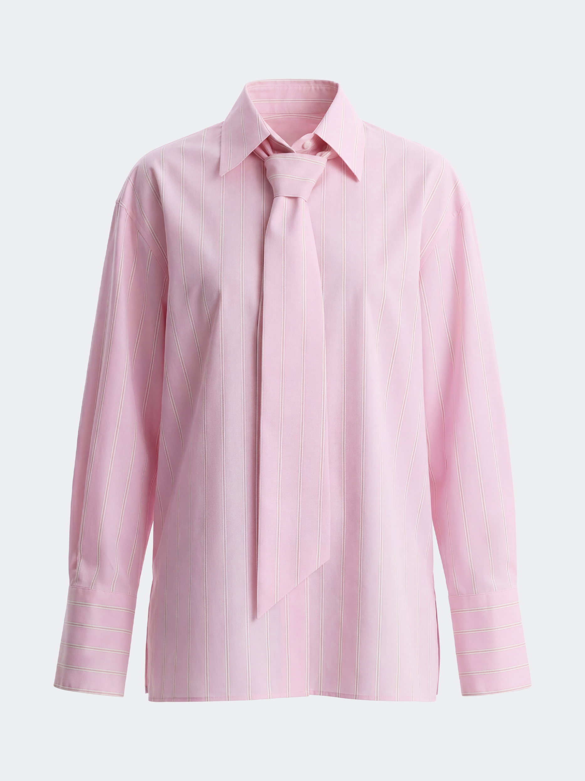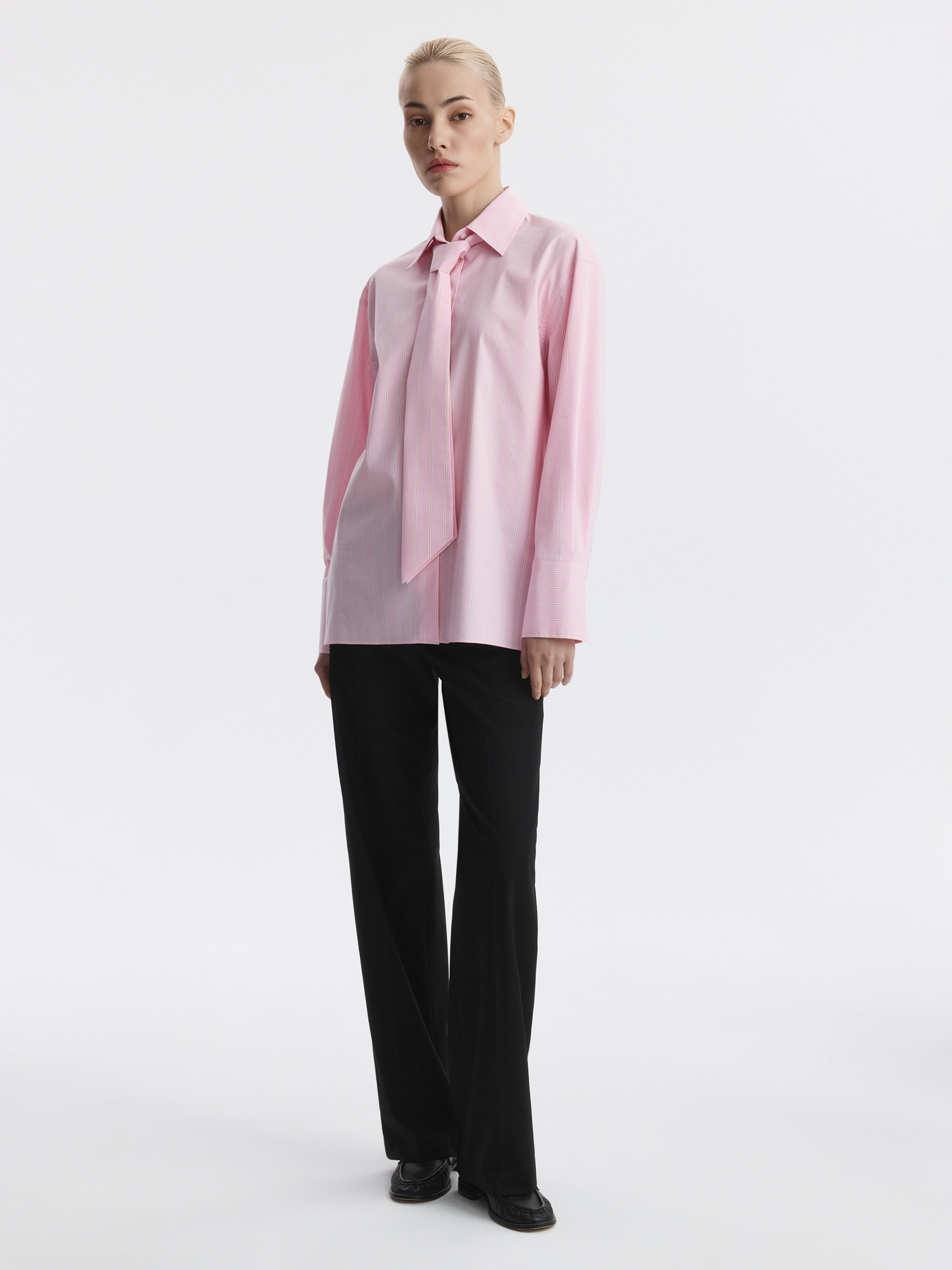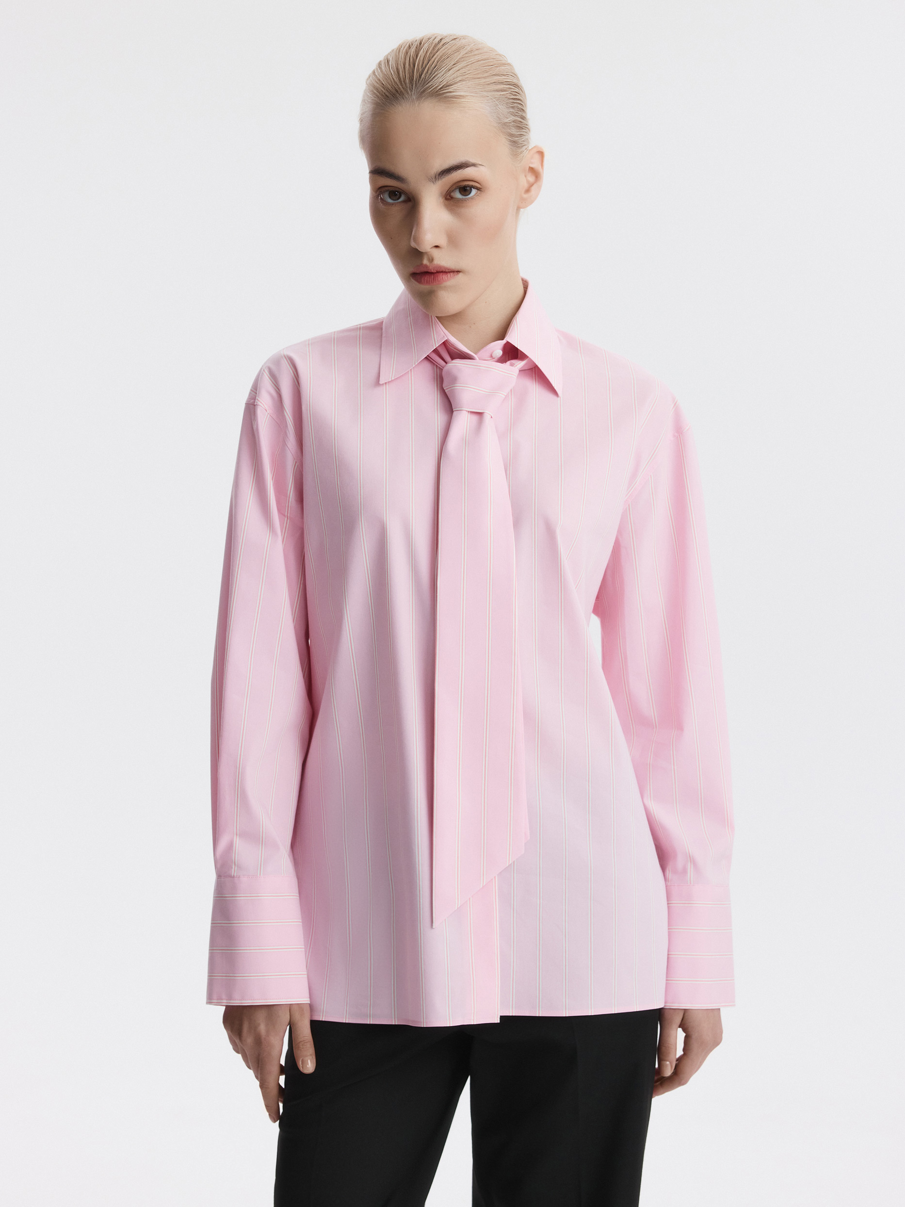 Рубашка в полоску с галстуком добавит деловым образам выразительности. Тонкий гладкий текстиль на основе хлопка хорошо пропускает воздух, обеспечивая комфорт в жаркий день, и при этом не просвечивает. Модель расслабленно сидит по фигуре и не сковывает движения.